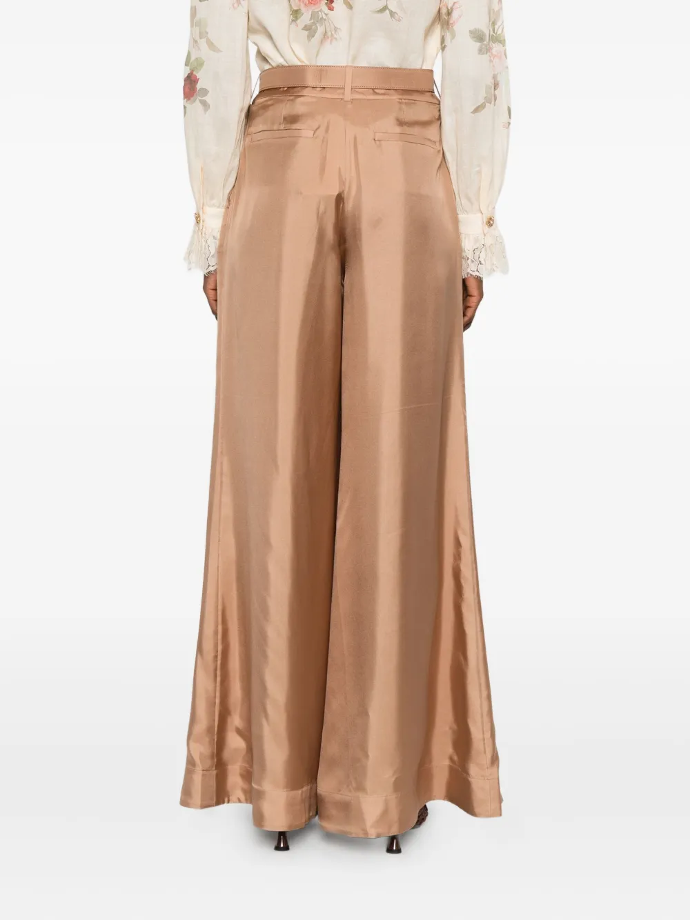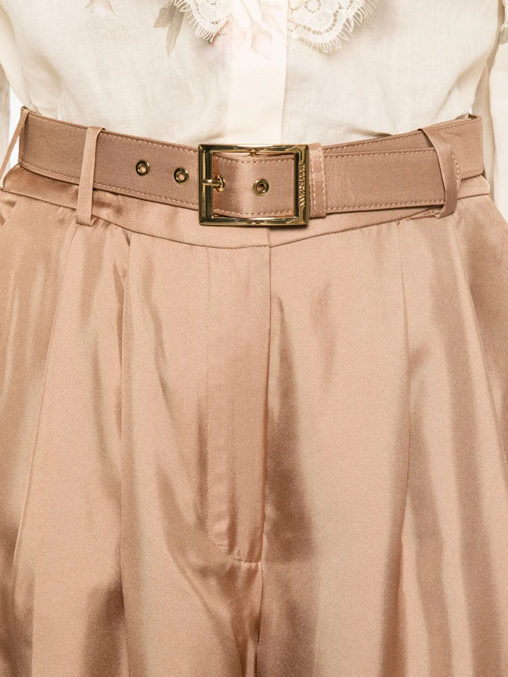 Pantaloni Zimmermann Pleated Belted maro, cu inchidere clasica, buzunare laterale, buzunare tip welt la spate, curea din matase in jurul taliei si tiv drept. Potriviti pentru sezonul tomna/iarna. 75% viscoza; 25% matase; 100% silk.