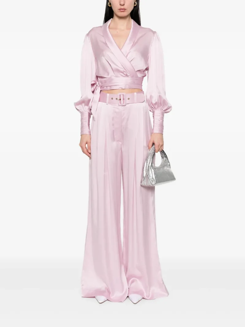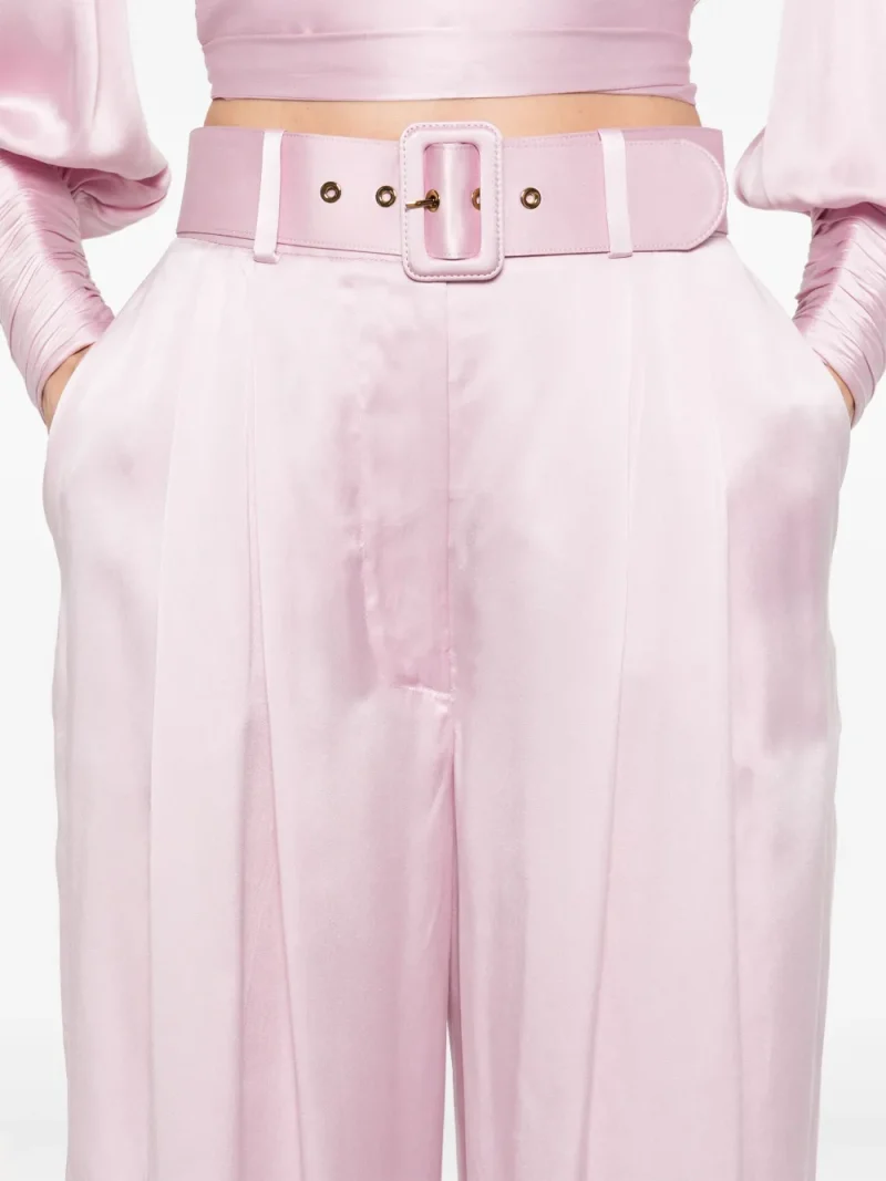 Pantaloni Zimmermann Silk Tuck roz, din matase, cu talie inalta, inchidere clasica, buzunare laterale, curea lata din matase in jurul taliei, croiala larga si tiv drept. Potrivit pentru sezonul primavara/vara. 100% matase.
