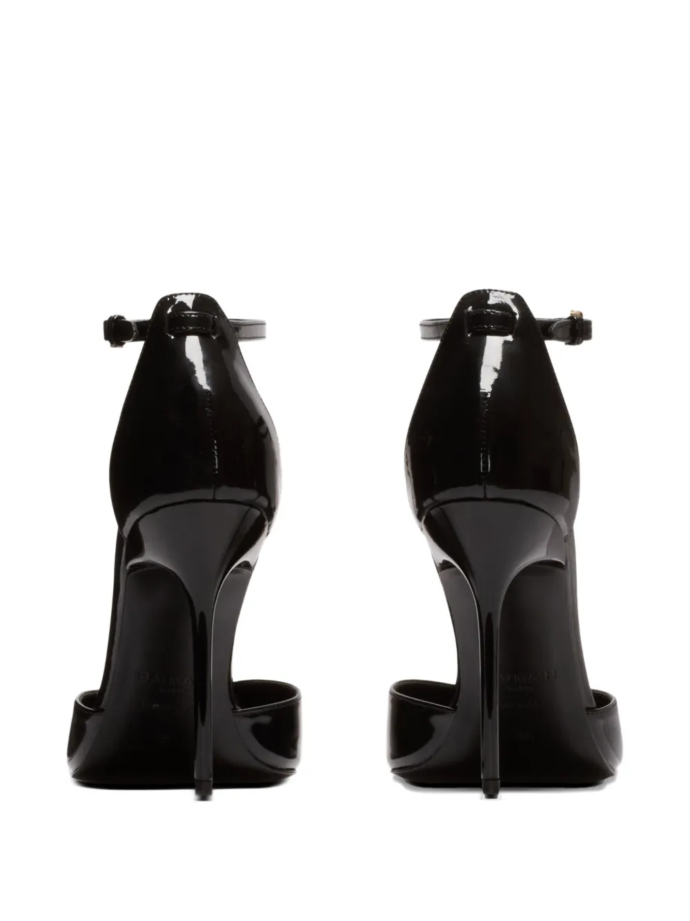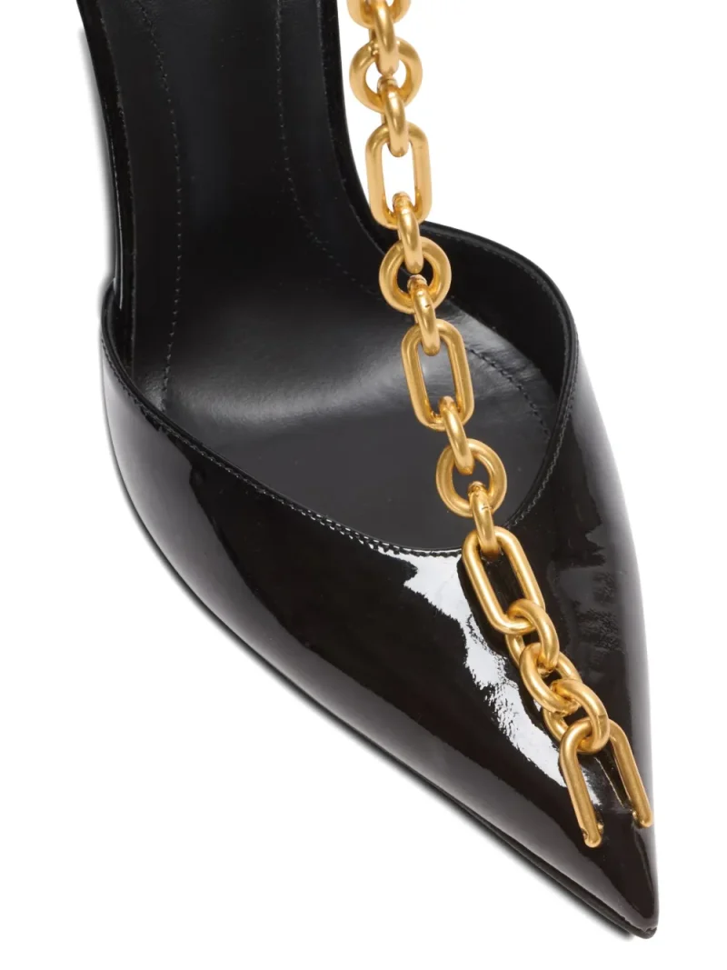 Pantofi Balmain negri din piele, cu toc stiletto inalt de 95 mm, varf ascutit, bareta pe glezna cu inchidere cu catarama si detalii tip lant. 100% piele