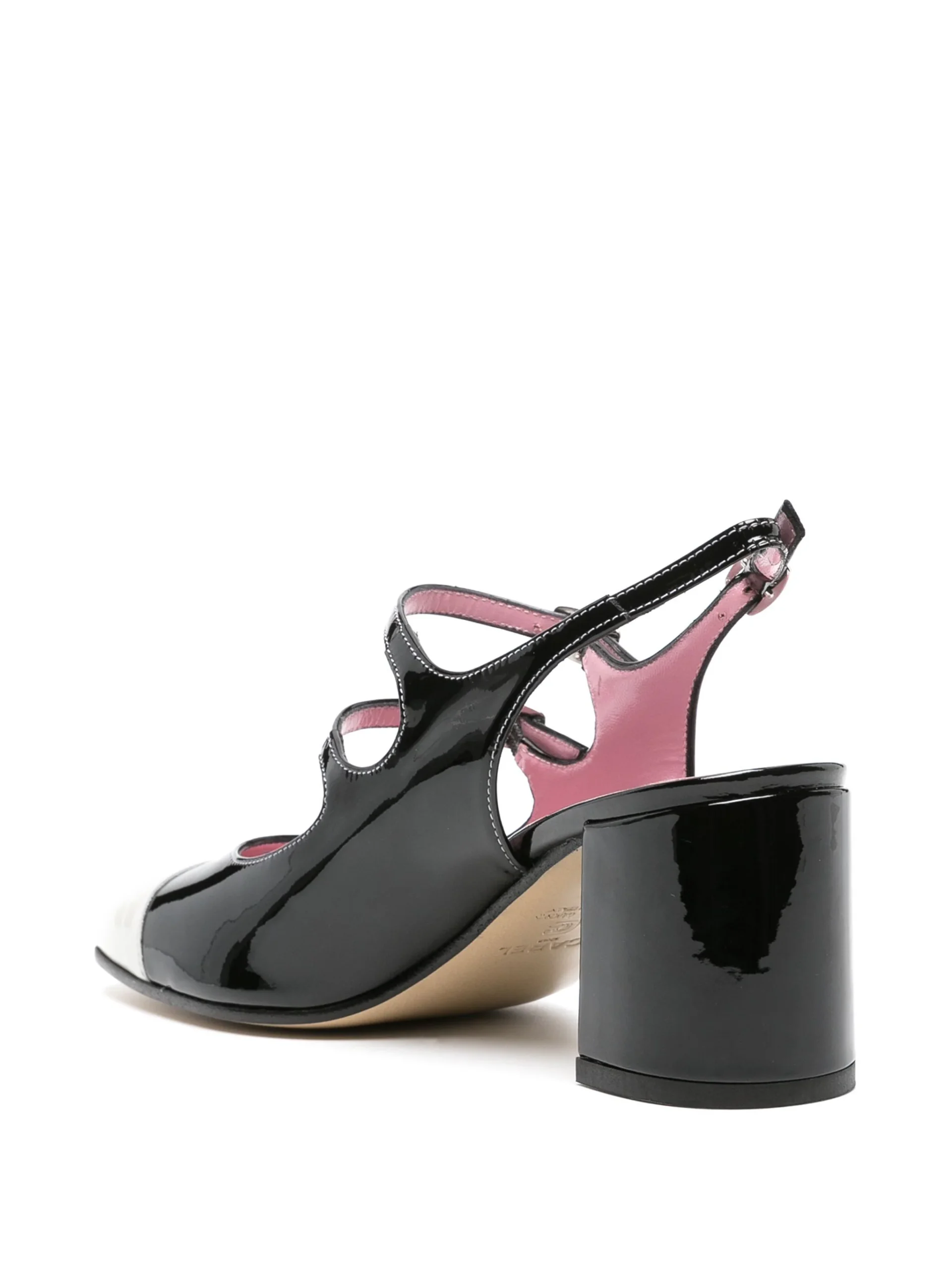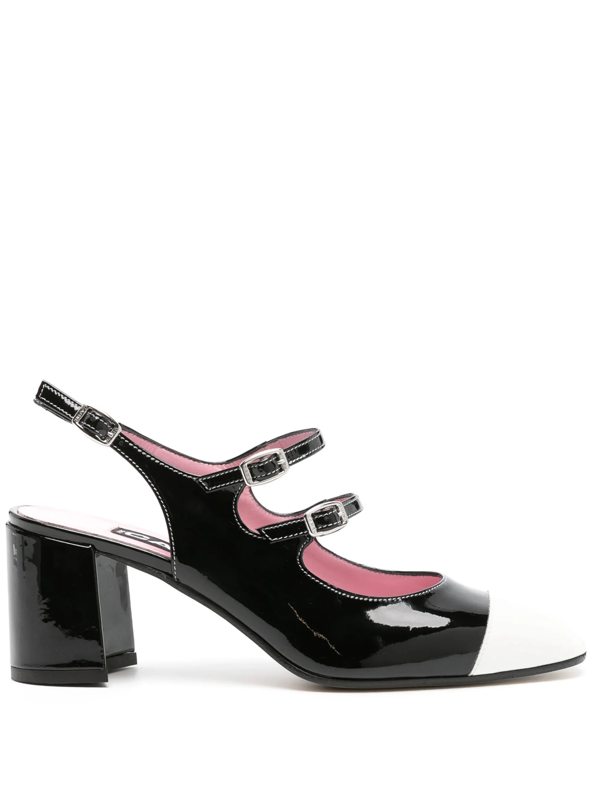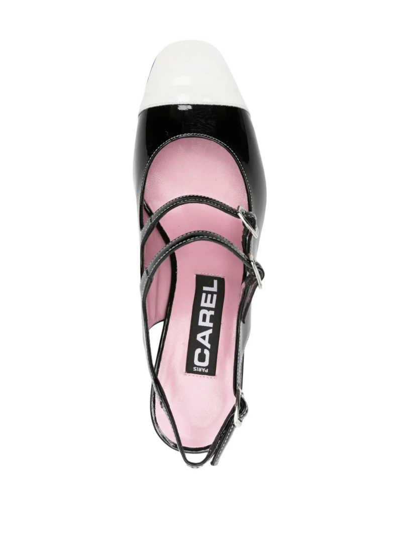 Pantofi alb/negru din piele de vitel, cu inchidere curea si catarama, eticheta logo cusuta pe talpa, captuseala din piele, bot drept, talpa inclinata din piele si toc de 6.5 cm. 100% piele de vitel; 100% piele de vitel; 100% piele de vitel.