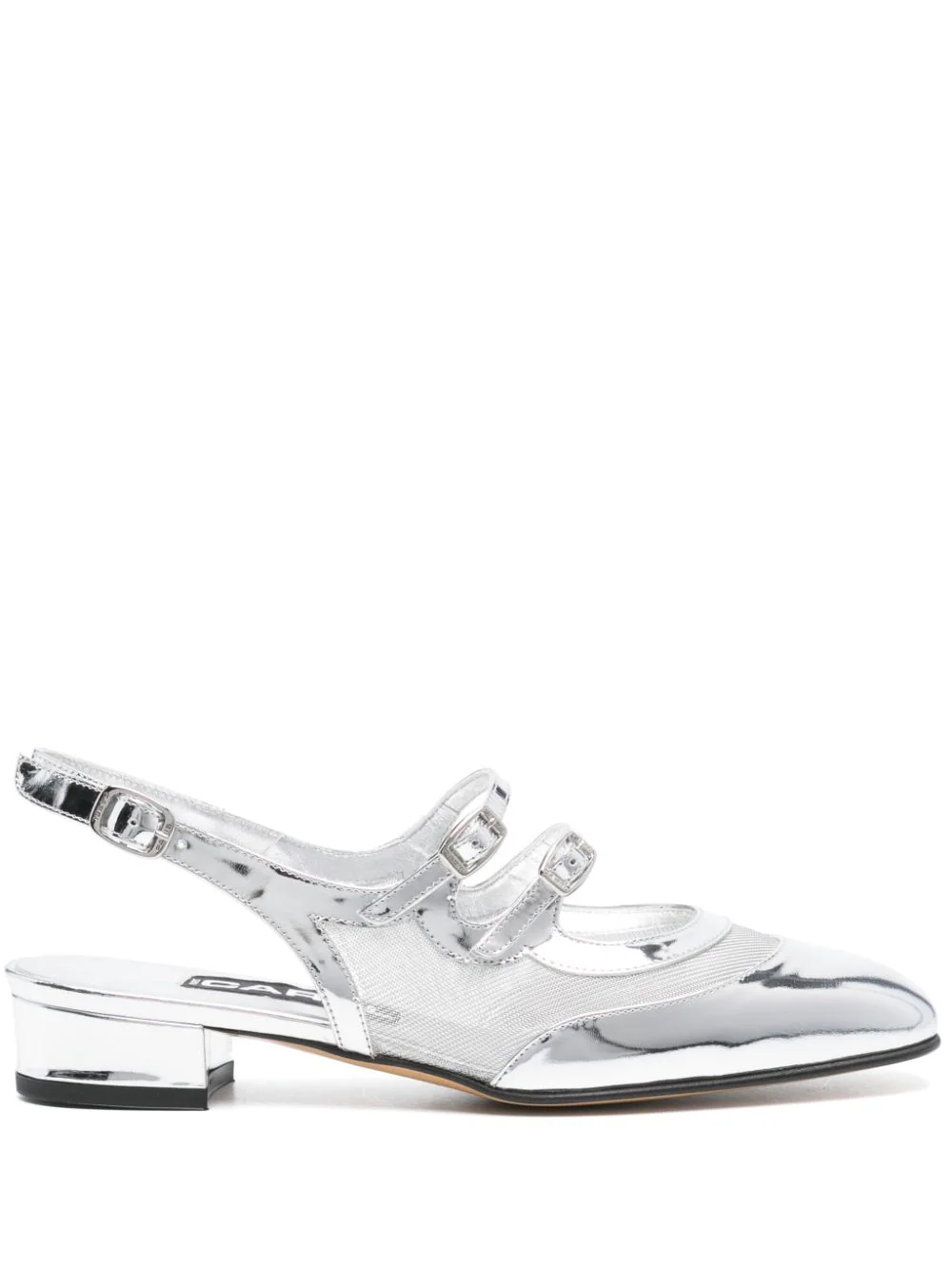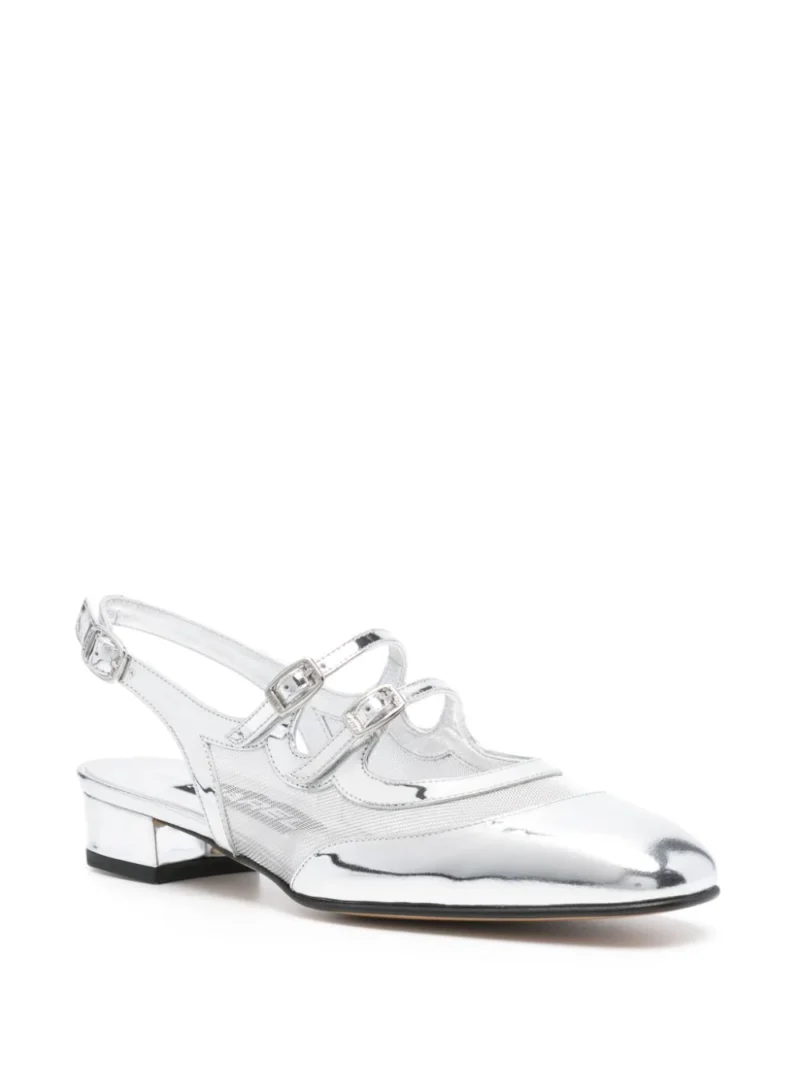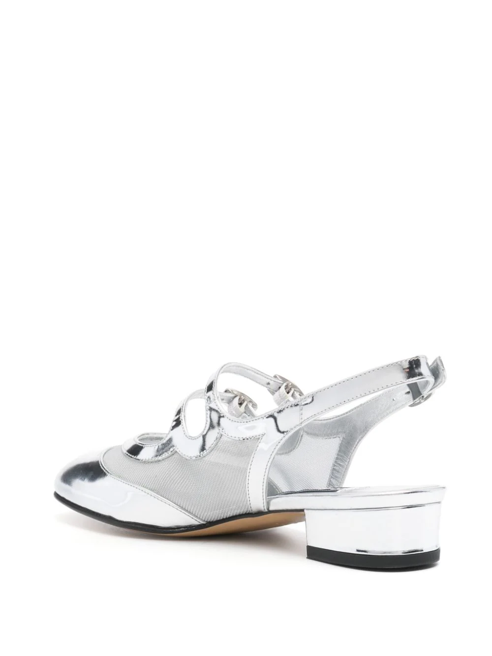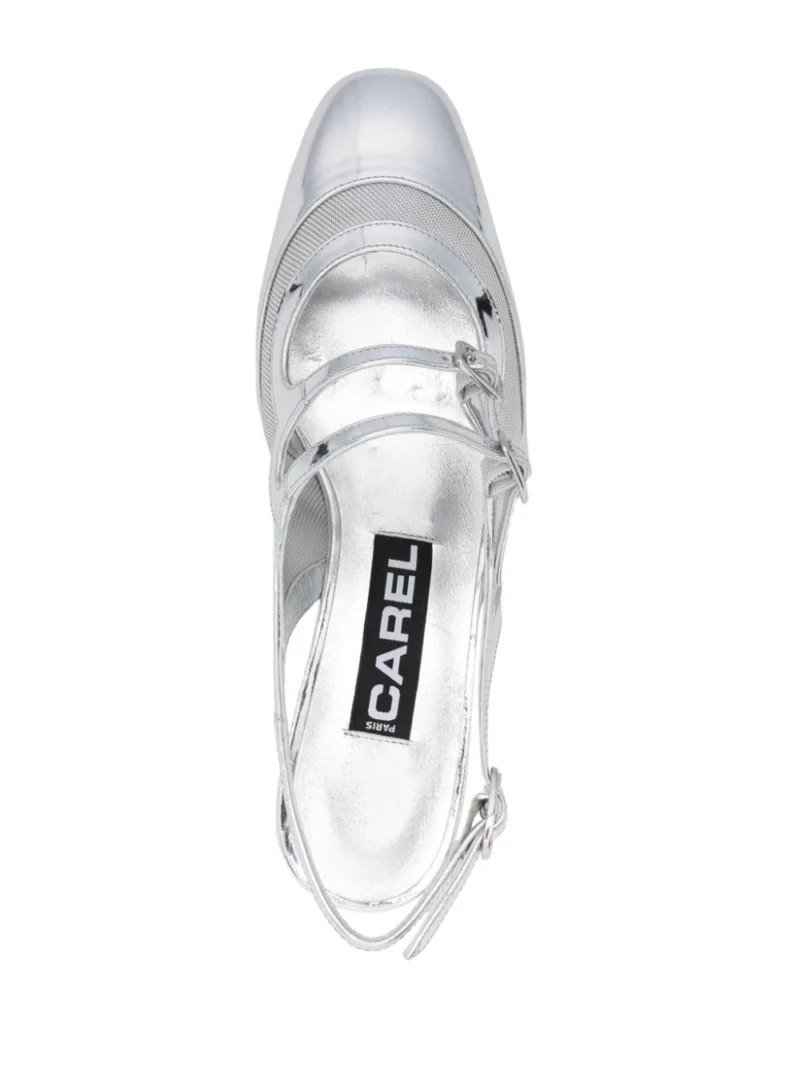 Pantofi argintii din piele de vitel, design din panouri cu parti semitransparente, inchidere curea si catarama, eticheta logo CAREL Paris cusuta, captuseala din piele, bot drept, talpa inclinata din piele si toc de 3 cm. 100% textil; 100% piele de vitel; 100% piele de vitel; 100% piele de vitel.