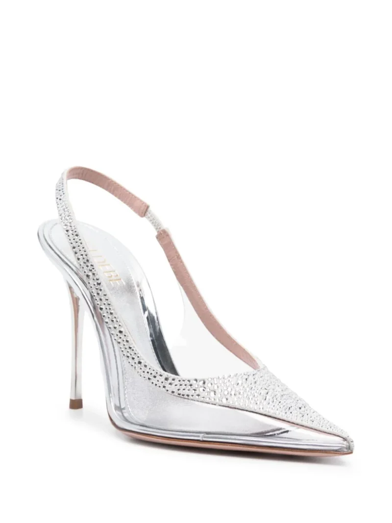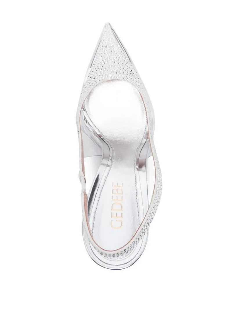 Pantofi argintii din piele intoarsa si pvc, decorati cu cristale sclipitoare pe partea superioara, cu inchidere curea elastica, logo GEDEBE imprimat, bot ascutit, talpa inclinata din piele si toc de 11 cm. 100% textil; 100% pvc; 100% piele intoarsa.