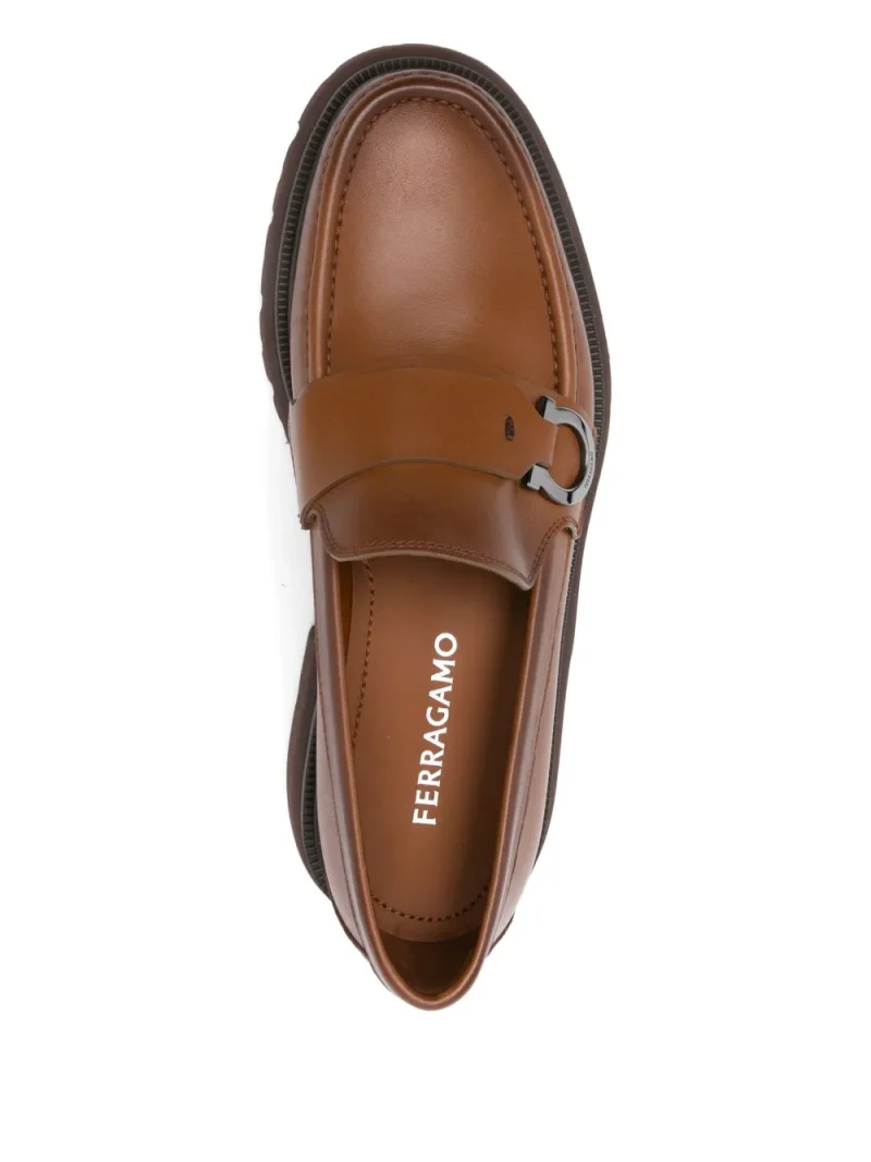 Pantofi loafers Ferragamo Leather Buckle maro, din piele, tip loafers, fara inchidere, cu profil jos, catarama emblematica Gancini pe partea superioara, captuseala din piele si talpa suprainaltata din cauciuc. 100% cauciuc; 100% piele de vitel; 100% piele de vitel.