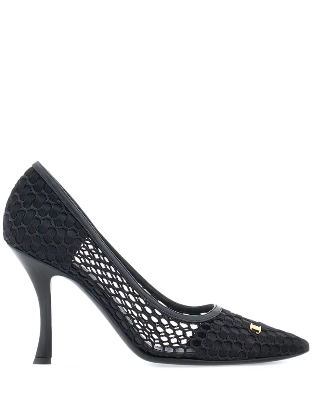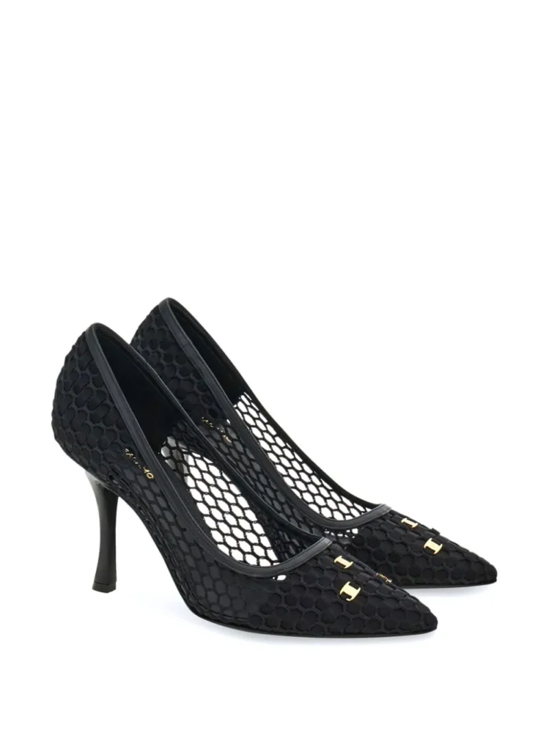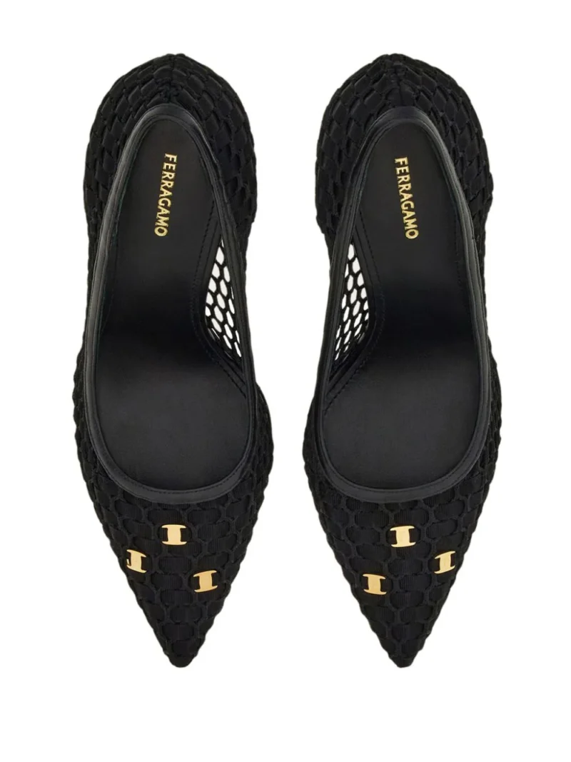 Pantofi Ferragamo 95mm Vara-Applique Slingback negru, din mix de materiale, design mesh, cu inchidere curea si catarama, captuseala din piele, logo Ferragamo pe talpa, bot ascutit si toc kitten. Detalii: Inaltime toc- 9,5 cm. 90% poliester; 10% piele de miel; 100% piele de miel.