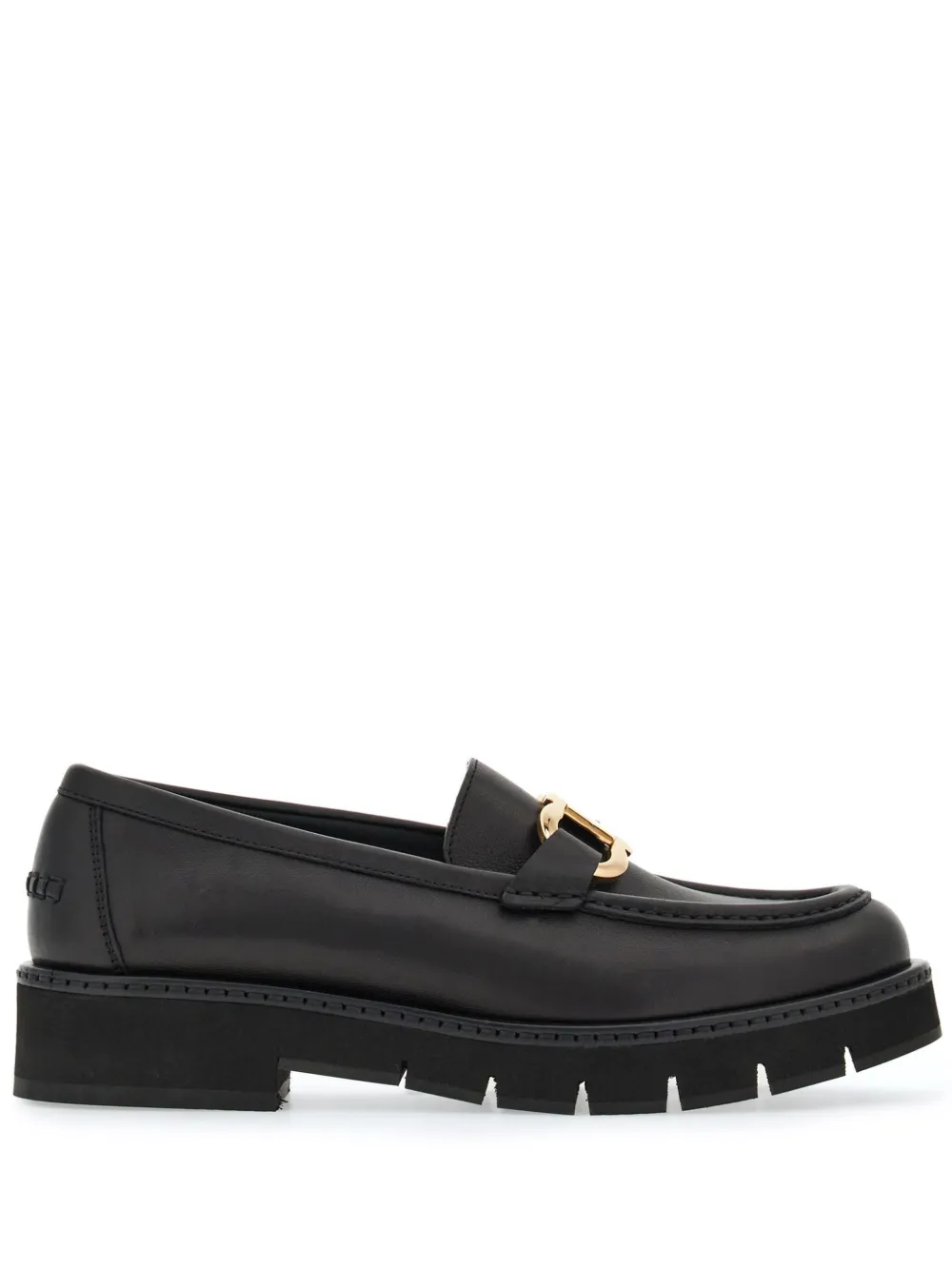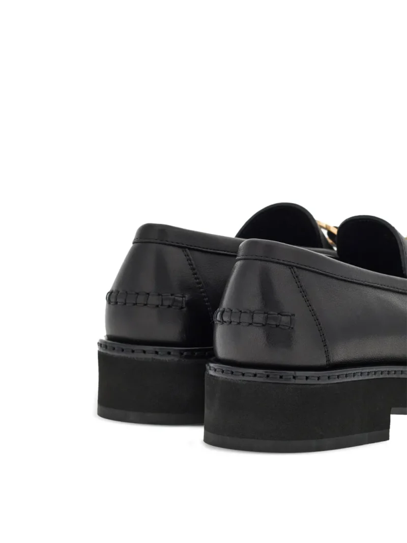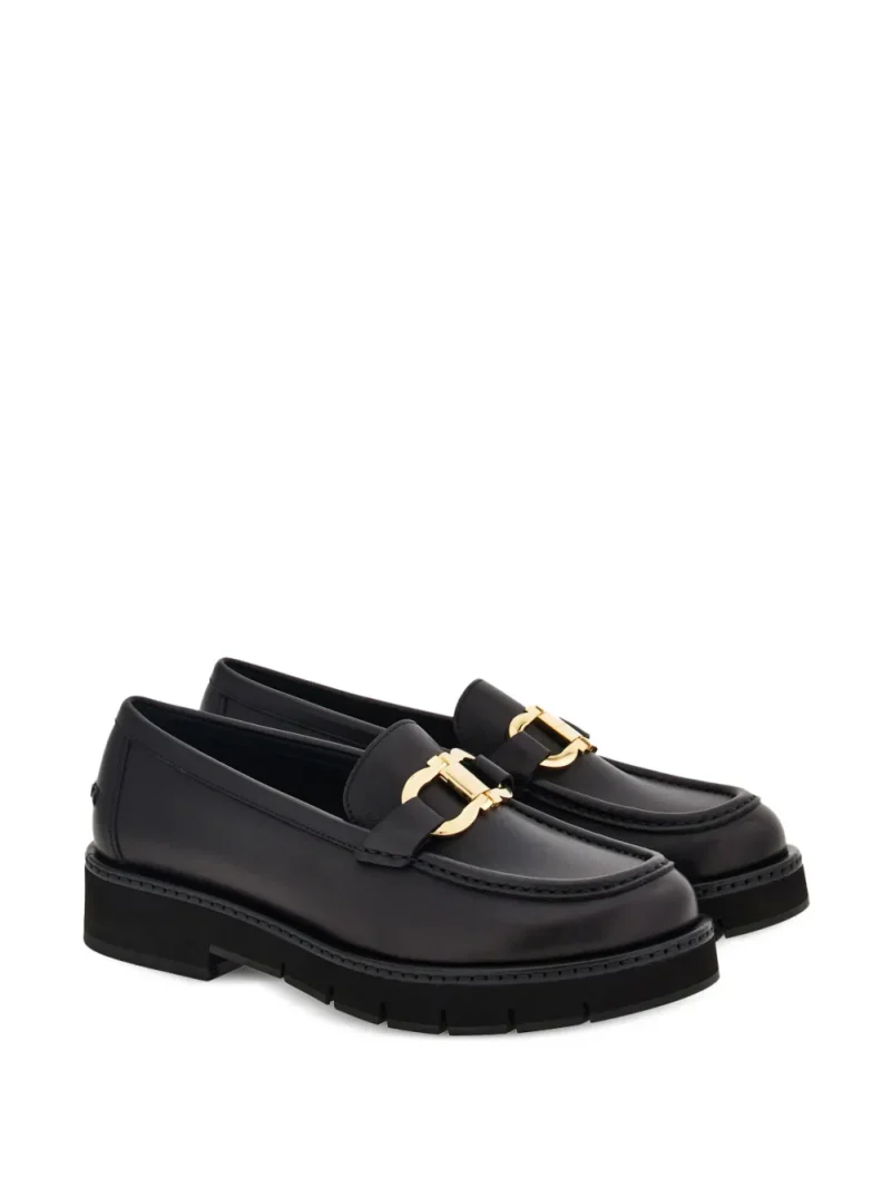 Pantofi Ferragamo Gancini-plaque negru, detalii aurii, cusatura alba, varf rotund, brant interior din piele naturala cu logo, talpa striata din cauciuc. 100% piele