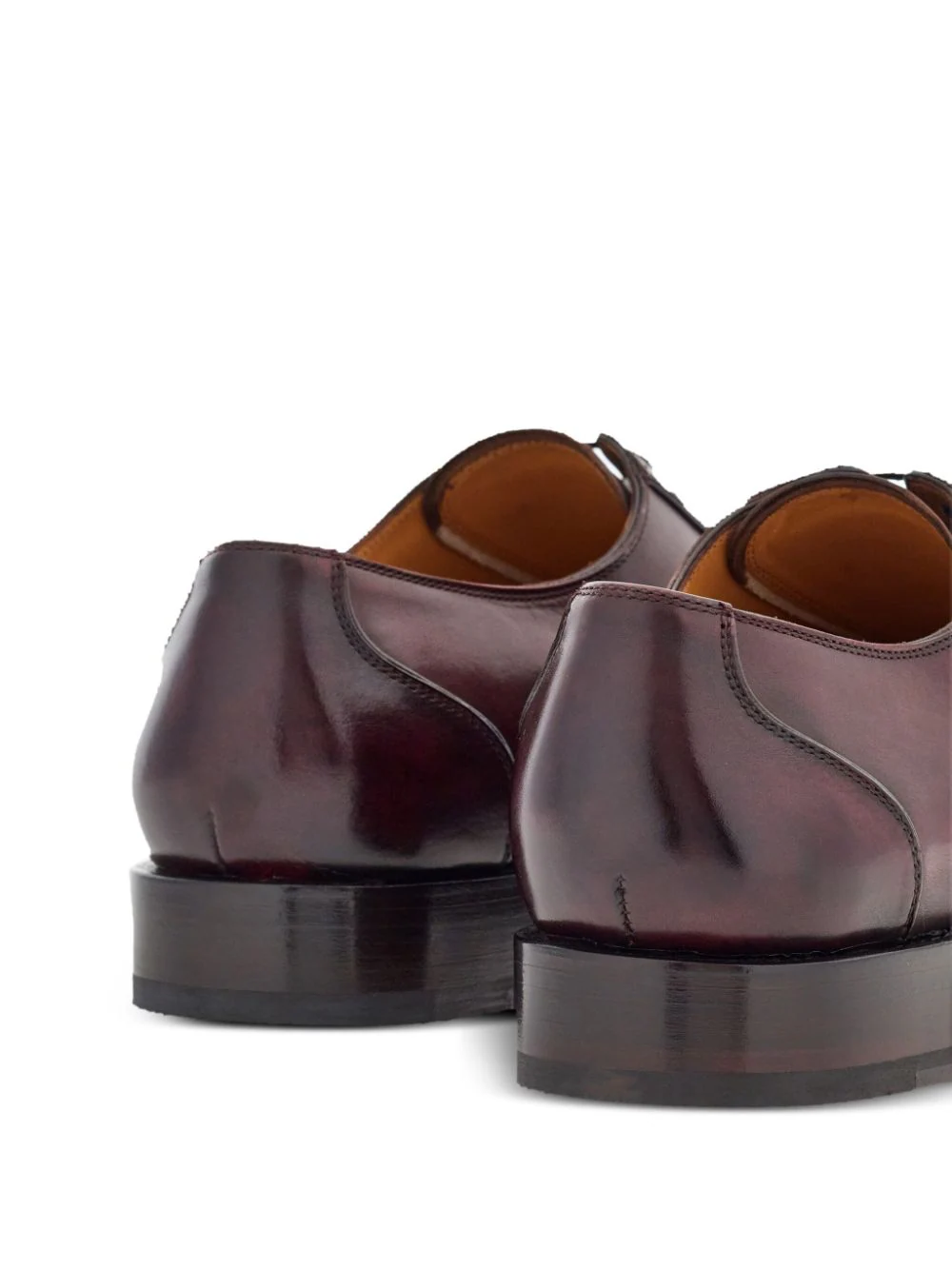 Pantofi visinii din piele vitel, tip Oxford, cu profil jos, inchidere cu sireturi, captuseala din piele, bot drept si talpa din piele cu toc. 100% piele de vitel; 88% piele de vitel; 12% piele de capra; 100% piele naturala.