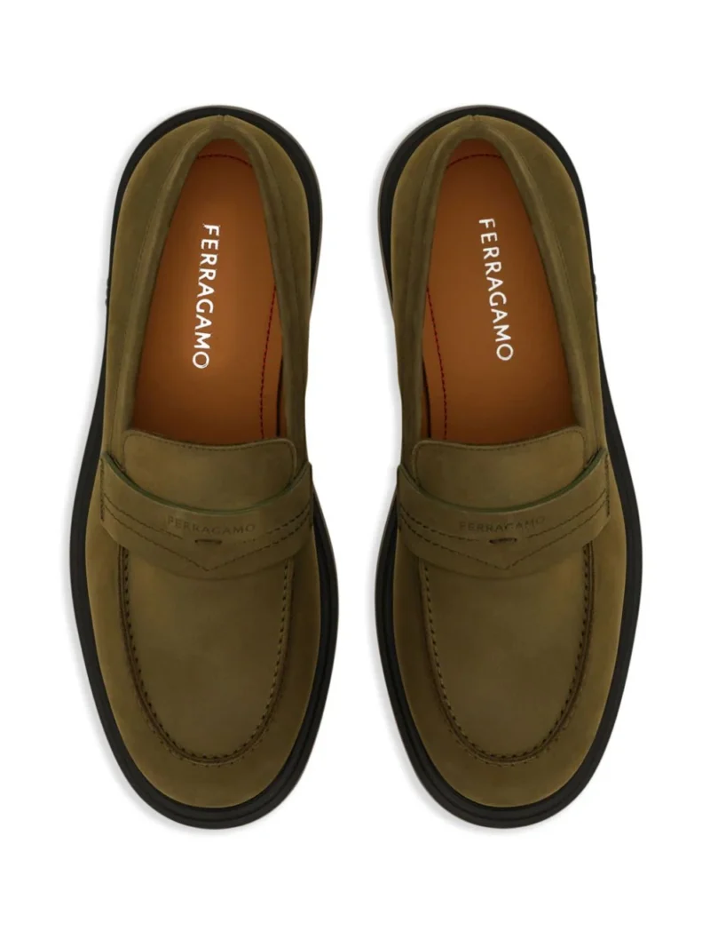 Pantofi loafers FERRAGAMO Penny khaki, cu profil jos, fara inchidere, captuseala din piele, bot rotunjit si talpa din cauciuc. 100% piele de vitel; 89% piele de vitel; 11% piele de miel; 100% cauciuc.