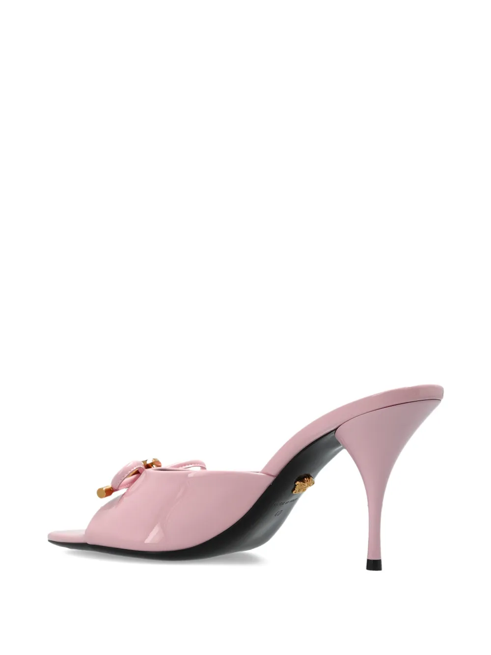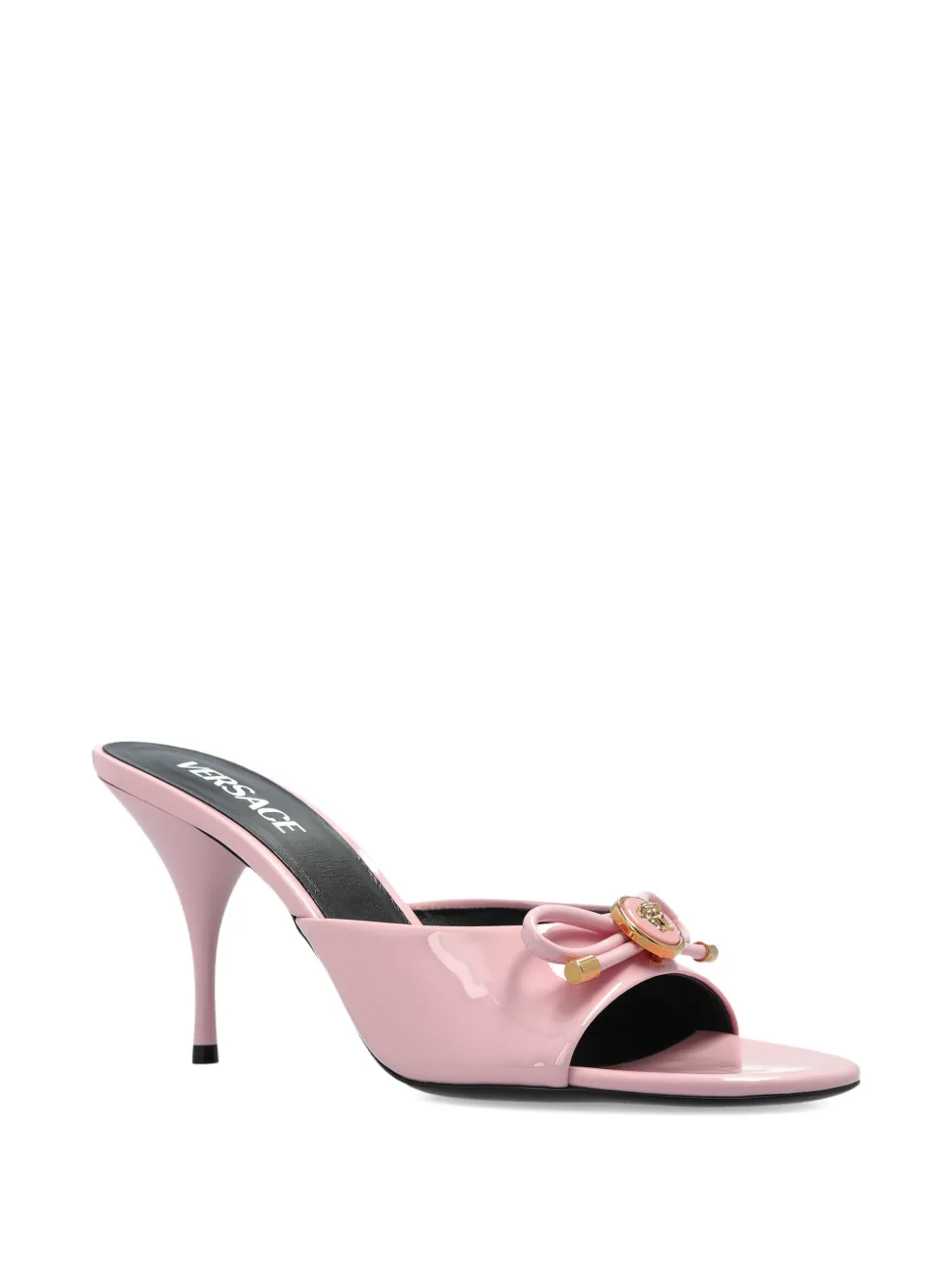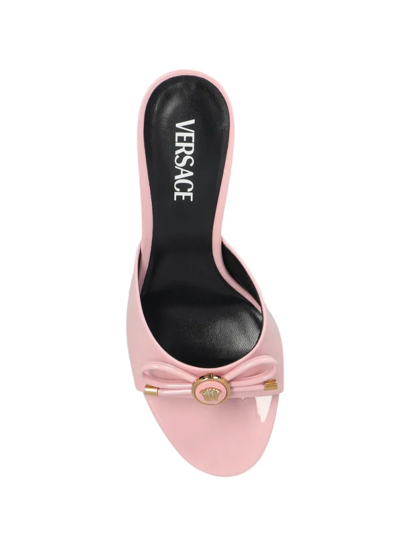 Pantofi Mules Versace Bow Heeled Leather roz, open-toe, din piele lacuita, decorati cu funda si emblema Medusa, logo imprimat pe talpa si toc stiletto. 100% piele.