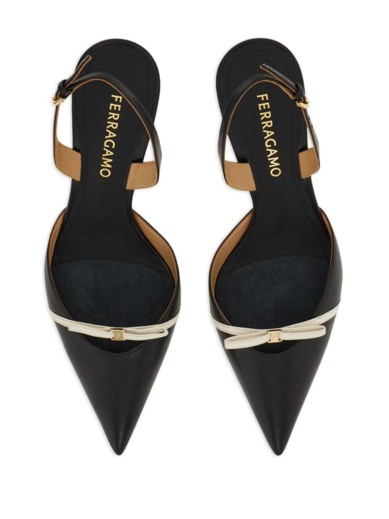 Pantofi pumps Ferragamo 70mm Leather Slingback negru, din piele, cu toc de 70mm, inchidere ajustabila curea si catarama oblica, talpa inclinata, bot ascutit si logo Ferragamo Bow metalic. Detalii: Inaltime toc- 7 cm. 100% piele de miel; 100% piele de miel.
