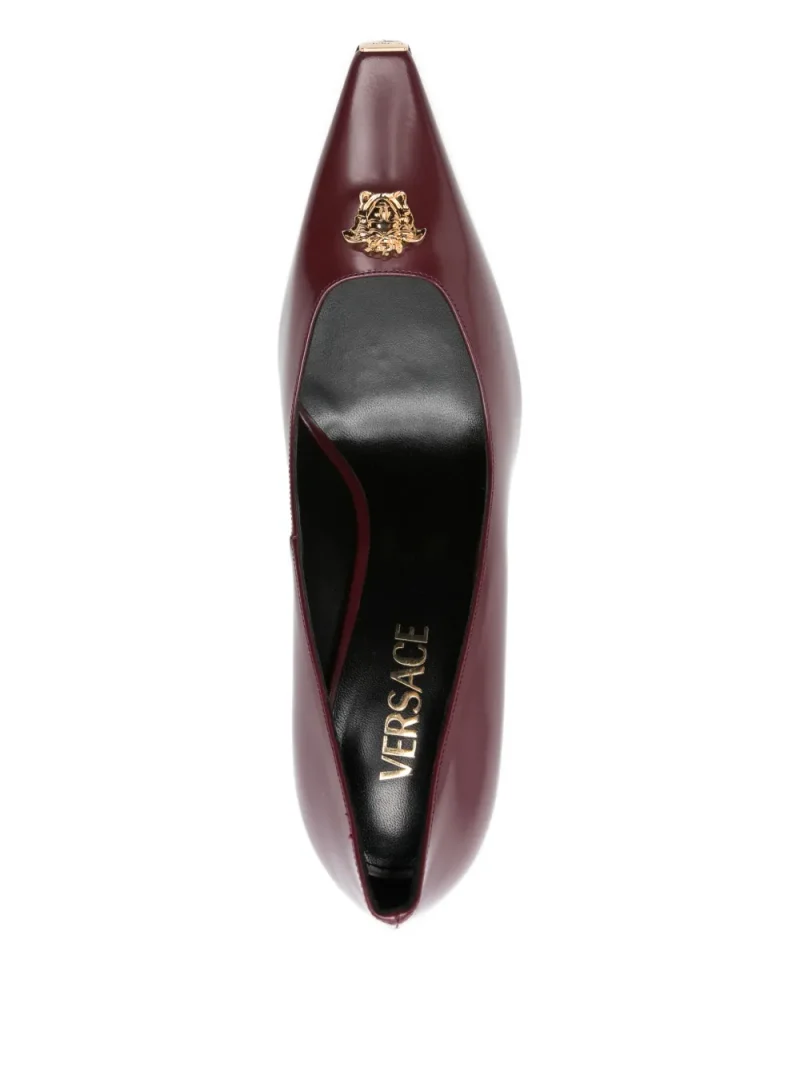 Pantofi Versace 110mm Medusa-Embellished Pointed-Toe visiniu, din piele, cu toc de 110mm, talpa inclinata, bot ascutit si logo metalic Versace M2dusa aplicat. Detalii: Inaltime toc- 11cm. 100% piele; 100% ; 100% piele.