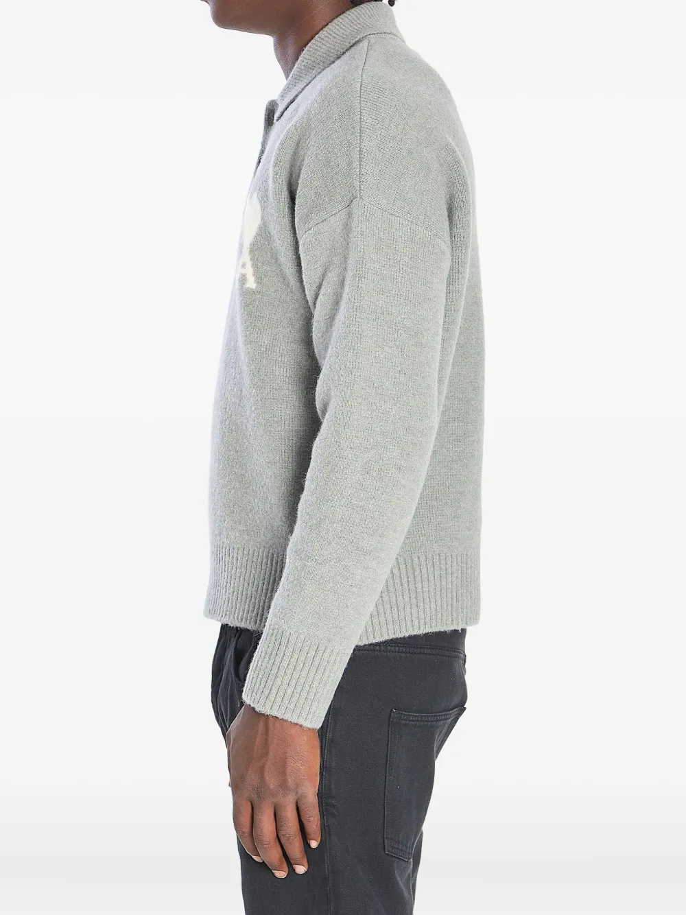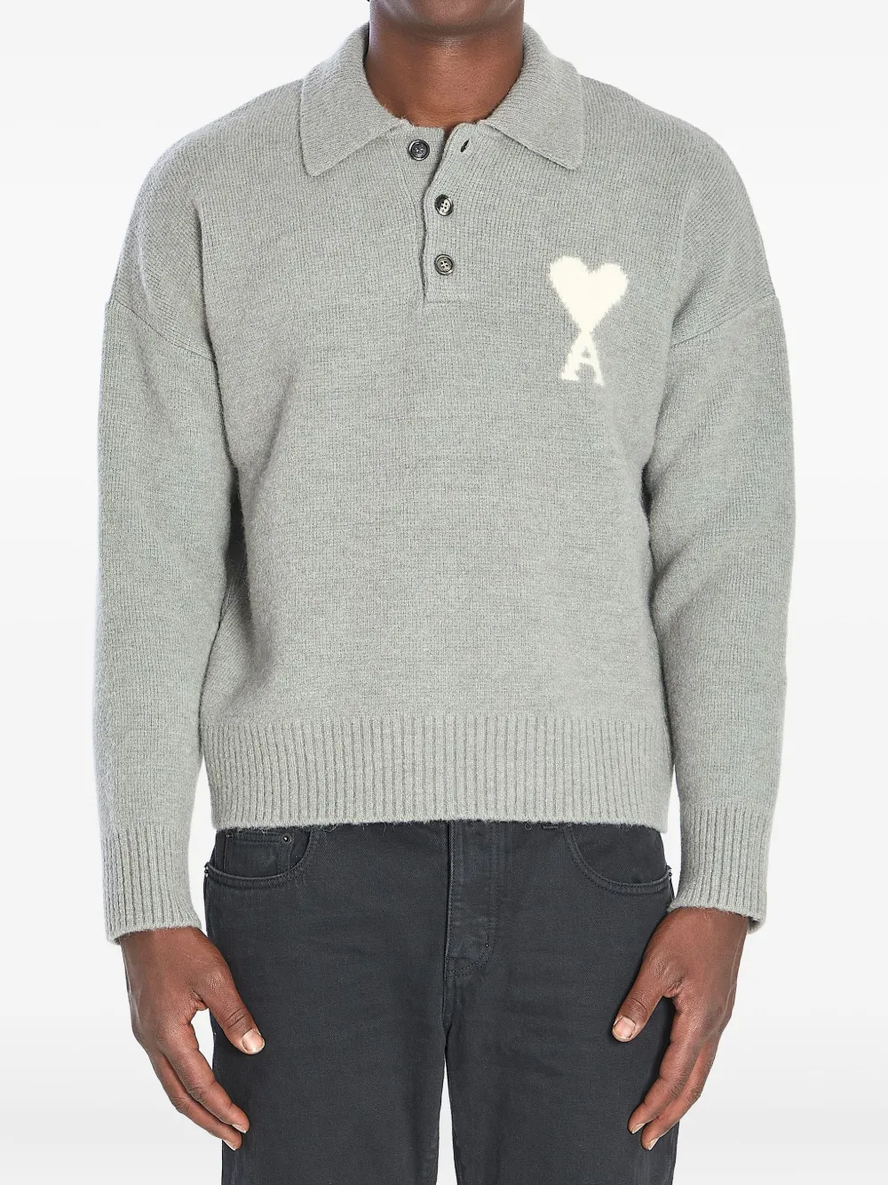 Pulover Ami Paris Ami de Coeur Intarsia Polo gri, cu guler polo, inchidere partiala cu nasturi, maneci lungi, logo Ami in tesatura si terminatii ribbed. Potrivit pentru sezonul toamna/iarna. 50% alpaca; 25% lana; 23% poliamida; 2% elastan.