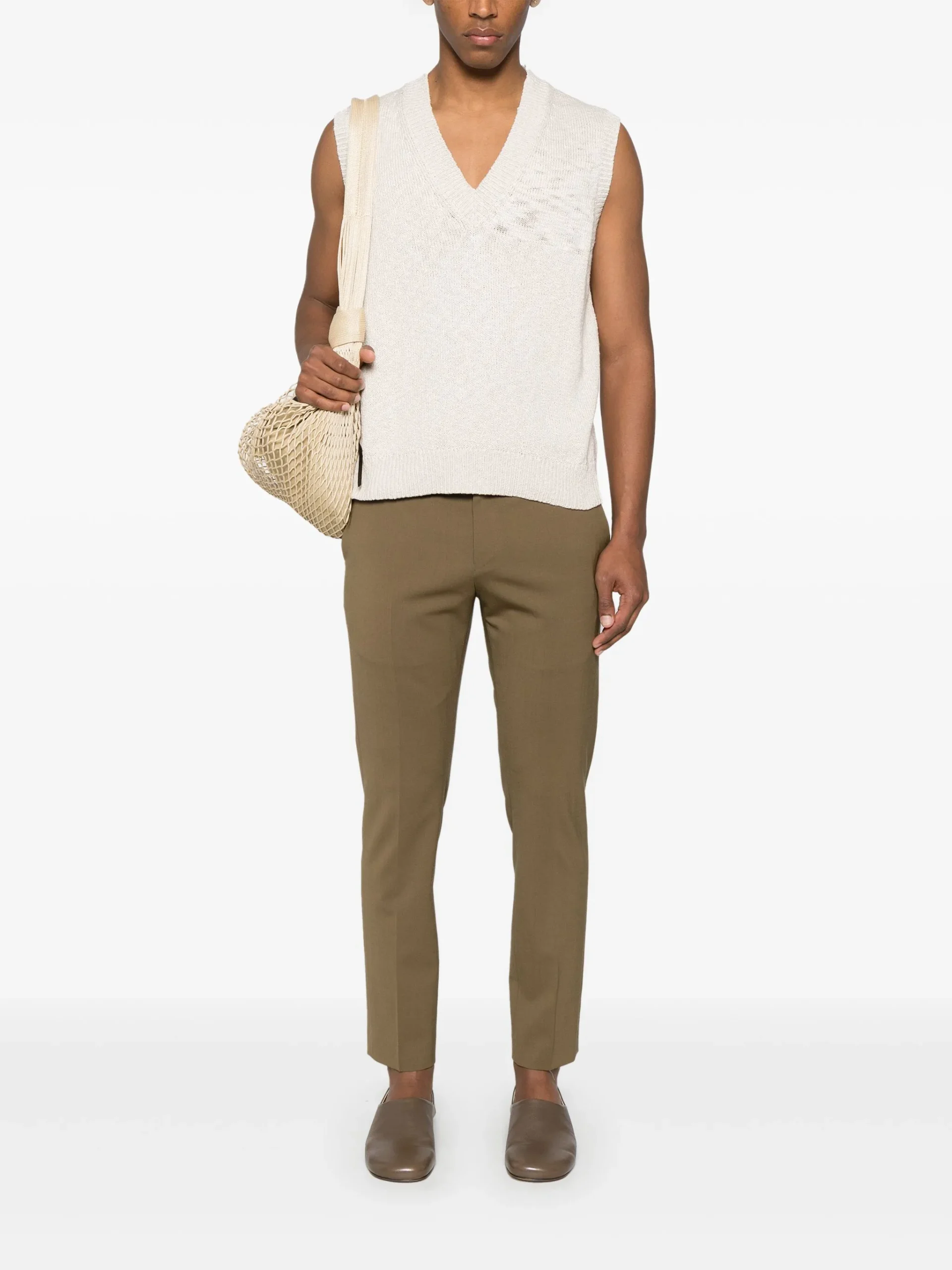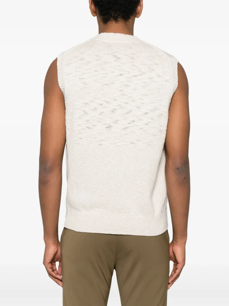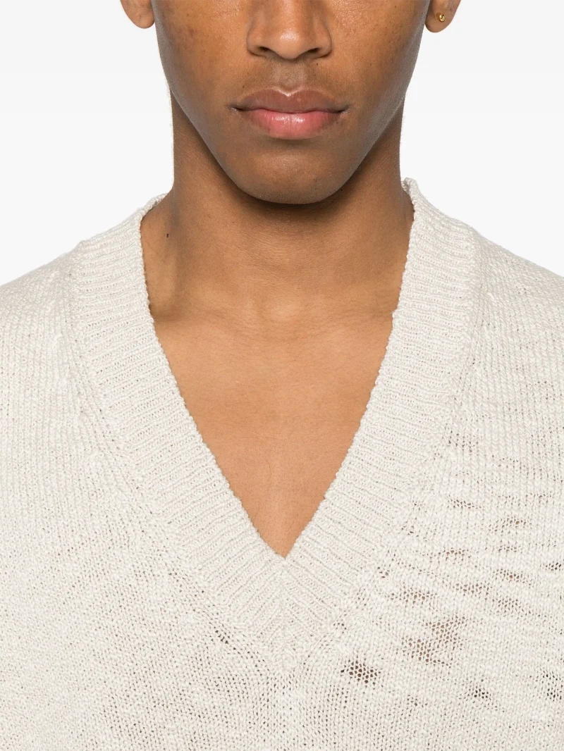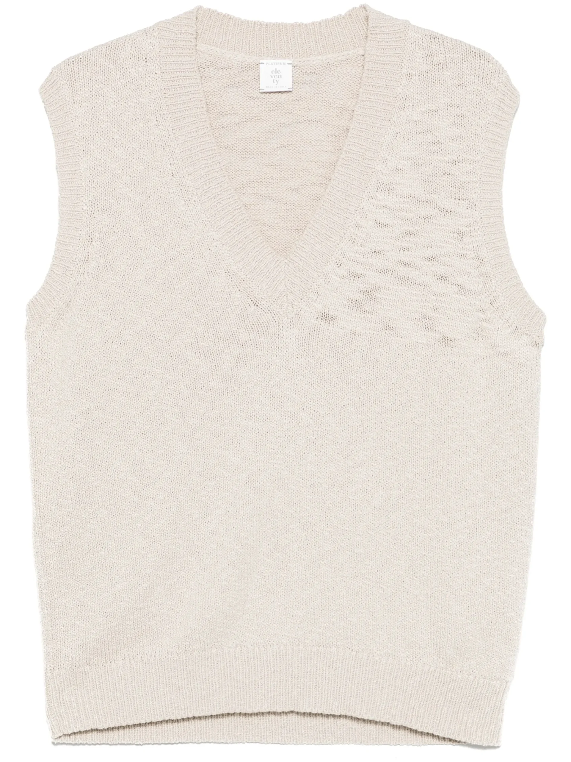 Pulover Eleventy fisherman’s-knit bej, guler in V, mansete si tiv elastic. Potrivit pentru sezonul primavara/vara.100% bumbac