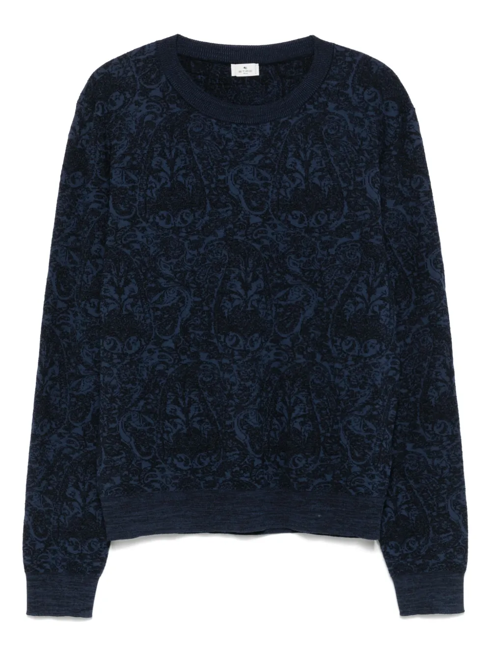 Pulover ETRO Paisley-Motif albastru, cu guler rotund ribbed, maneci lungi, mansete elastice, tricot jacquard cu pattern Paisley si tiv ribbed. Potrivit pentru sezonul toamna/iarna. 57% bumbac; 22% lana; 21% acril.