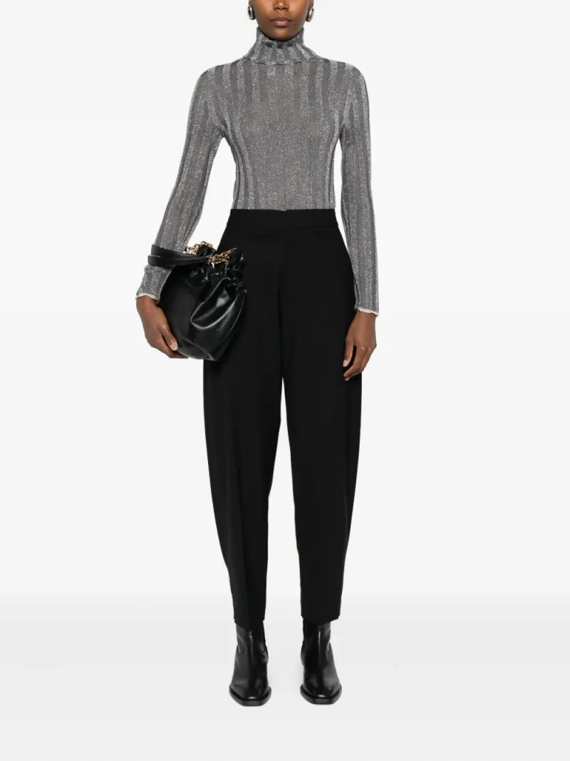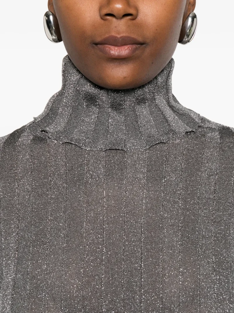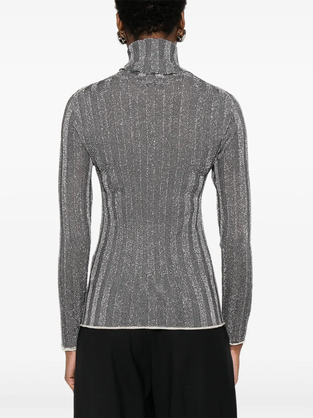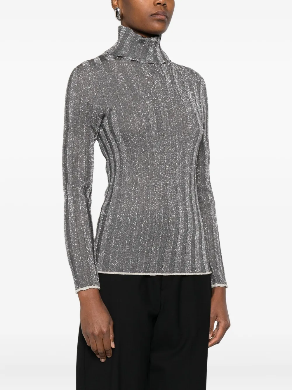 Pulover Fabiana FiIlippi Roll-Neck argintiu, din viscoza, cu guler inalt, maneci lungi, tesatura ribbed cu fibre metalice si tiv drept. Potrivit pentru sezonul toamna/iarna. 77% viscoza; 23% poliester.