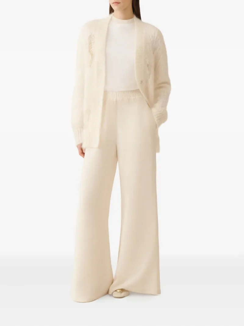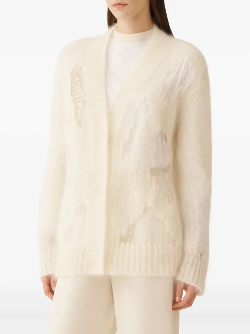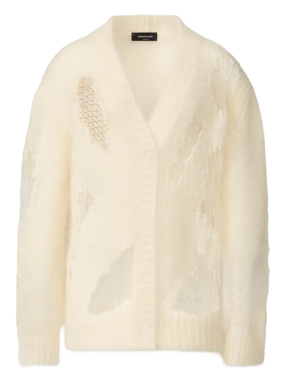 Pulover Fabiana Filippi Long-Sleeves ecru, cu deoclteu in V, inchidere ascunsa, maneci lungi, insertii din plasa si terminatii ribbed. Potrivit pentru sezonult toamna/iarna. 65% mohair; 33% nylon; 2% lana.