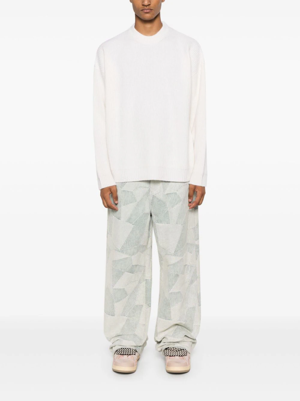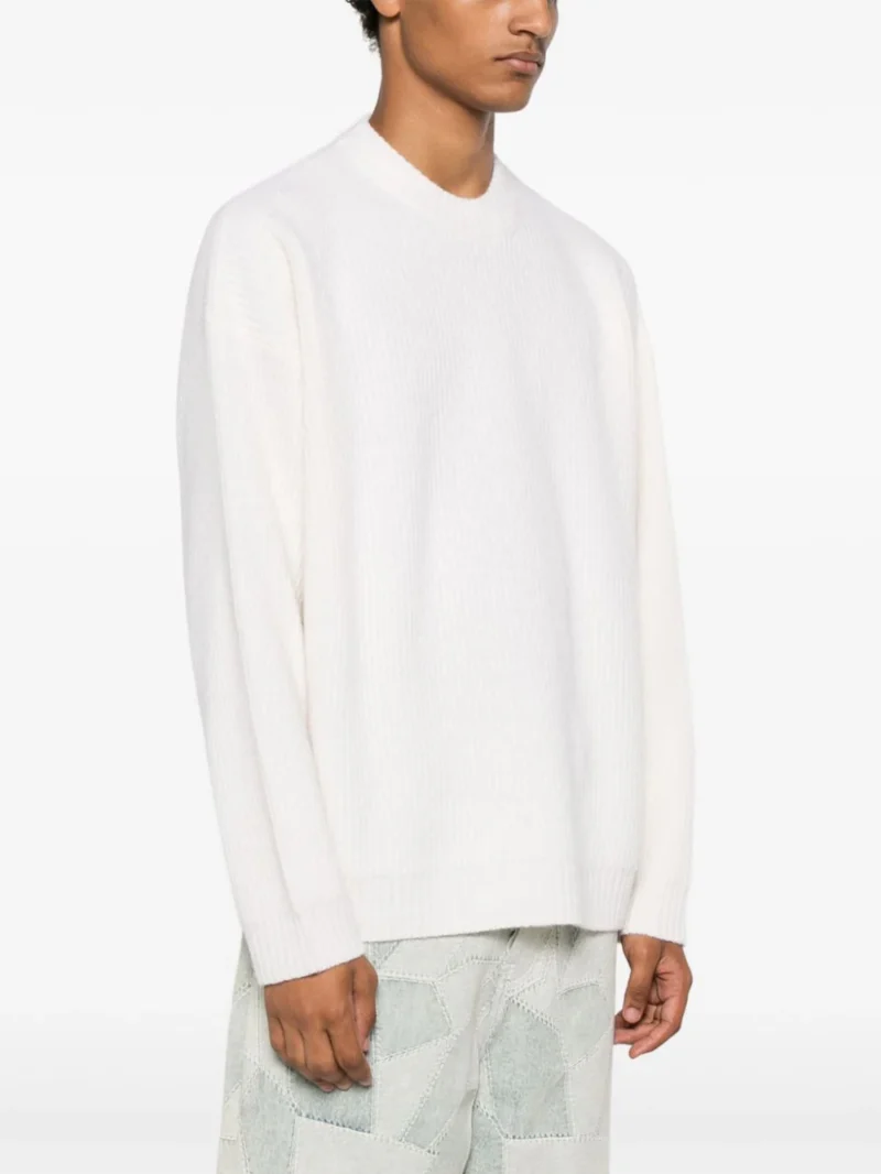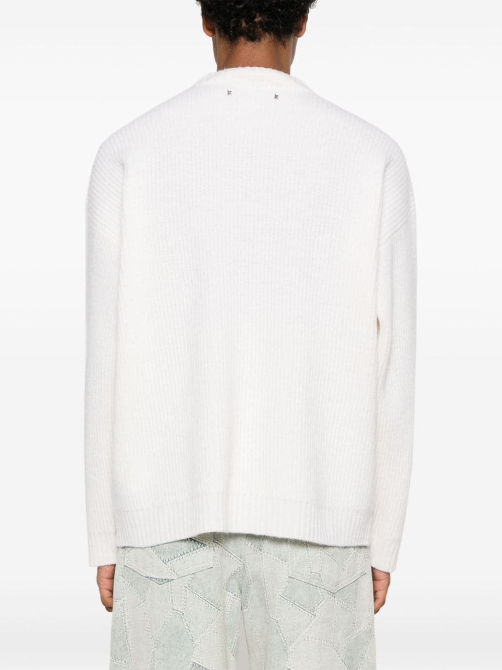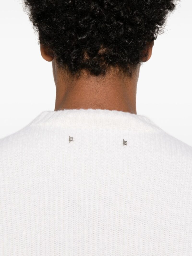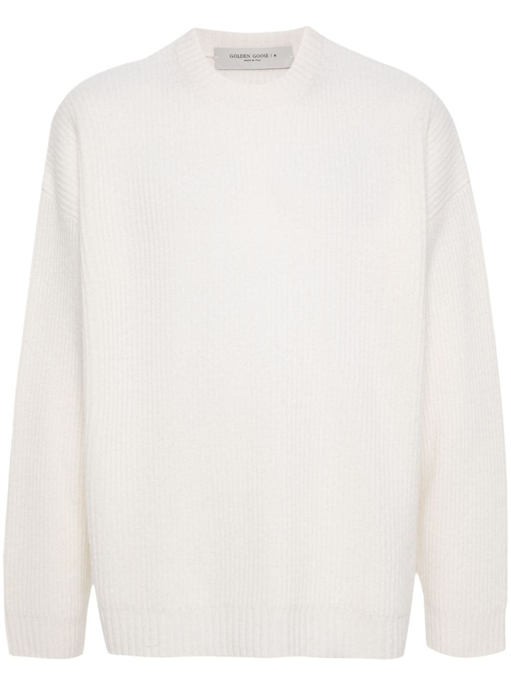 Pulover Golden Goose Ribbed alb, dn lana,cu guler tip crewneck, umeri cazuti, maneci lungi, mansete elastice, tesatura ribbed, logo metalic Golden Goose Star cusut pe partea din spate si tiv elastic drept. Ptorivit pentru sezonul toamna/iarna. 100% lana.
