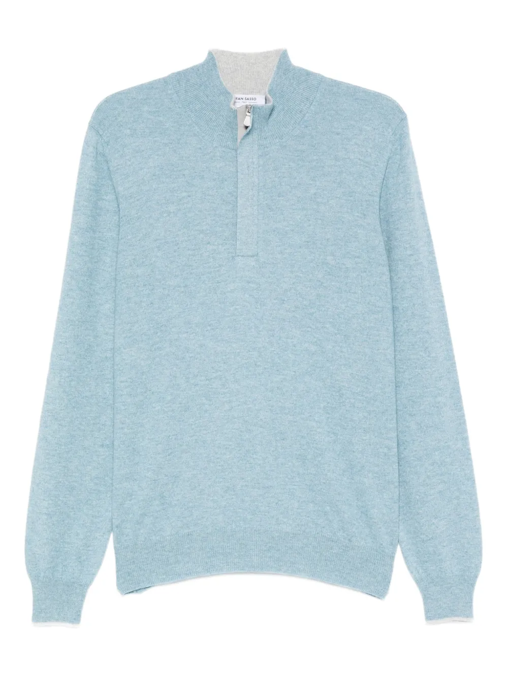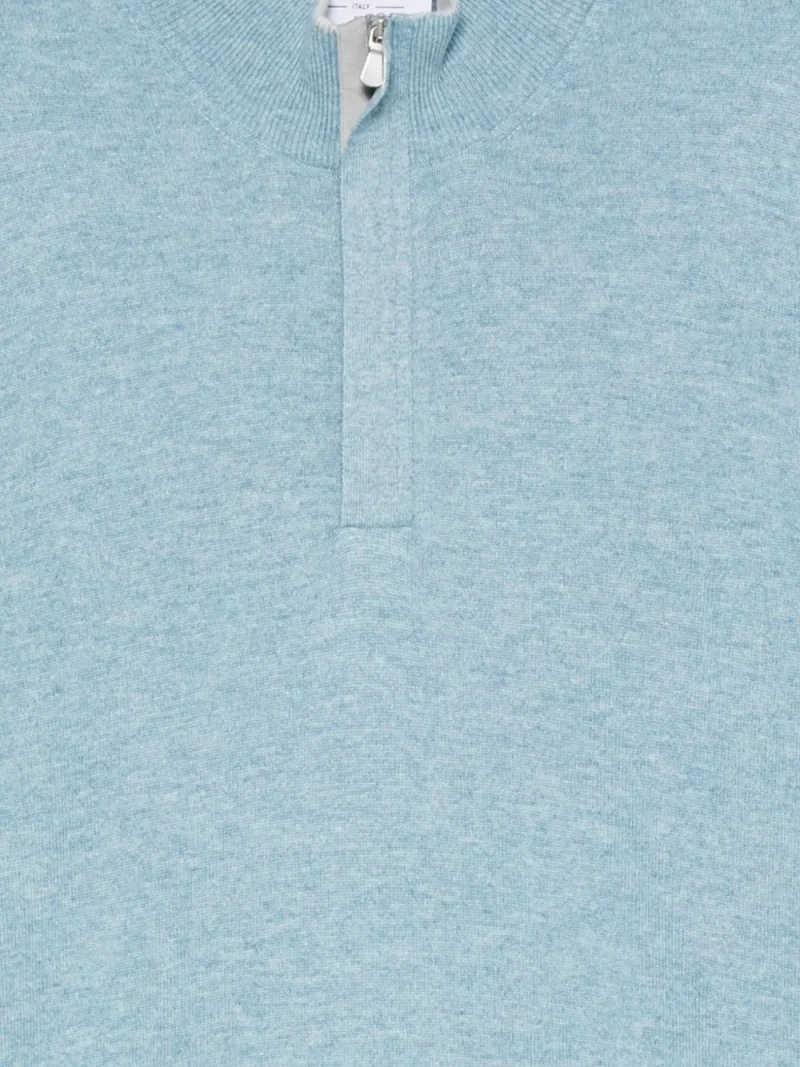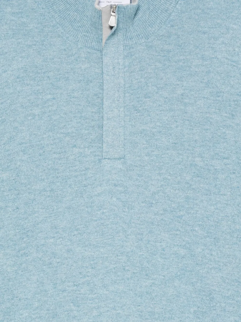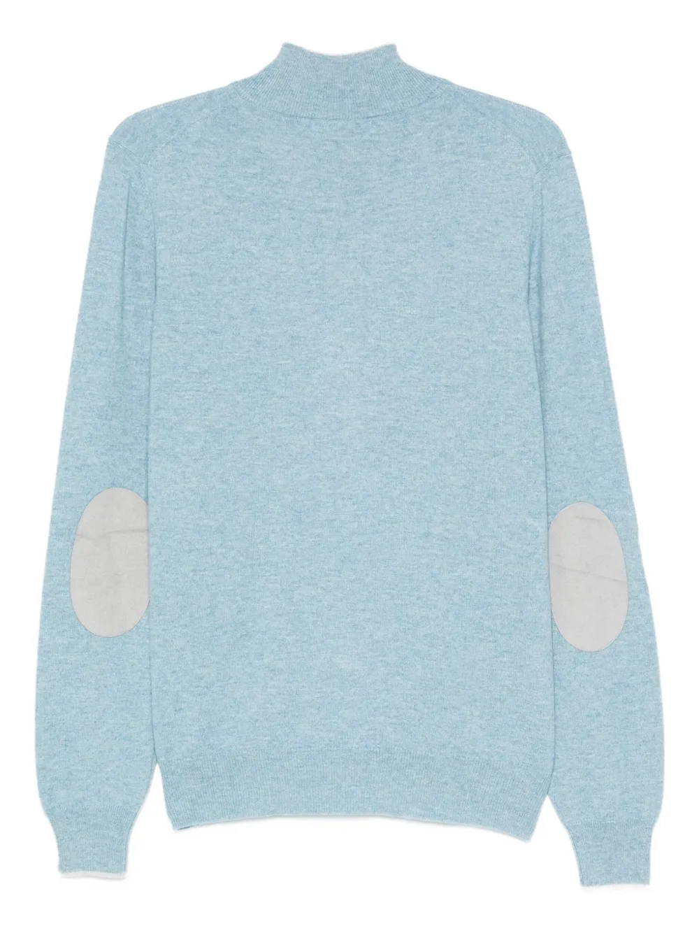Pulover Gran Sasso Half-Zip albastru, realizat din lana, cu guler inalt, inchidere partiala cu fermoar, maneci lungi cu patch-uri si terminatii ribbed. Potrivit pentru sezonul toamna/iarna. 80% lana; 10% viscoza; 10% casmir.
