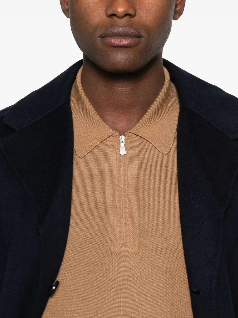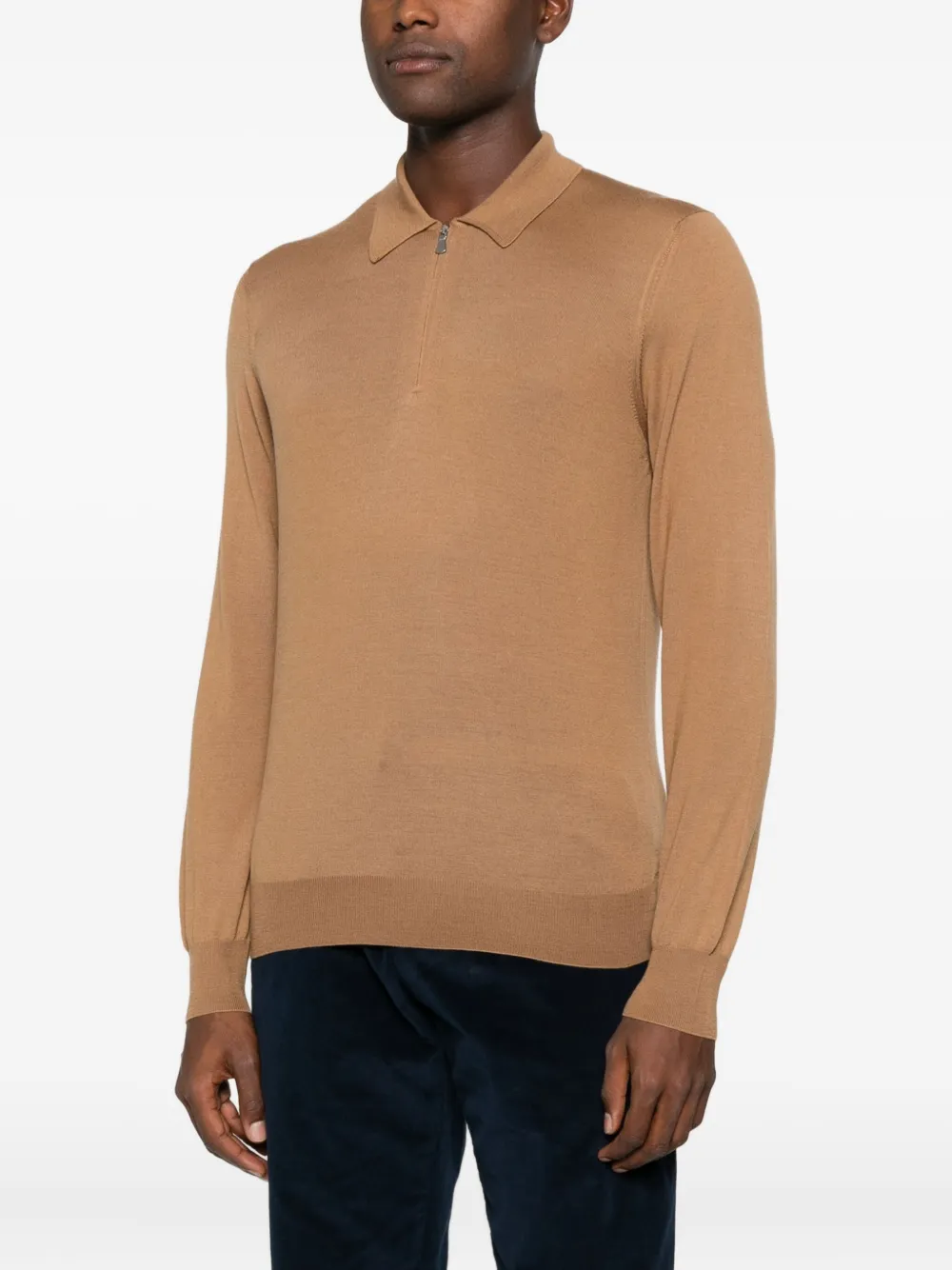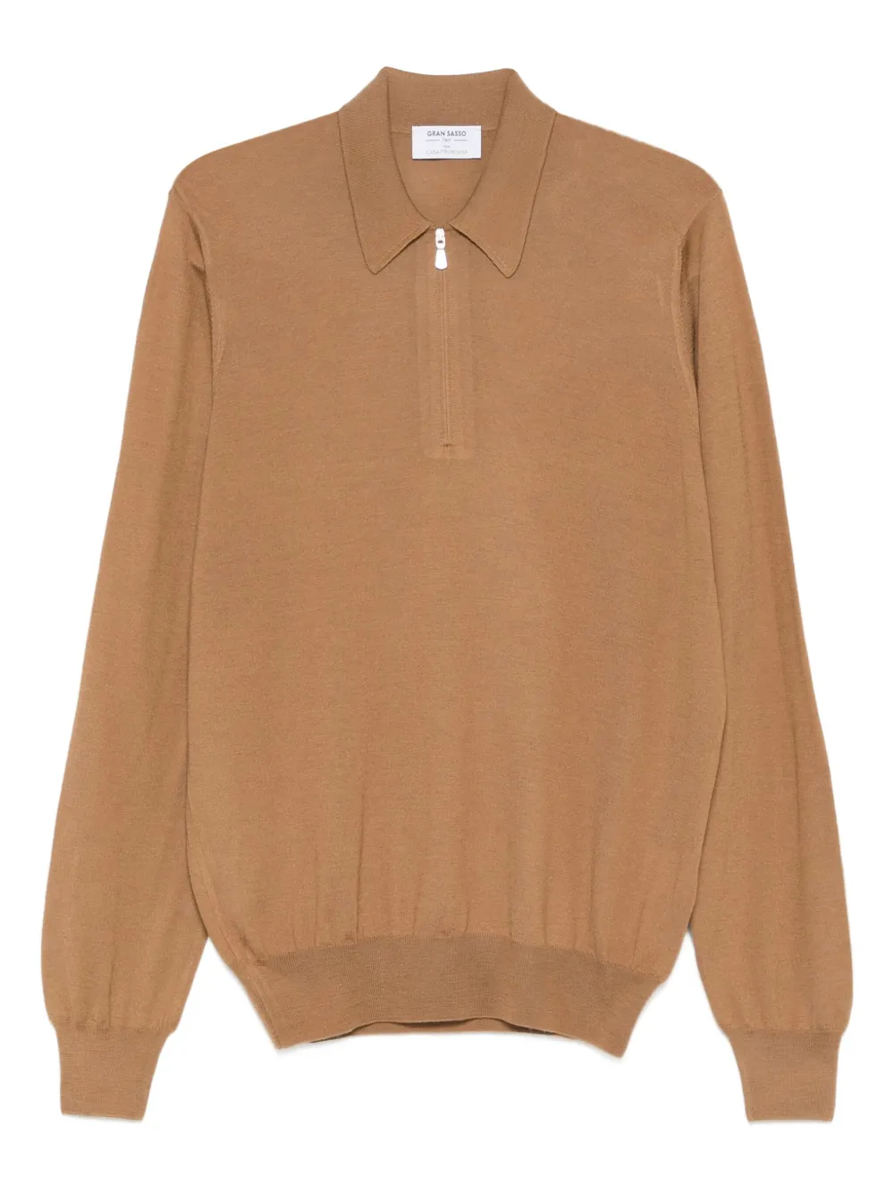 Pulover Gran Sasso Half-Zip Polo maro, realizat din lana premium, cu guler polo, inchidere cu fermoar partial, maneci lungi si terminatii ribbed. Potrivit pentru sezonul toamna/iarna. 100% lana.