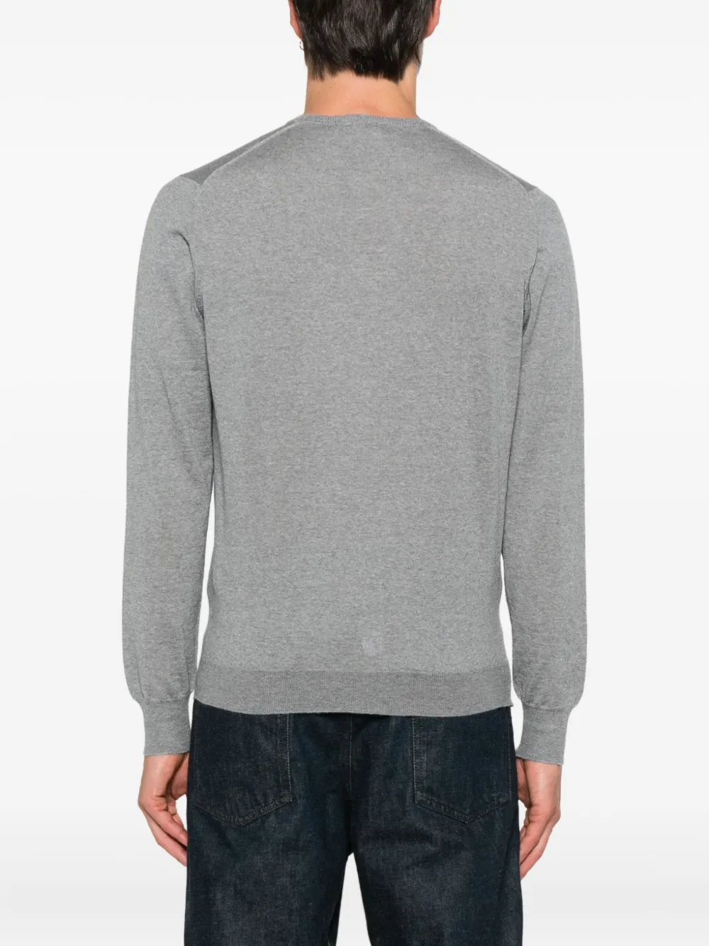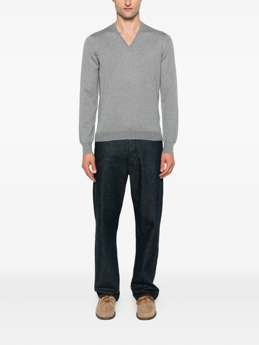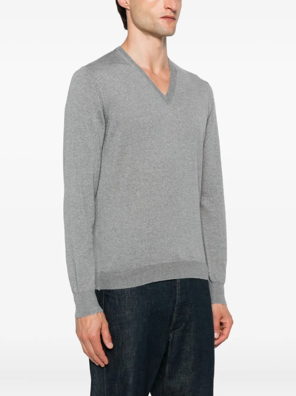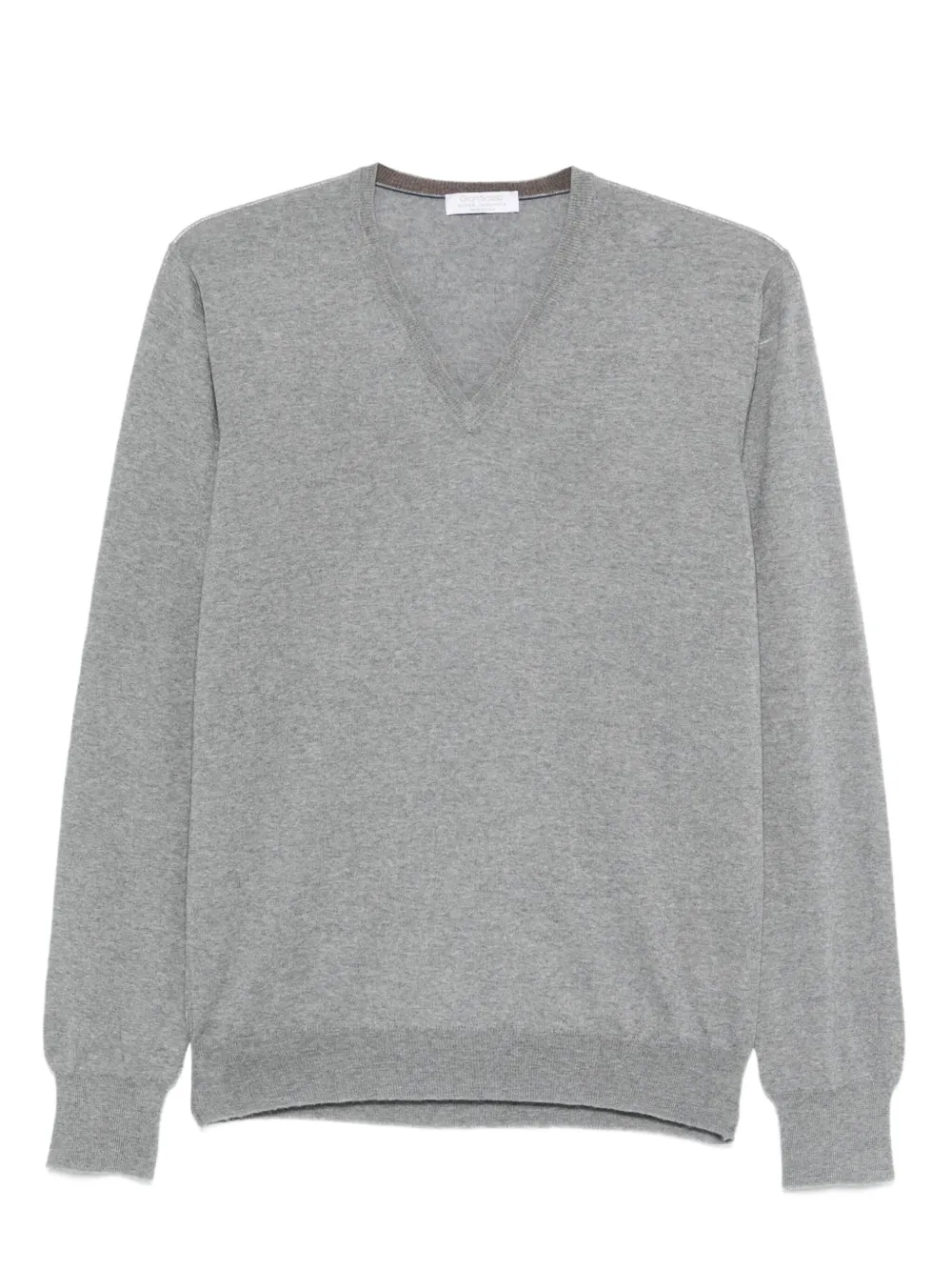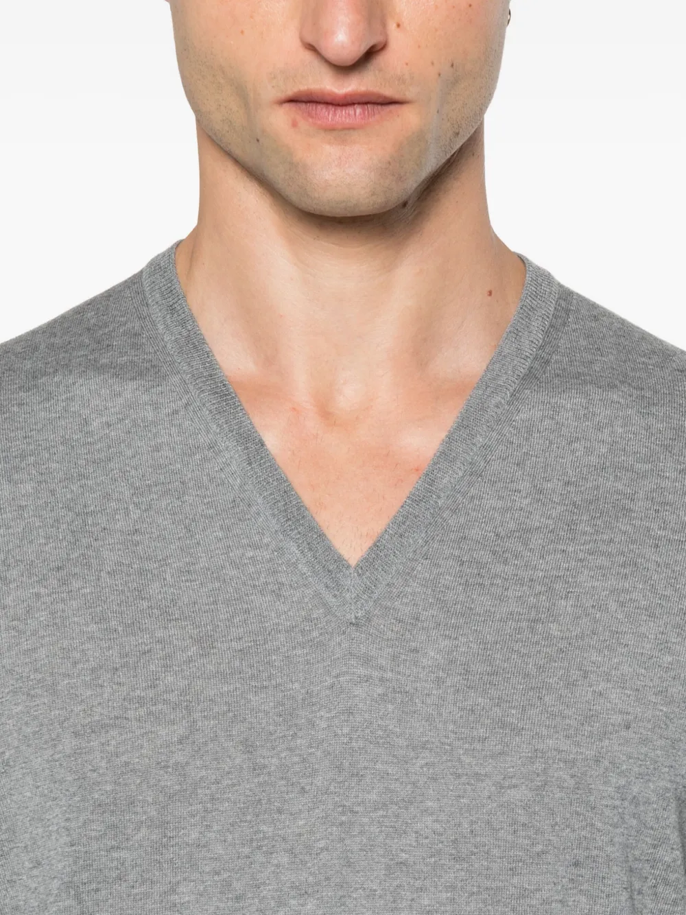 Pulover Gran Sasso V-neck gri, design minimalist, cu guler in V, maneci lungi, mnsete elastice, tricotat din lana premium si tiv elastic. Potrivit pentru sezonul toamna/iarna. 100% lana.