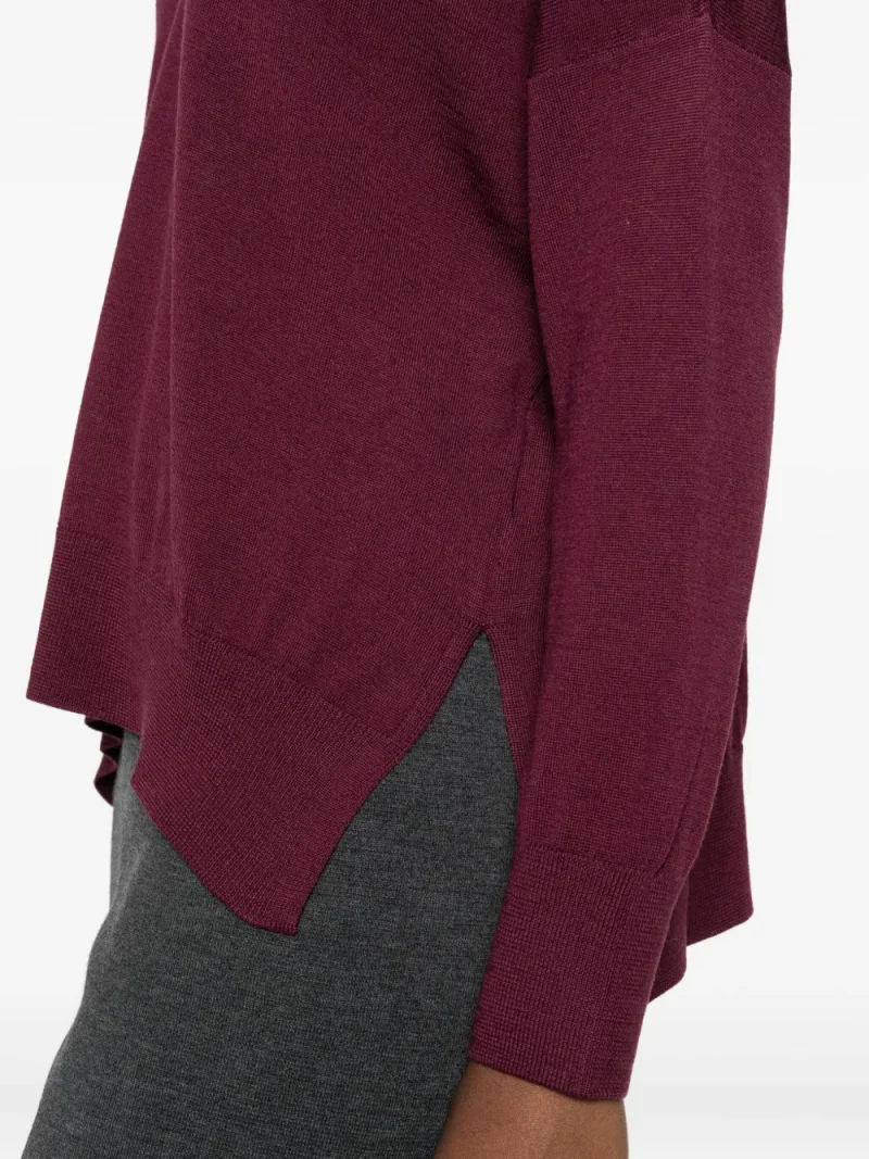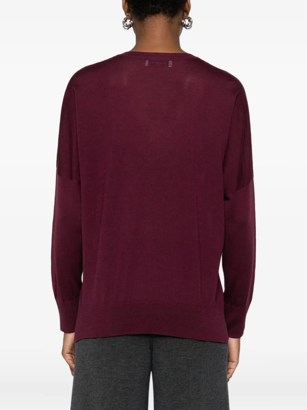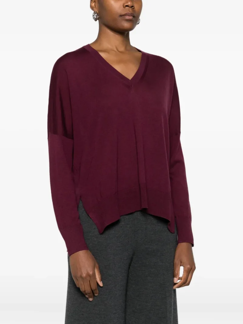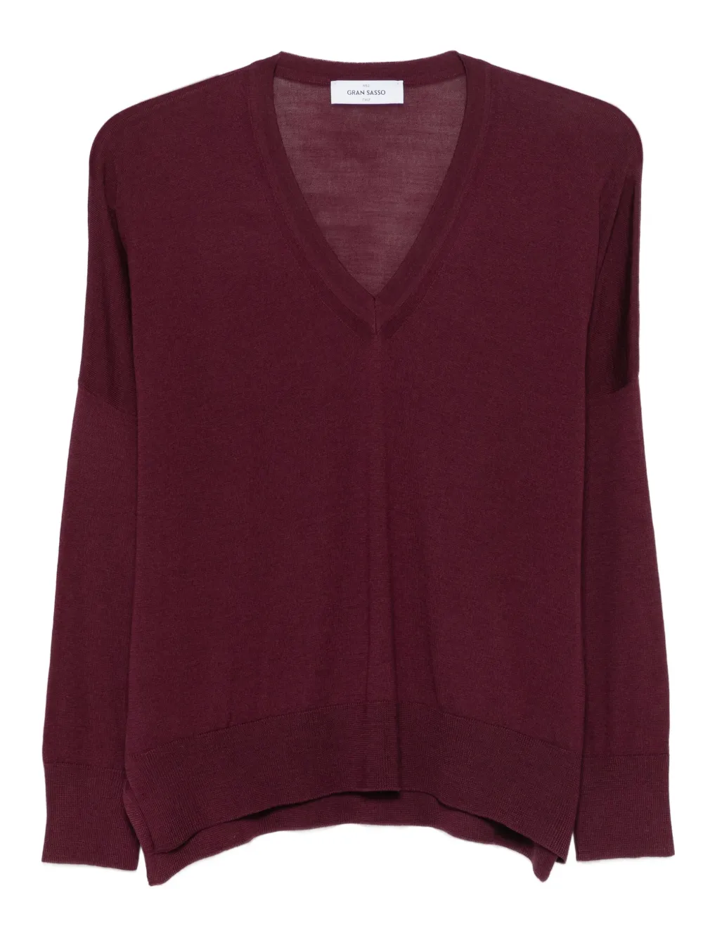 Pulover Gran Sasso V-neck visiniu, din lana, semitransparent, cu decolteu in V, umeri vcazuti, maneci lungi, slituri laterale si terminatii ribbed. Potrivit pentru sezonul toamna/iarna. 100% lana.