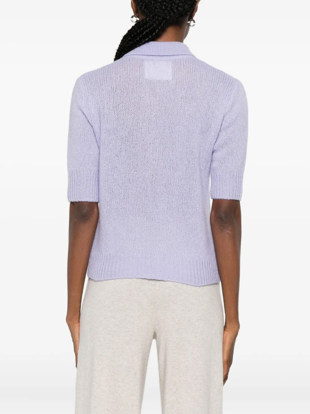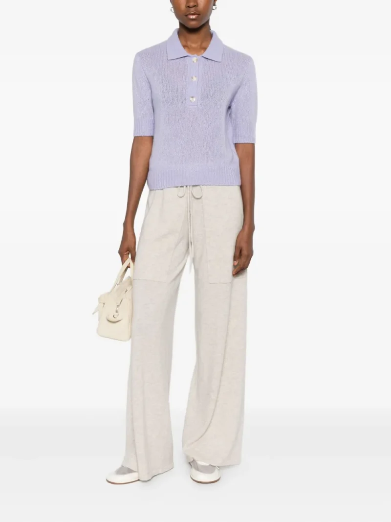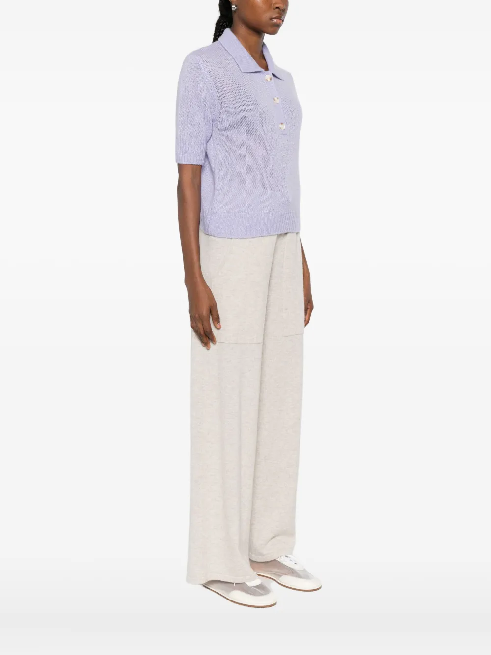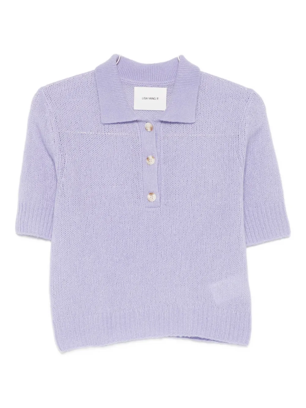 Pulover Lisa Yang Masy Buttoned Polo violet, tricotat din casmir si matase, cu guler polo, inchidere partiala cu nasturi, maneci scurte si terminatii ribbed. Potrivit pentru sezonul toamna/iarna. 77% casmir; 23% matase.
