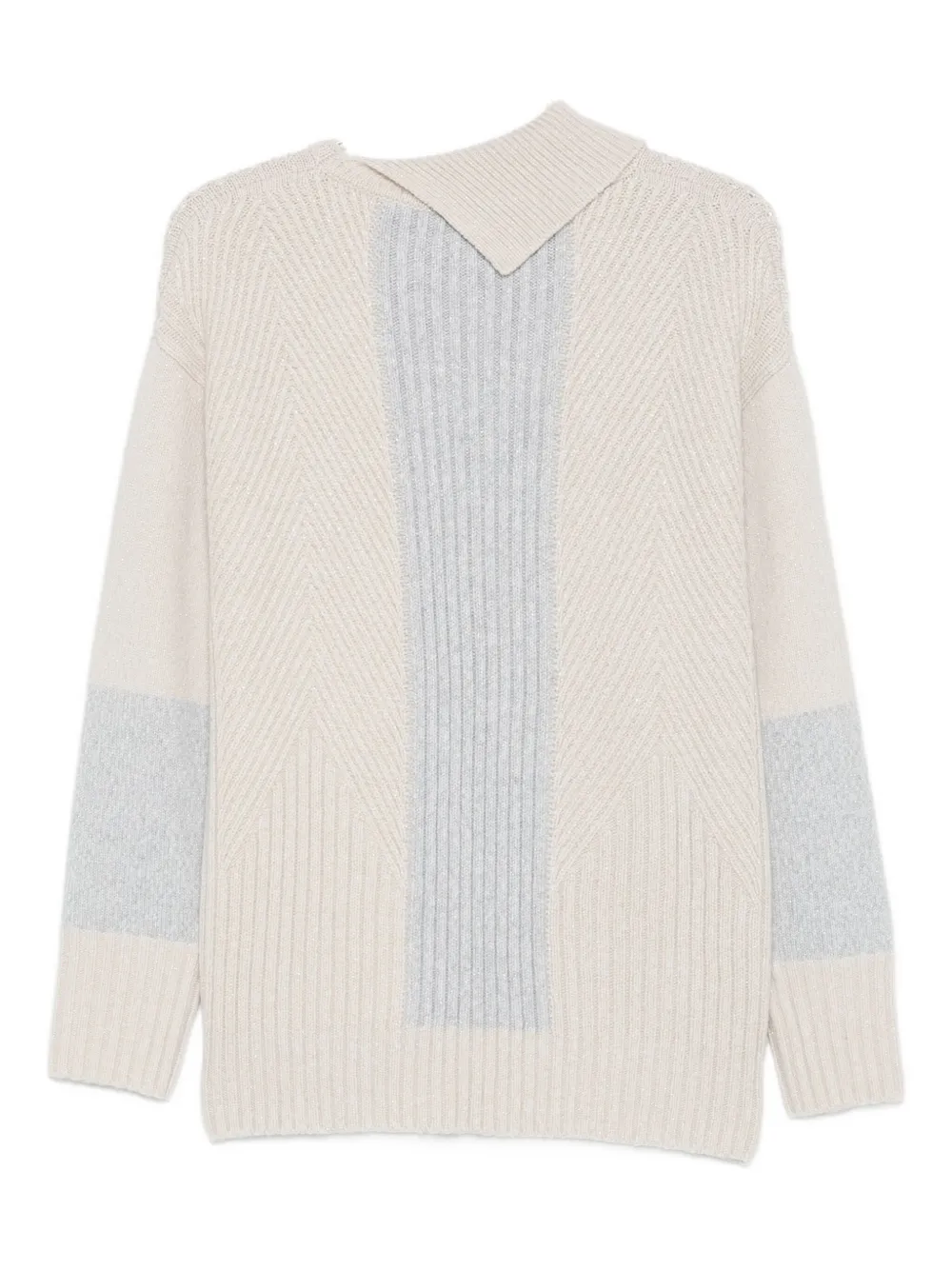 Pulover Lorena Antoniazzi Chevron-Pattern bej, color-block, cu guler inalt asimetric, maneci lungi, tesatura chevron si terminatii ribbed. Potrivit pentru sezonul toamna/iarna. 2% poliester; 7% viscoza; 76% lana; 4% casmir; 10% nailon; 1% cauciuc.