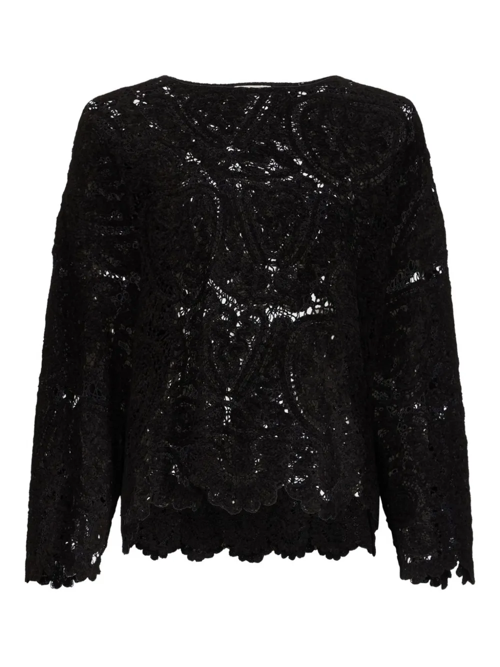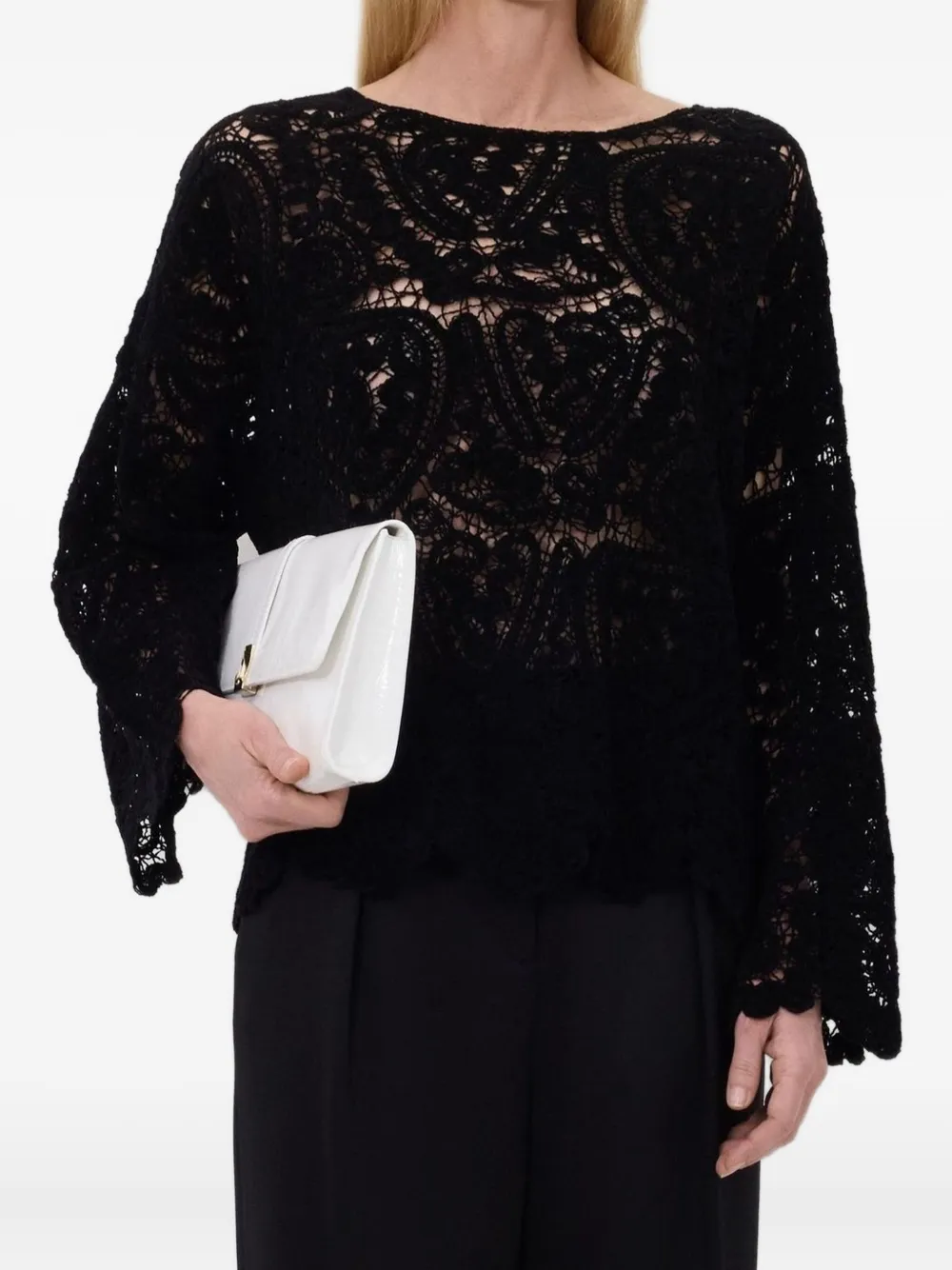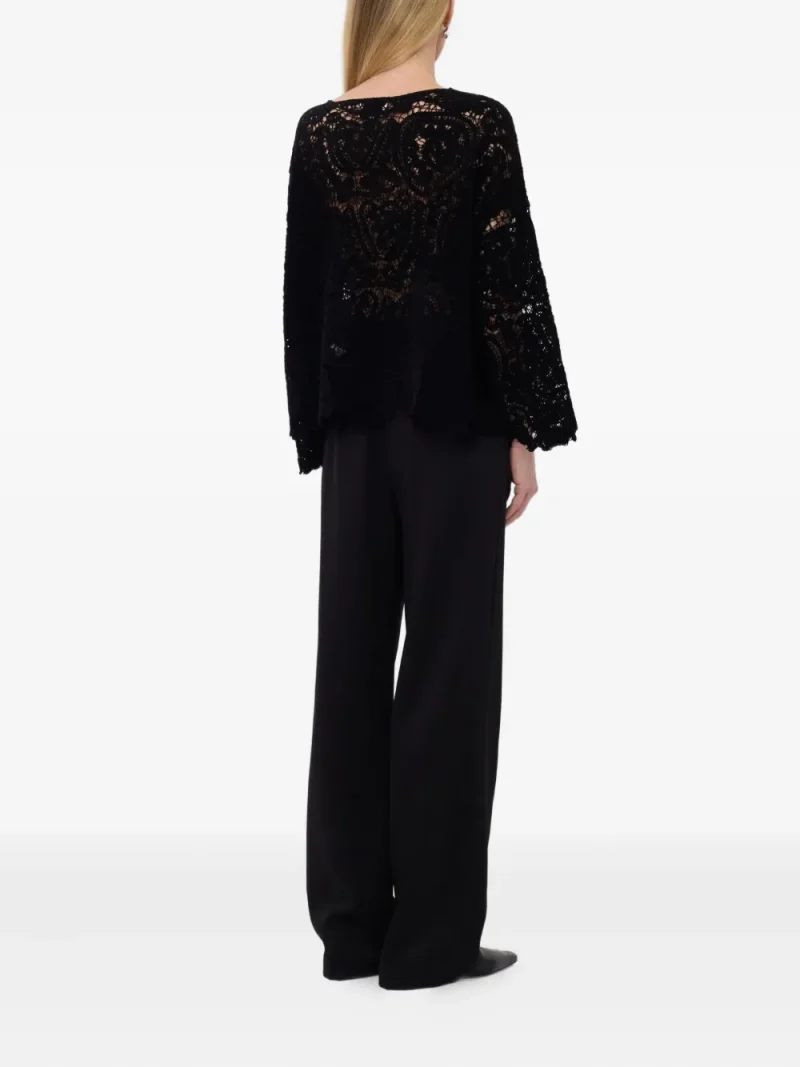 Pulover LouLou de Saison Crochet Lace negru, realizat din dantela de matase catifelata, cu maneci lungi, croiala ampla si terminatii feston. Potrivit pentru sezonul toamna/iarna. 100% matase.