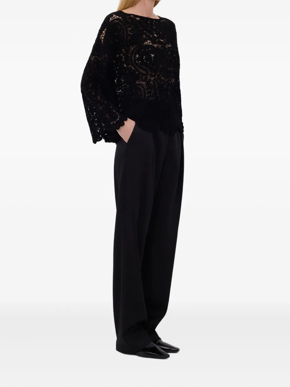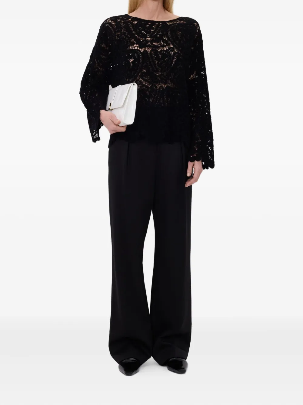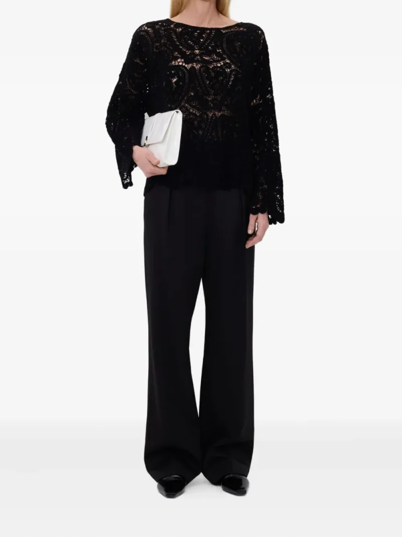 Pulover LouLou de Saison Crochet Lace negru, realizat din dantela de matase catifelata, cu maneci lungi, croiala ampla si terminatii feston. Potrivit pentru sezonul toamna/iarna. 100% matase.
