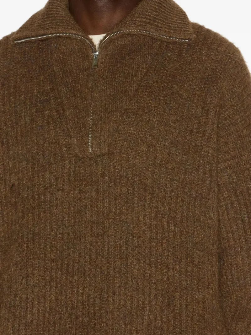 Pulover Marant Dinan maro, cu guler spread, inchidere partiala cu fermoar, maneci lungi, tesatura si terminatii ribbed. Potrivit pentru sezonul toamna/iarna. 57% bumbac; 14% poliamida; 13% alpaca; 11% acril ; 4% lana; 1% elastan.