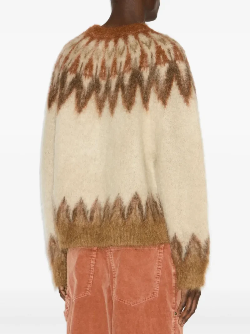 Pulover Marant Nicolas bej, tricotat din mix de materiale, cu guler crewneck, amneci lungi, grafica intarsia in tesatura si terminatii ribbed. Potrivit pentru sezonul toamna/iarna. 31% lana; 47% mohair; 22% poliamida.