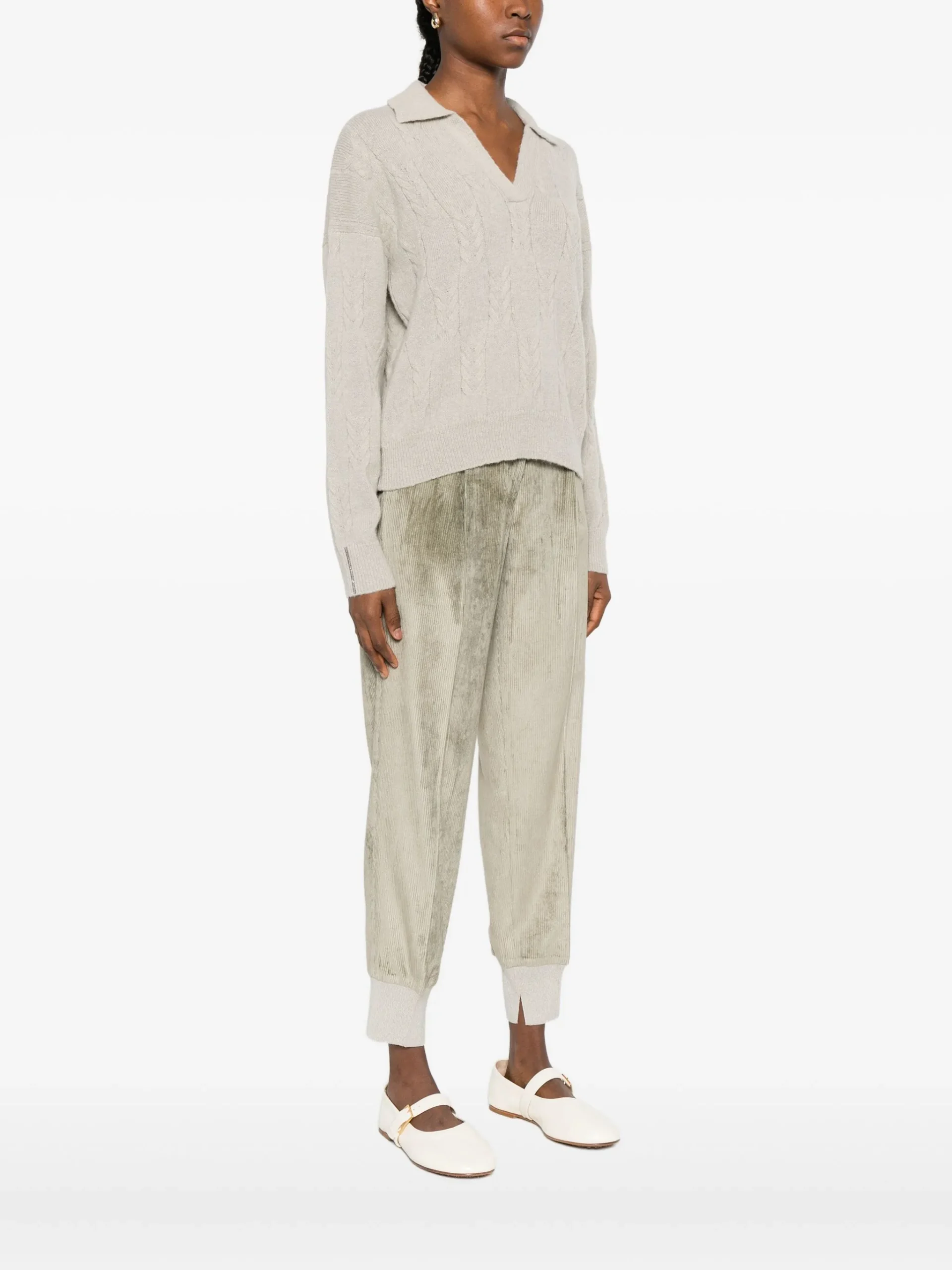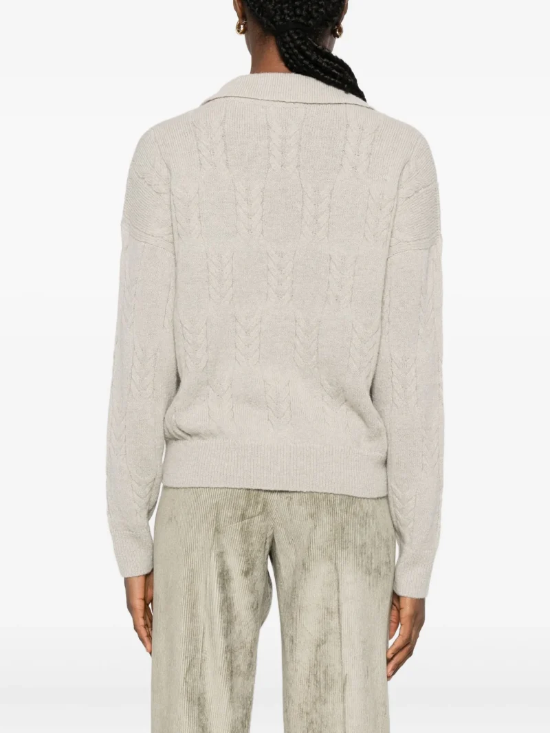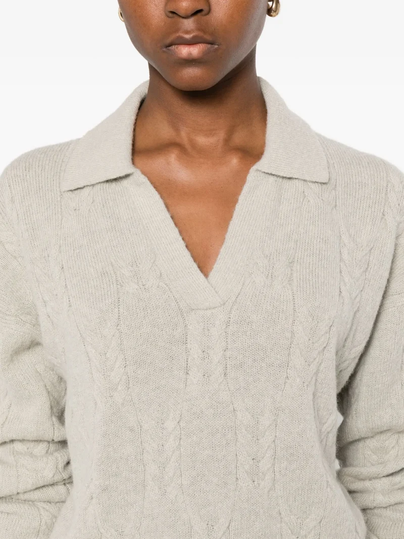 Pulover Peserico gri deschis, din tricot cable-knit, cu decolteu in V, maneci lungi si tiv ribbed. 60% alpaca 35% nylon 5% lana