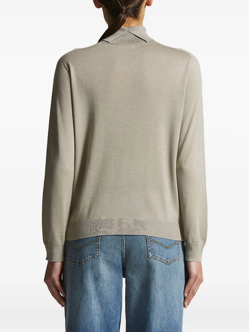 Pulover Peserico Zip-Detail Turtleneck khaki, din casmir, cu guler inalt, maneci lungi, mansete elastice, buzunar la piept decorat cu patele sclipitoare si tiv elastic drept. Potrivit pentru sezonul toamna/iarna. 70% casmir; 30% matase.