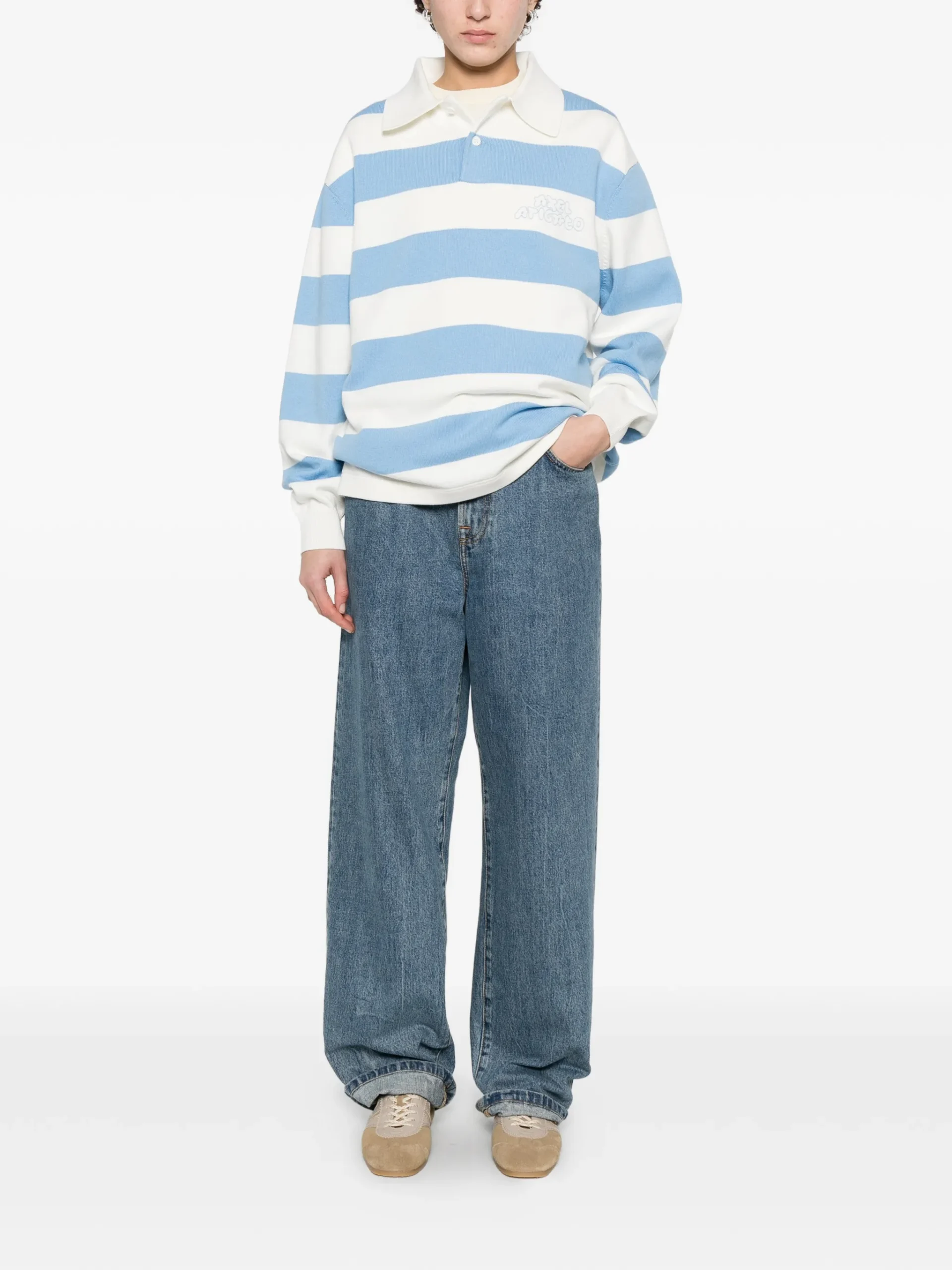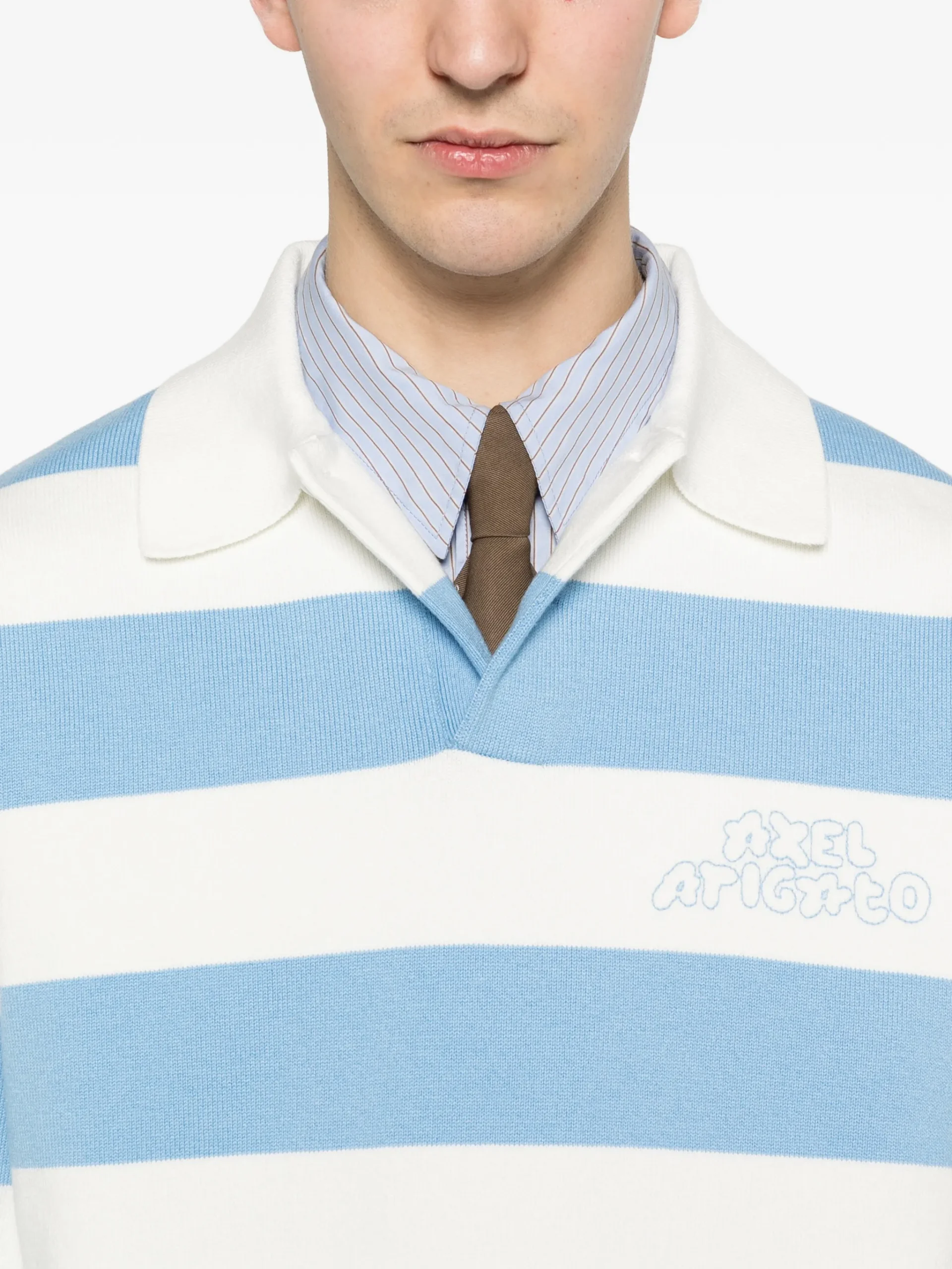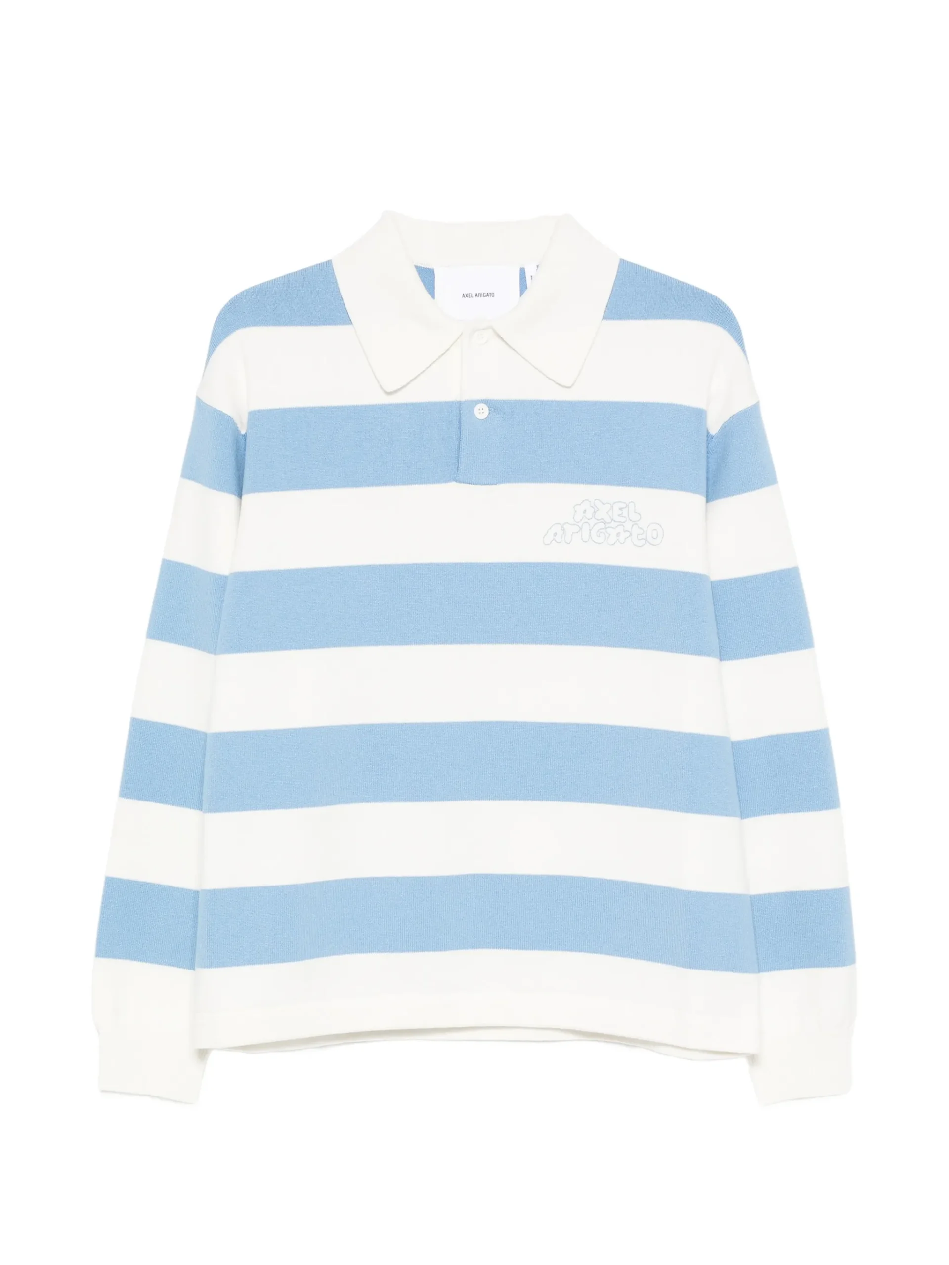 Pulover polo Axel Arigato alb/albastru, cu model in dungi, detaliu logo, maneci lungi, guler polo si inchidere cu nasturi. 50% lana 50% bumbac