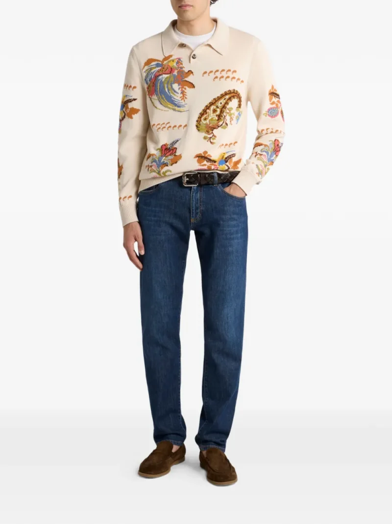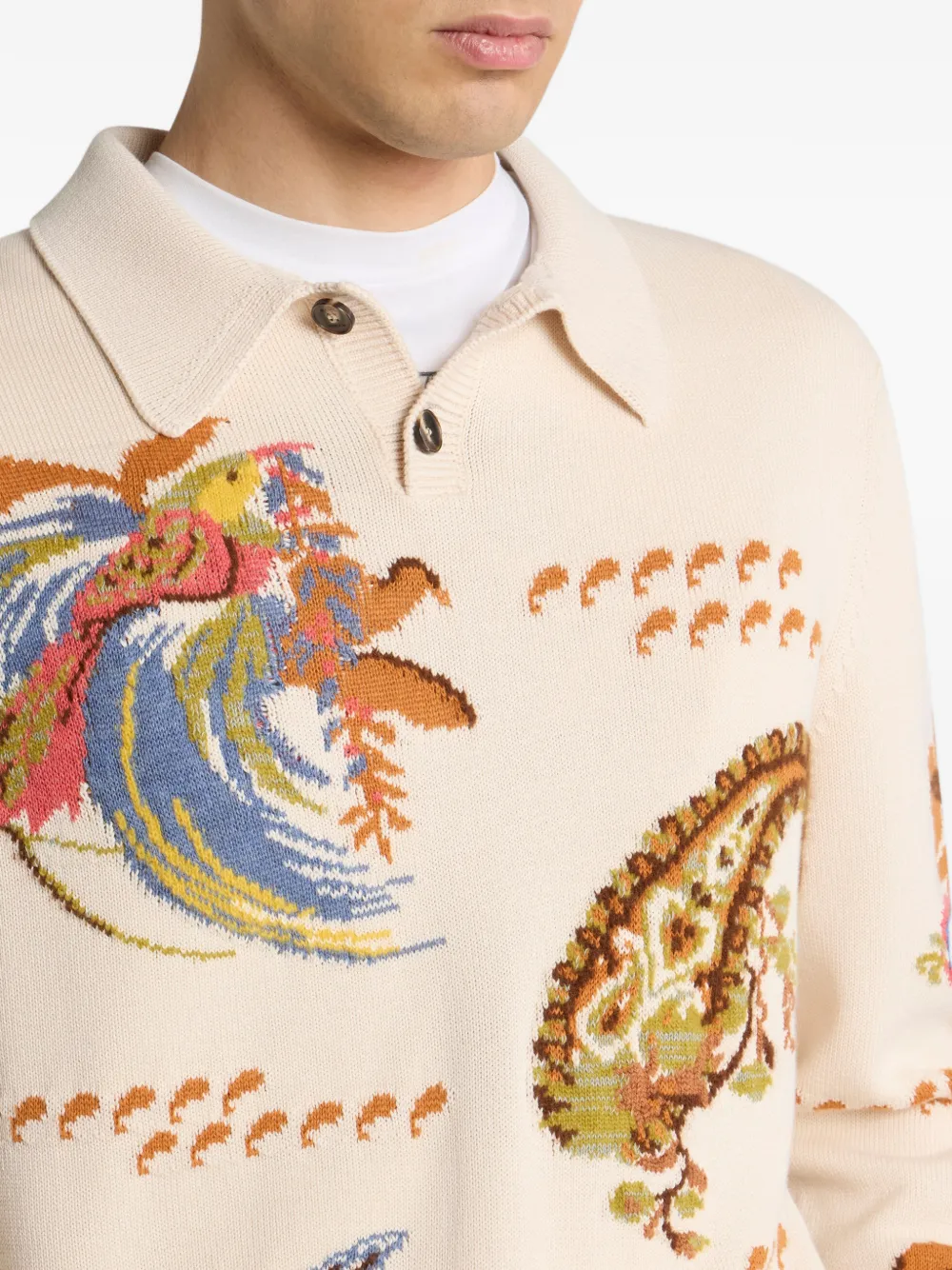 Pulover polo ETRO Jacquard bej, tricotat din bumbac si lana, cu guler clasic, inchidere partiala cu nasturi, maneci lungi, grafica Jacquard in tesatura si terminatii ribbed. Potrivit pentru sezonul primavara/vara. 88% bumbac; 12% lana.
