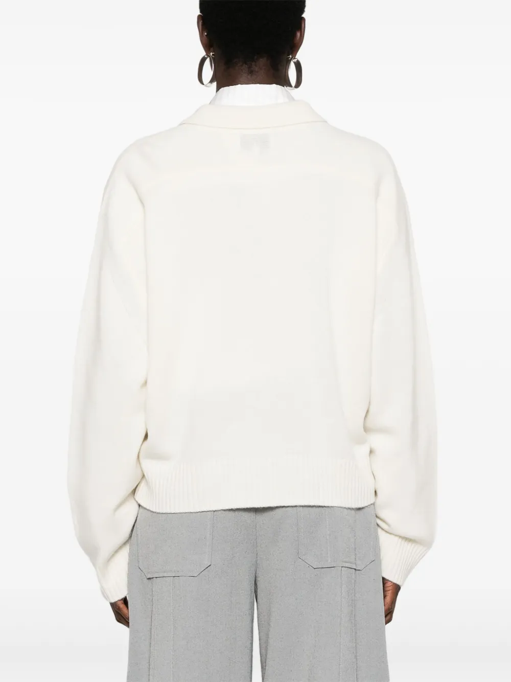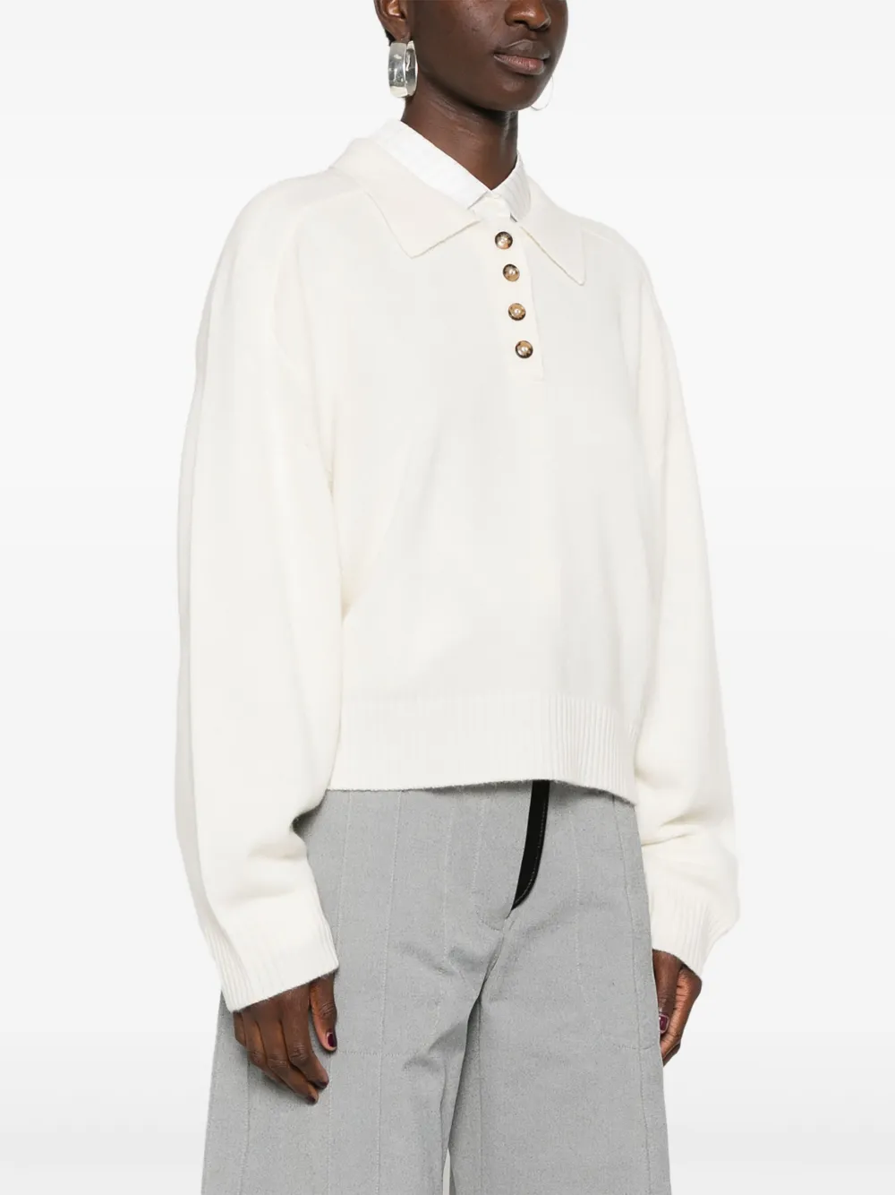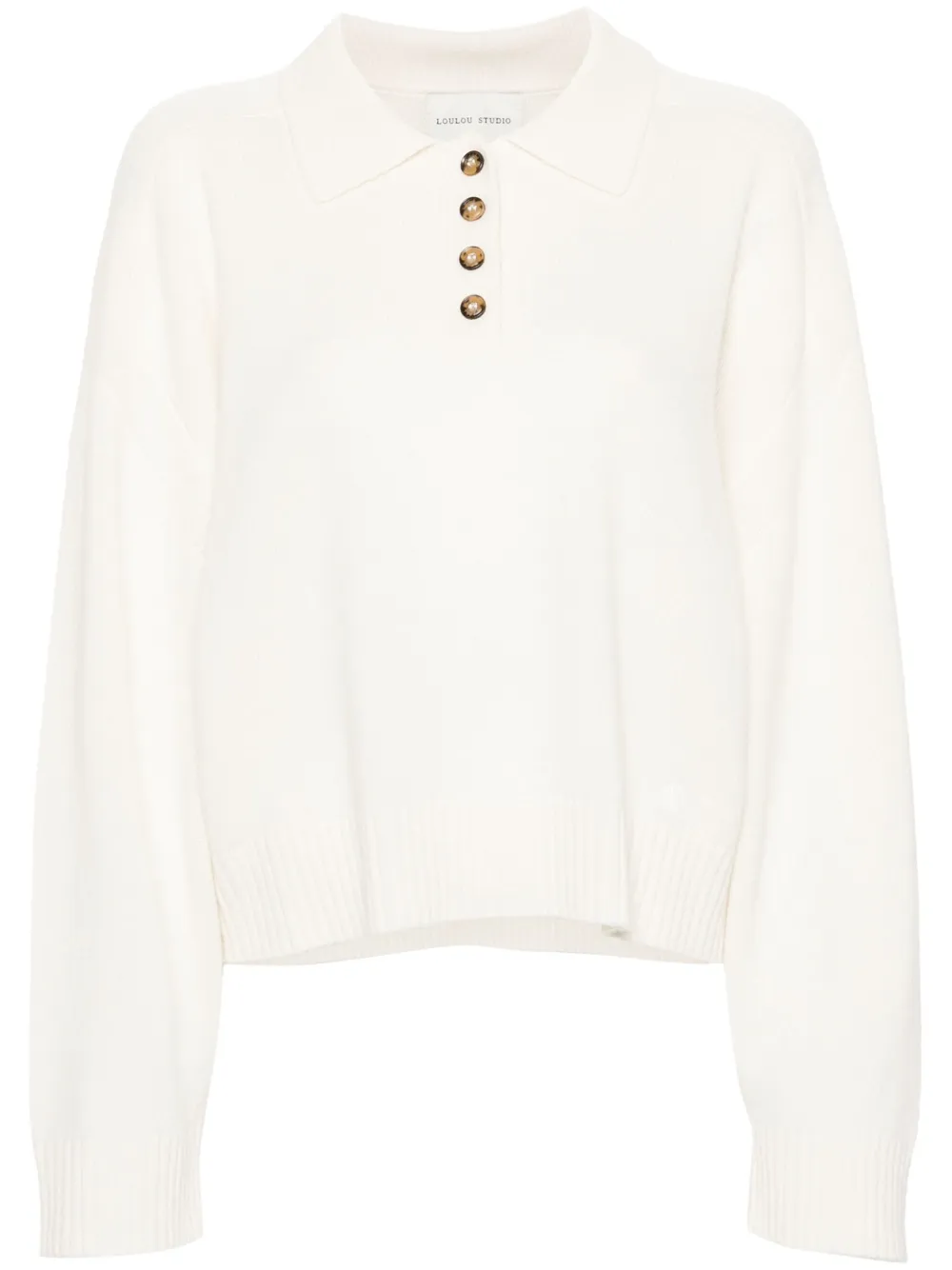 Pulover polo Loulou de Saison Homere alb, din casmirm cu guler polo, inchidere partiala cu nasturi, umeri cazuti, maneci lungi, mansete si tiv ribbed. Potrivit pentru sezonul primavara/vara. 100% casmir.