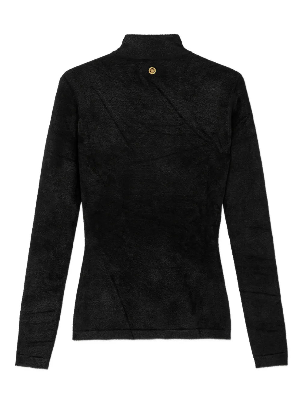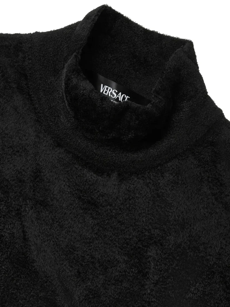 Pulover Versace high-neck embellished negru, guler ridicat, maneci lungi, fleece texturat, logo Versace metalic aplicat pe partea din spate. 63% vascoza 37% nylon