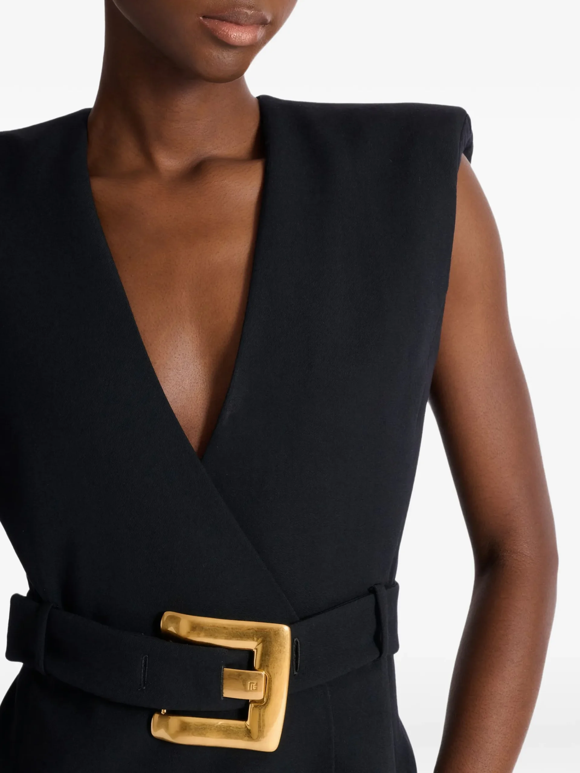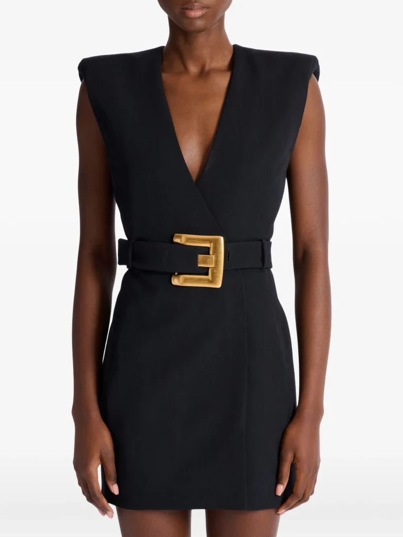 Rochie Balmain belted neagra, din lana, cu decolteu in stil crossover, talie cu centura si catarama aurie, fara maneci si design tip wrap. 100% lana