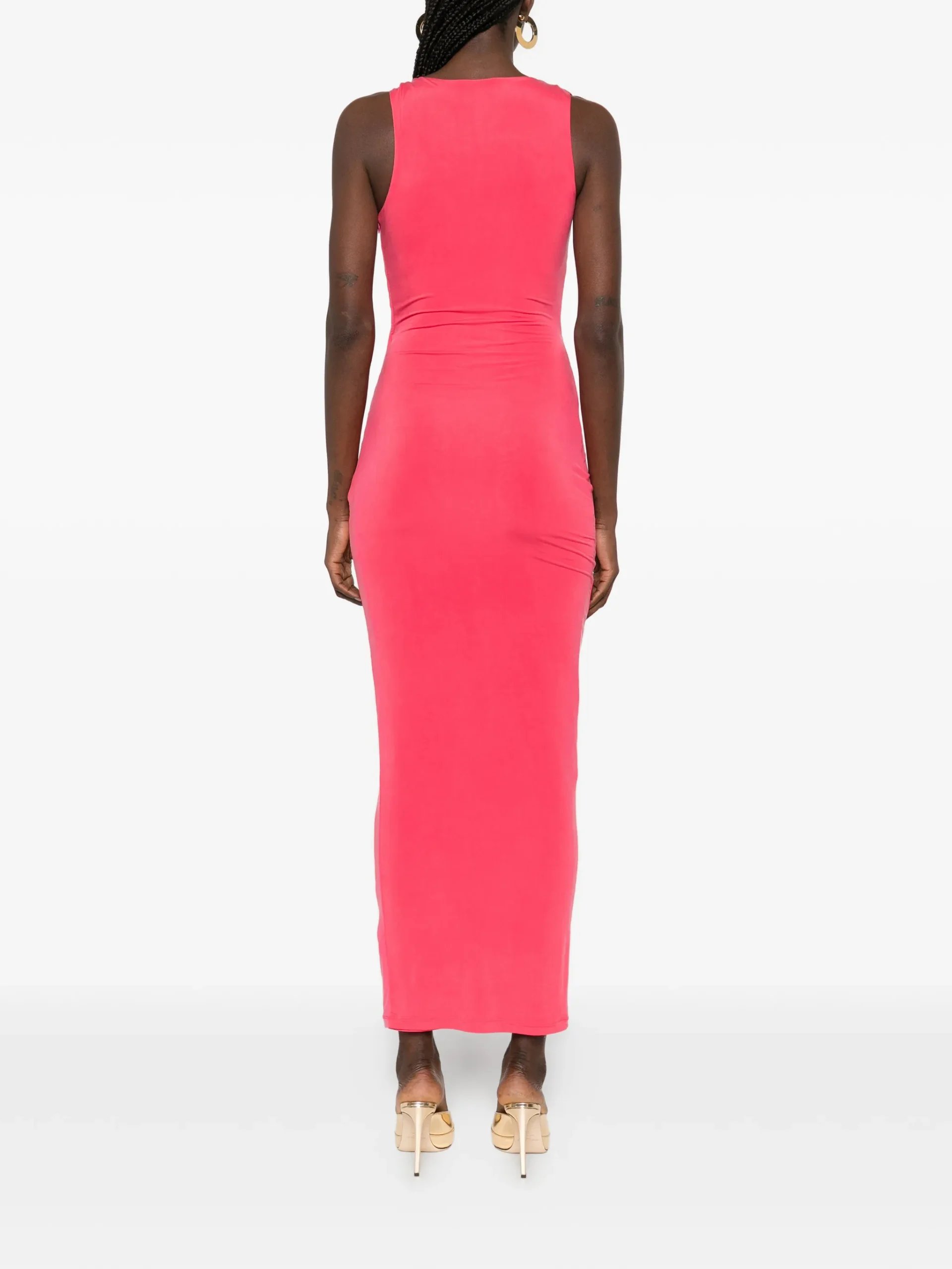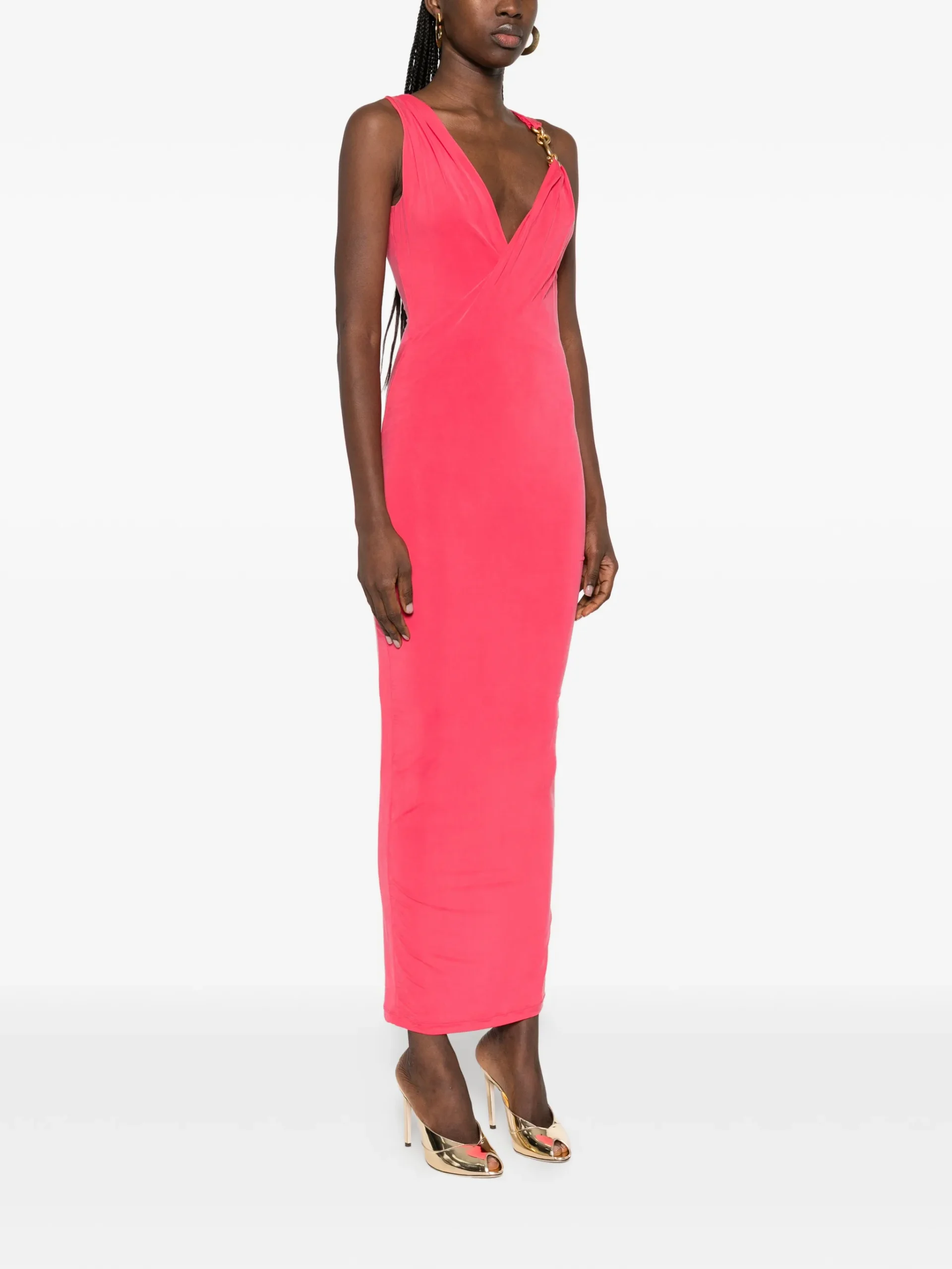 Rochie Balmain draped-effect sleeveless roz, fara maneci, efect drapat, detalii aurii, decolteu in V.93% cupru 7% elastan