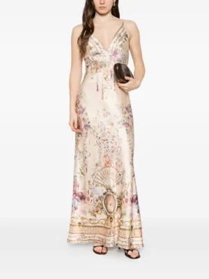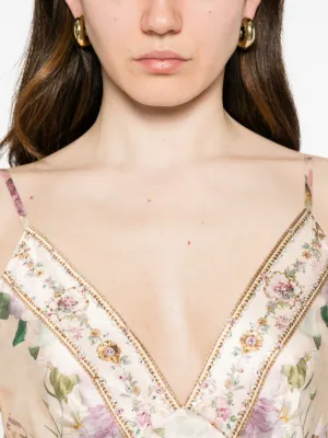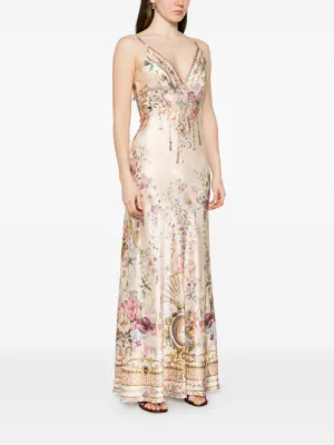 Rochie Camilla Adorned In Aranjuez Floral-Print Crystal-Embellished bej, realizata din matase, cu barete pentru umeri tip spaghetti, decolteu in V, spatele gol, grafica florala imprimata, cristale sclipitoare aplicate si tiv drept. Potrivita pentru sezonul primavara/vara. 100% matase