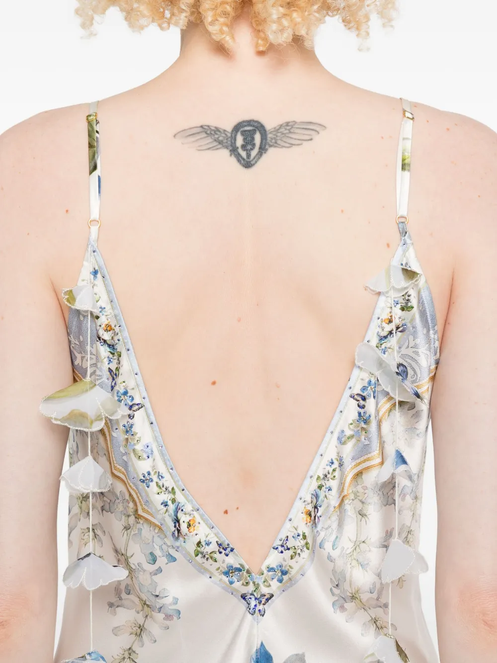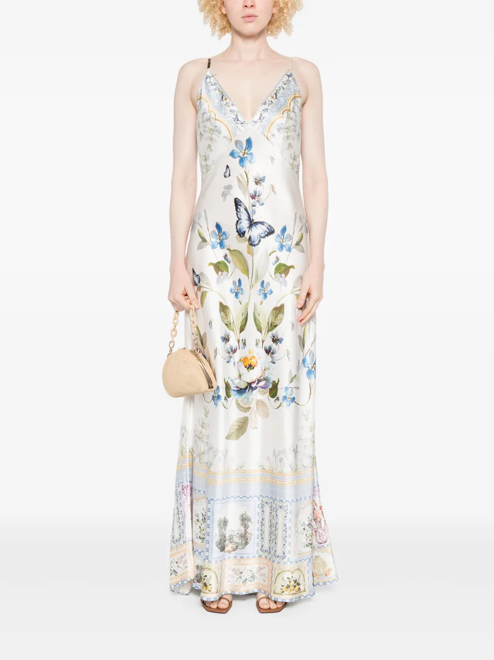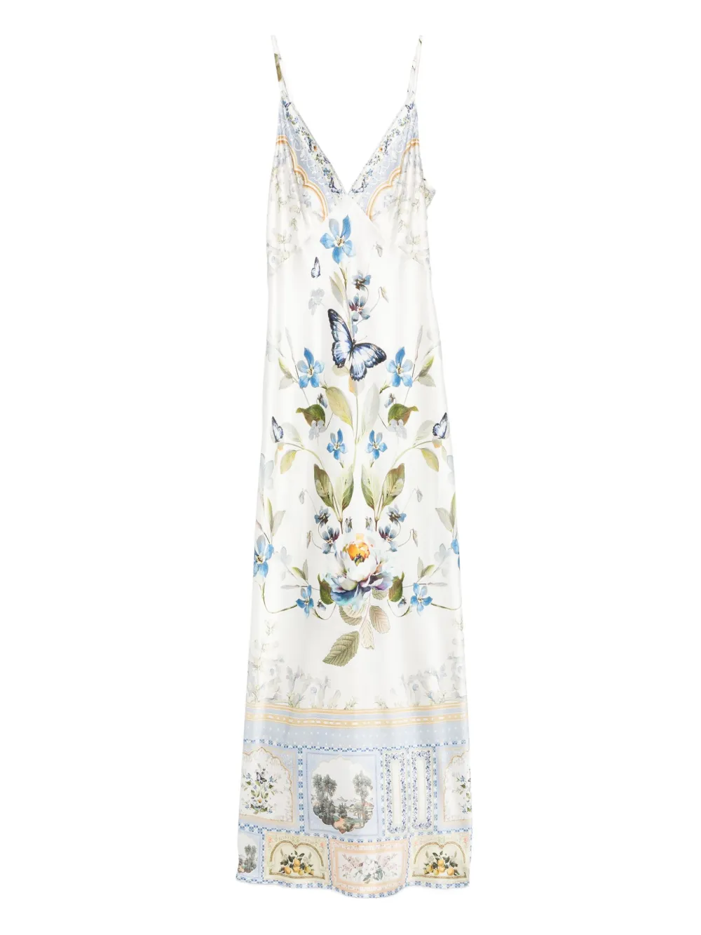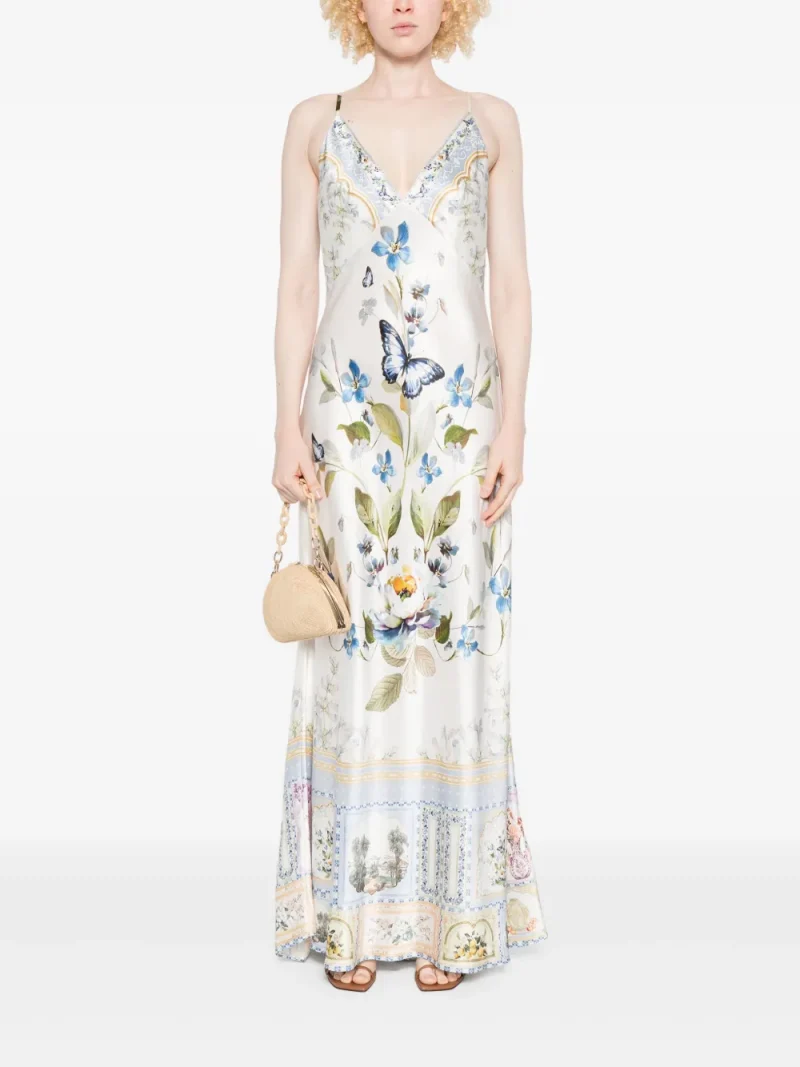 Rochie Camilla Butterfly Floral Print Silk multicolor, din matase satina, cu barete subtiri pentru umeri, decolteu si spatele gol in V, grafica florala imprimata si tiv drept. Potrivita pentru sezonul toamna/iarna. 100% matase.