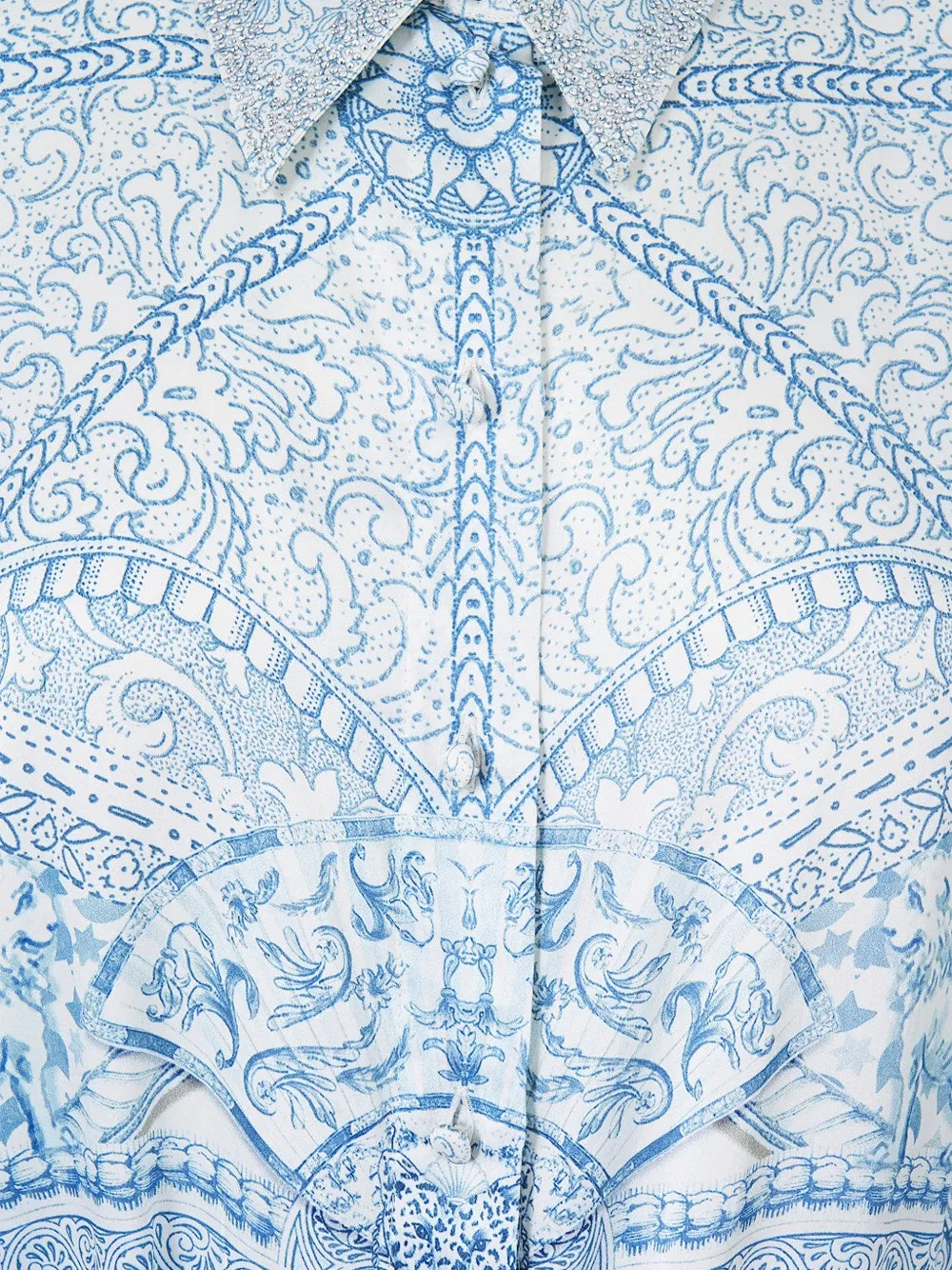 Rochie Camilla Buttoned Shirt albastru, realizata din matase, cu guler clasic, inchidere cu nastuti ascunsi, maneci lungi, grafica Alhambra imprimata, cordon in jurul taliei si tiv curbat. Potrivita pentru sezonul primavara/vara. 100% matase.