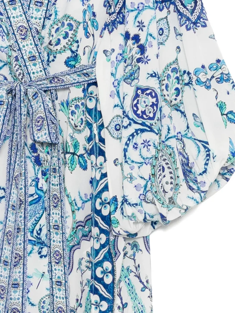 Rochie Camilla Isnik Lullaby Cape albastru, din matase, tip kimono, cu maneci medii bufante, inchidere cordon, grafica Camilla imprimata, cristale sclipitoare aplicate si tiv drept. Potrivita pentru sezonul toamna/iarna. 100% matase.