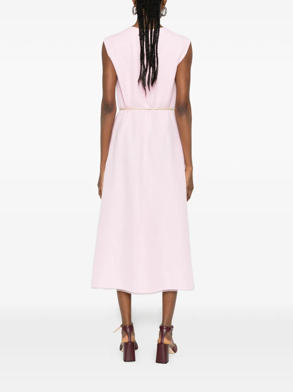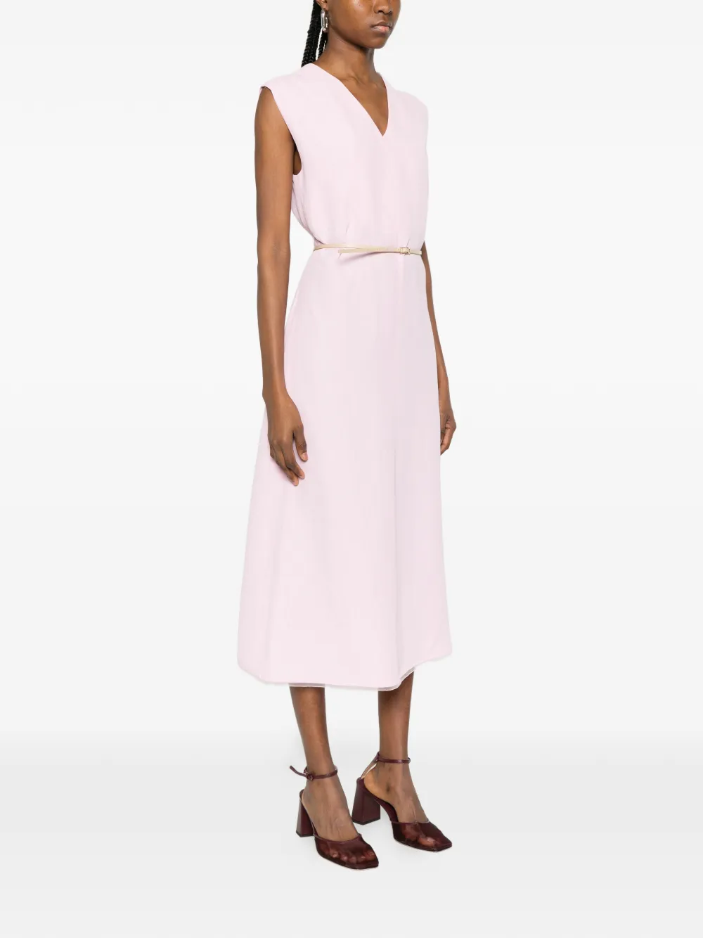 Rochie Fabiana Filippi V-neck Belted roz, realizata din viscoza, cu guler in V, fara maneci, buzunare laterale, croiala A-line, curea integrata si tiv drept. Potrivita pentru sezonul primavara/vara. 64% viscoza; 36% in.