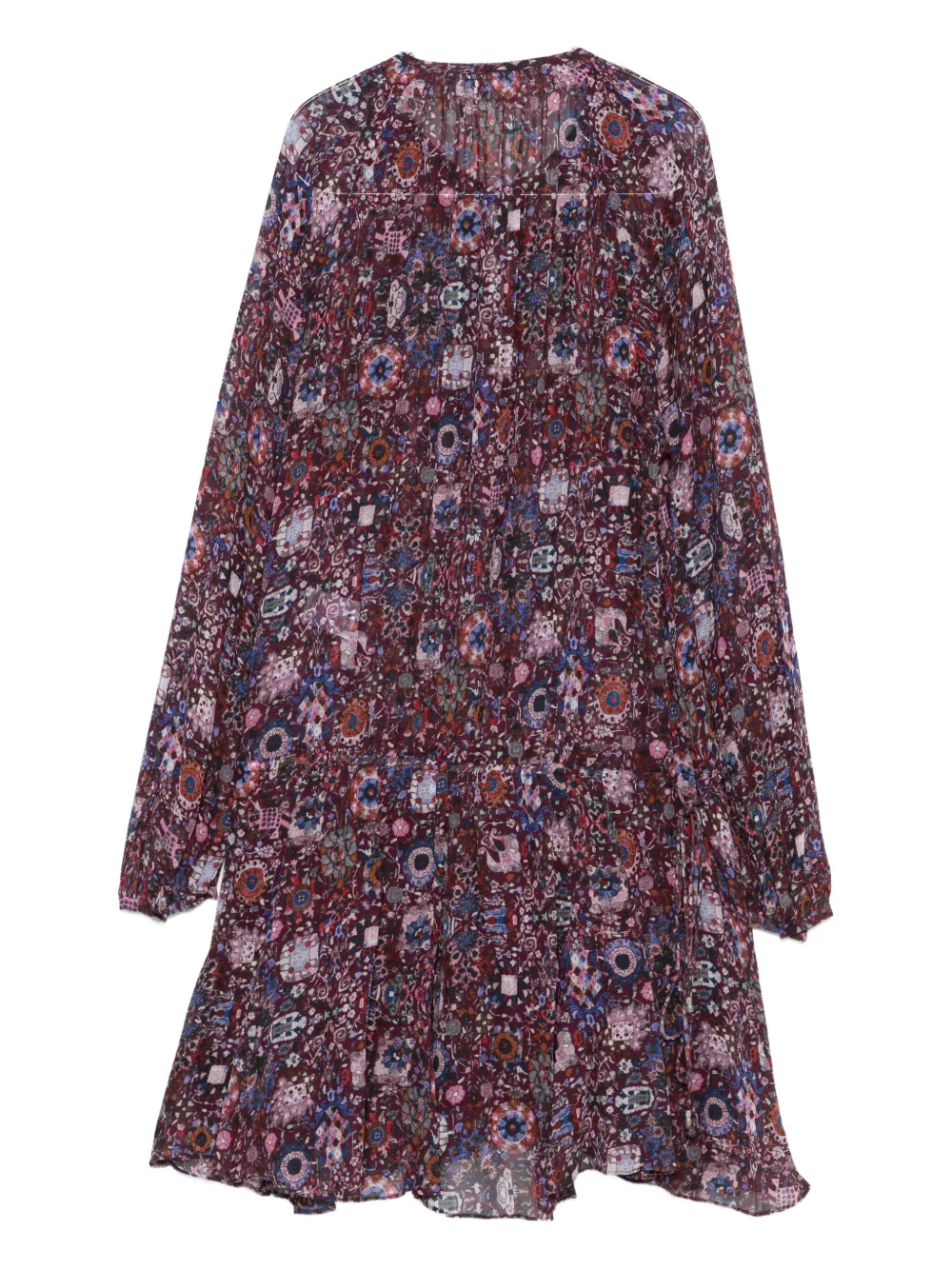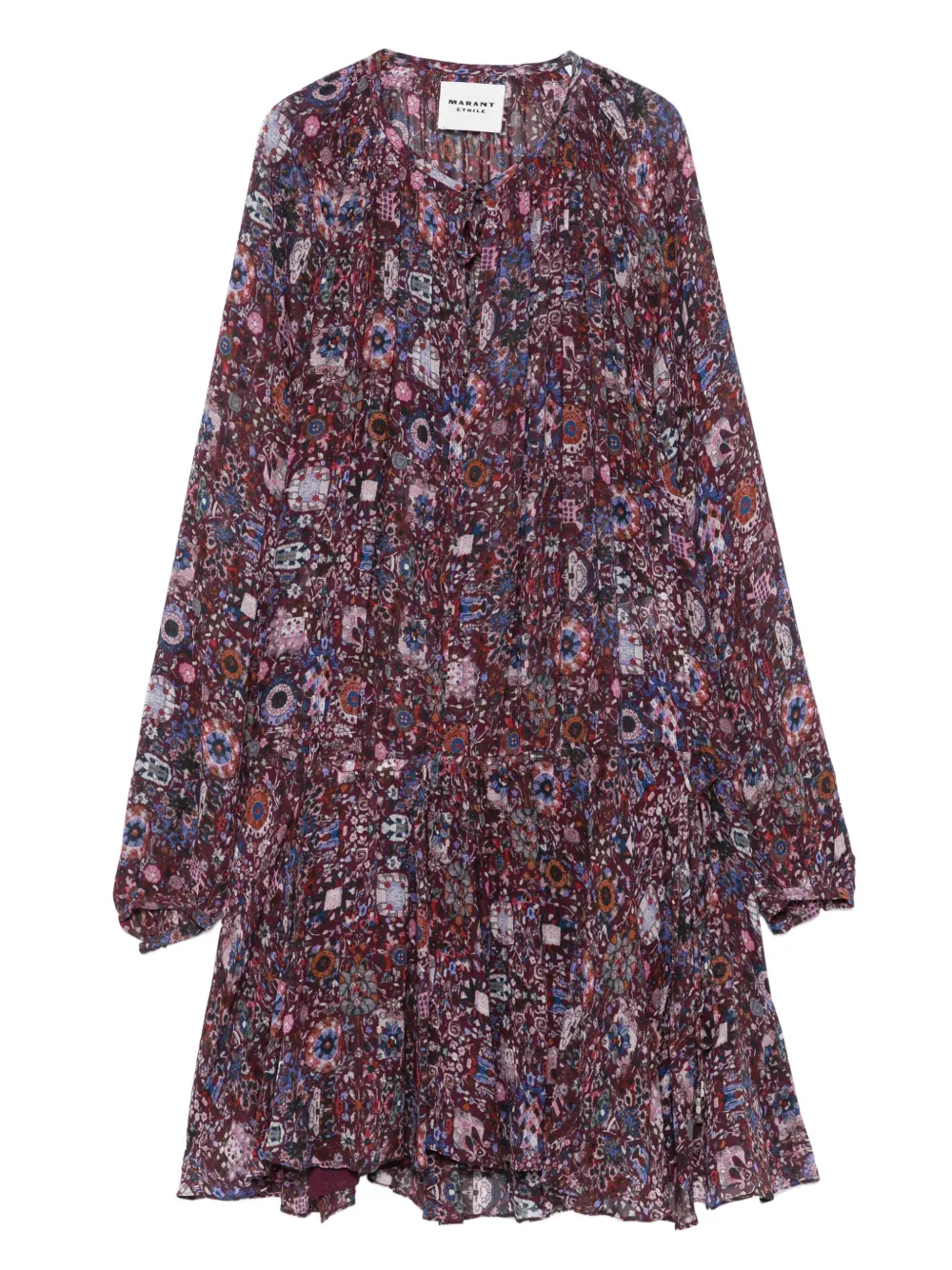 Rochie Marant Etoile Bess Floral-Print visiniu, din viscoza, cu guler rotund si inchidere snur, maneci lungi bufante, grafica florala imprimata si tiv evazat. Potrivita pentru sezonul toamna/iarna. 100% viscoza.