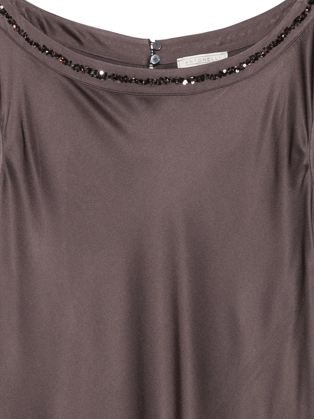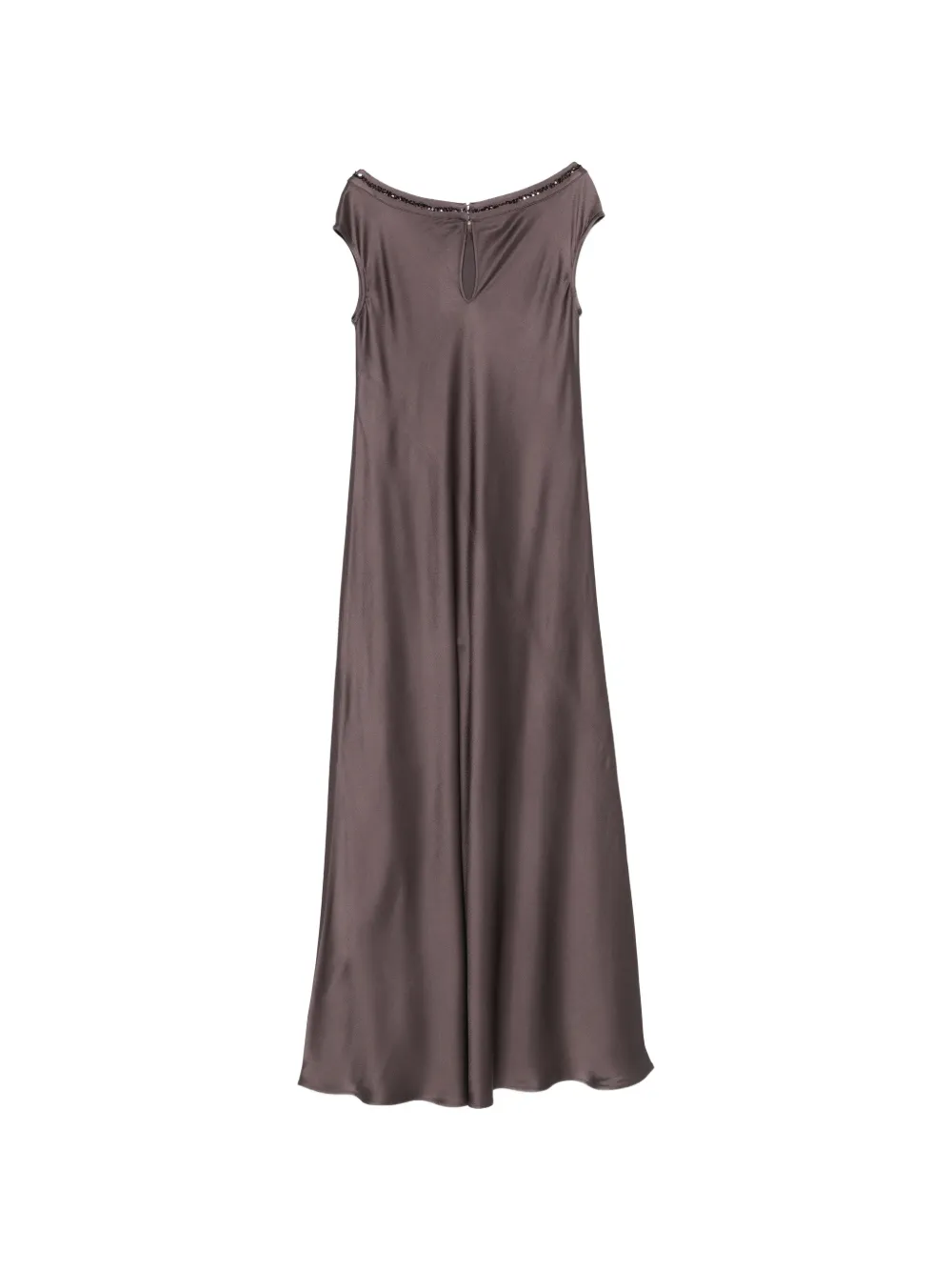 72Rochie maxi Antonelli Maxwell violet, cu spect satinat, guler barcuta decorat cu cristale, maneci scurte, lungime maxii si tiv evazat. Potrivita pentru sezonul primavara/vara. 72% acetat; 28% viscoza.
