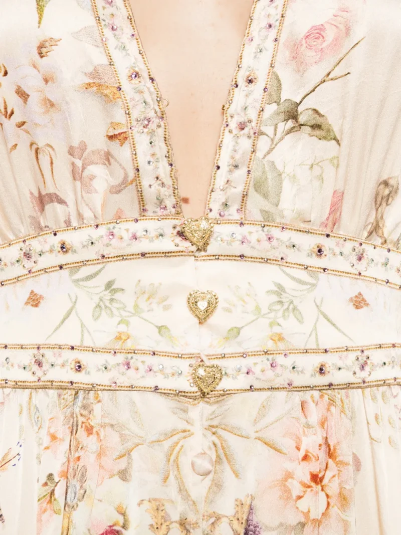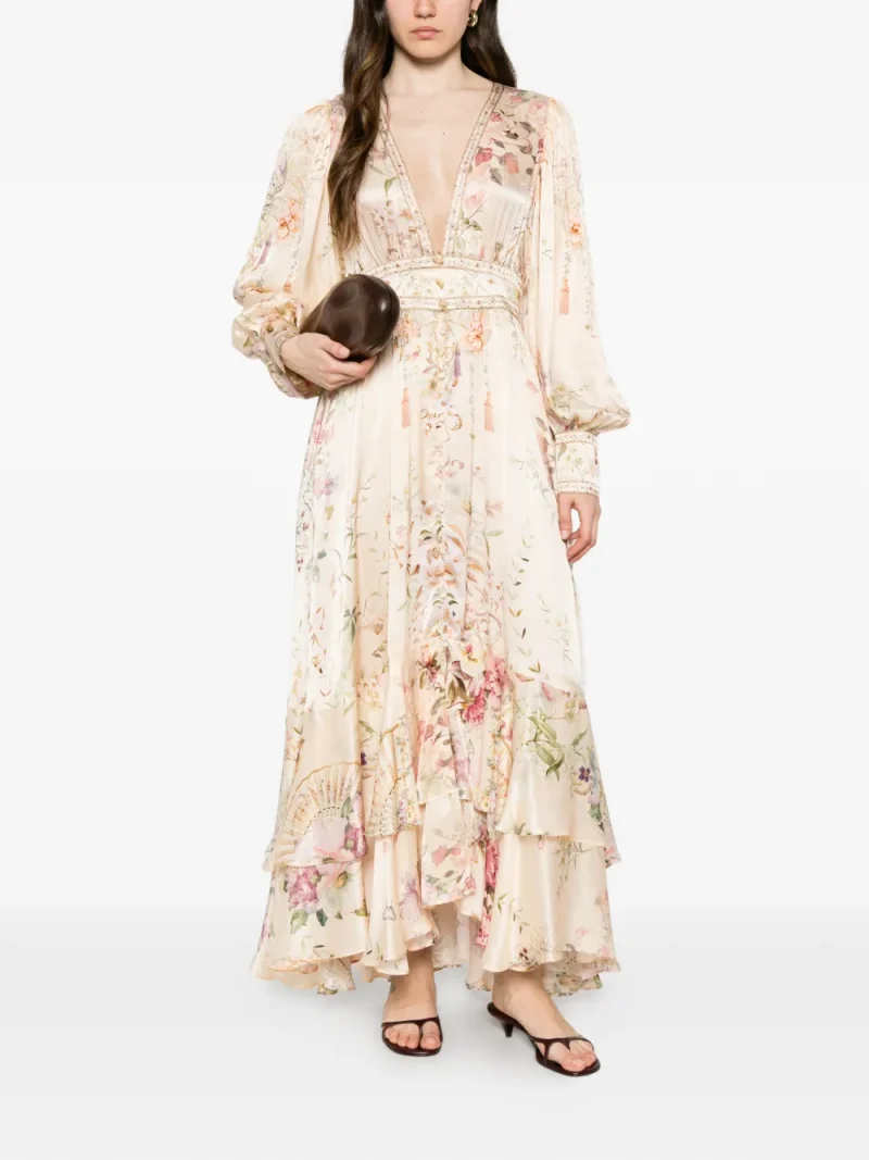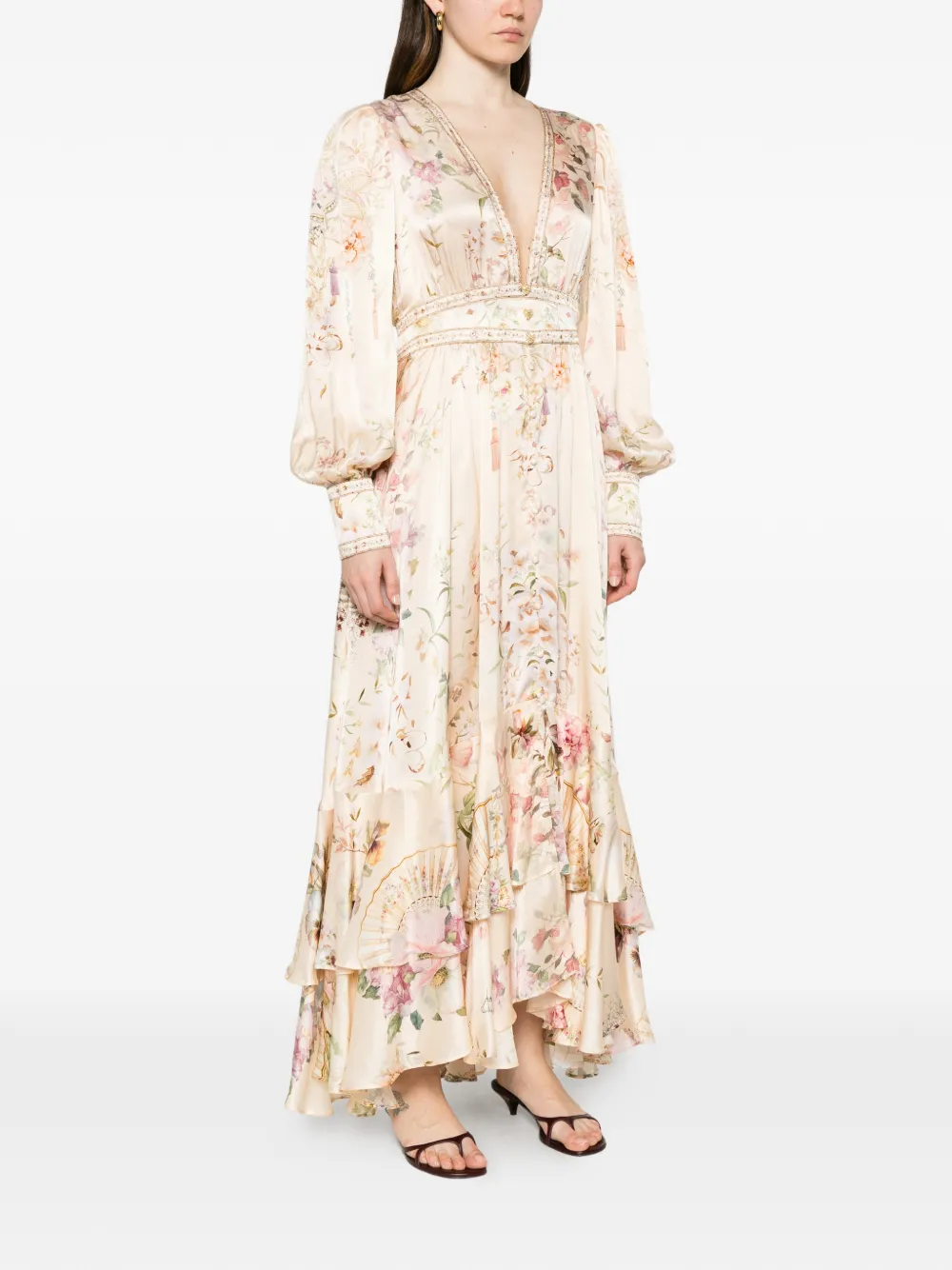 Rochie maxi Camilla Adorned In Aranjuez Floral-Print bej, realizata din matase, cu decolteu in V decorat cu cristale sclipitoare, maneci lungi bufante, mansete late, terminatii in volane si grafica florala discreta. Potrivita pentru sezonul primavara/vara. 100% matase.