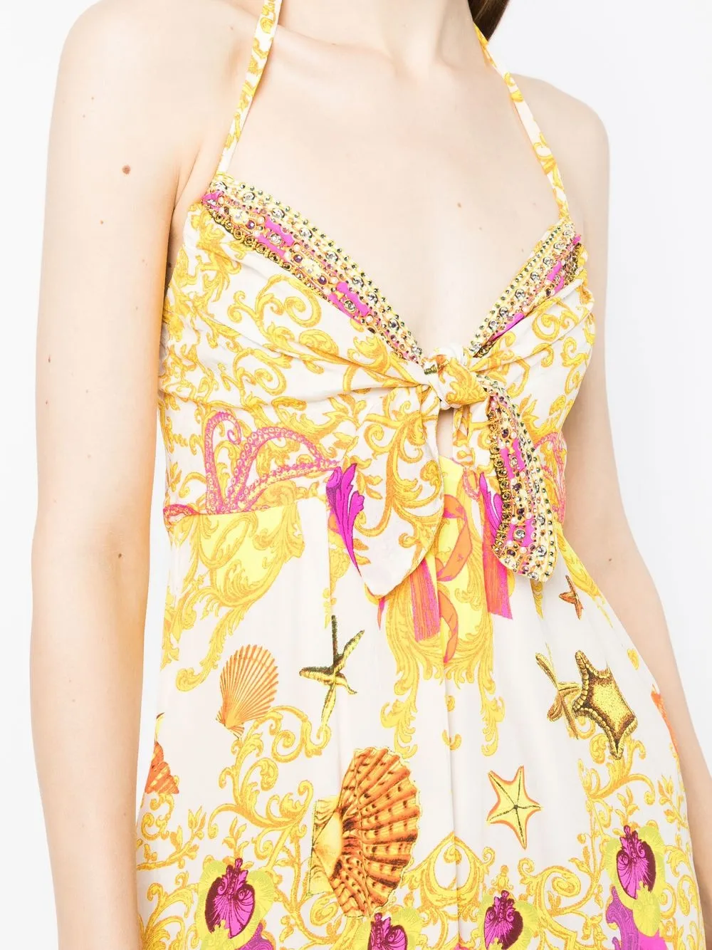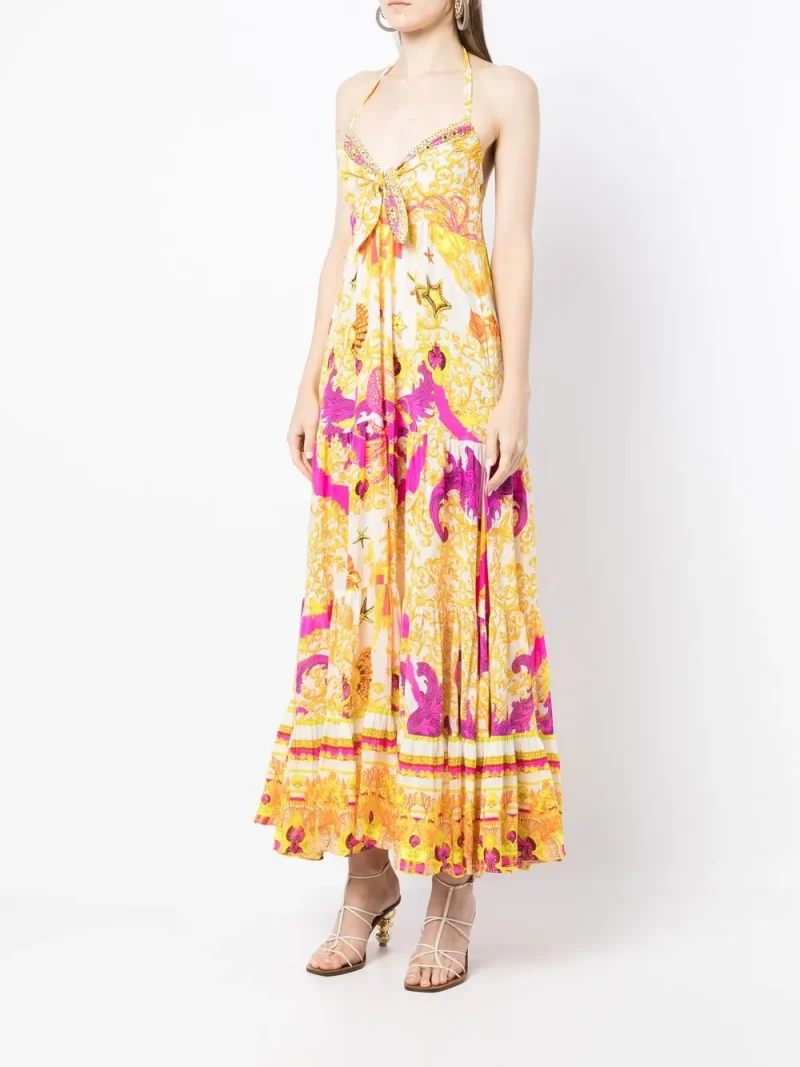 Rochie maxi Camilla Graphic-Print Halterneck multicolor, din matase, inchidere cu snur, spatele gol, detaliu nod, grafica imprimata pe toata suprafata, croiala evazata si tiv drept. Potrivita pentru sezonul primavara/vara. 100% matase.