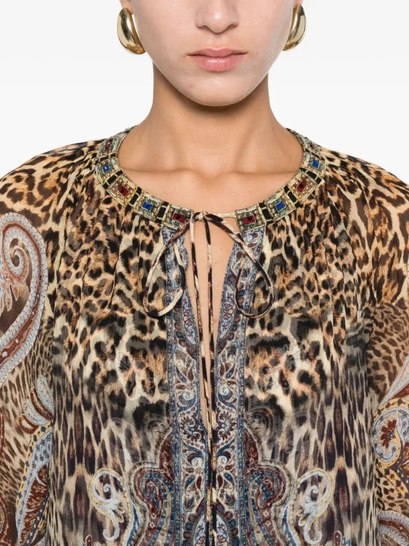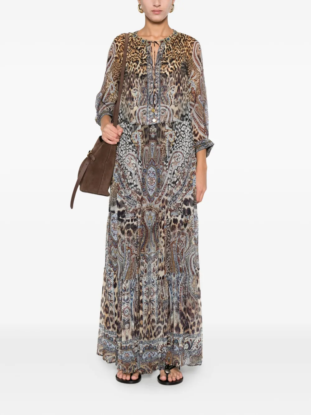 Rochie maxi Camilla Istanbul Animalia maro, design drapat, din matase, cu guler rotund si inchidere cu snur, maneci medii, grafica animal print imprimata pe toata suprafata, croiala evazata si tiv cu volan. Potrivita pentru sezonul toamna/iarna. 100% matase.