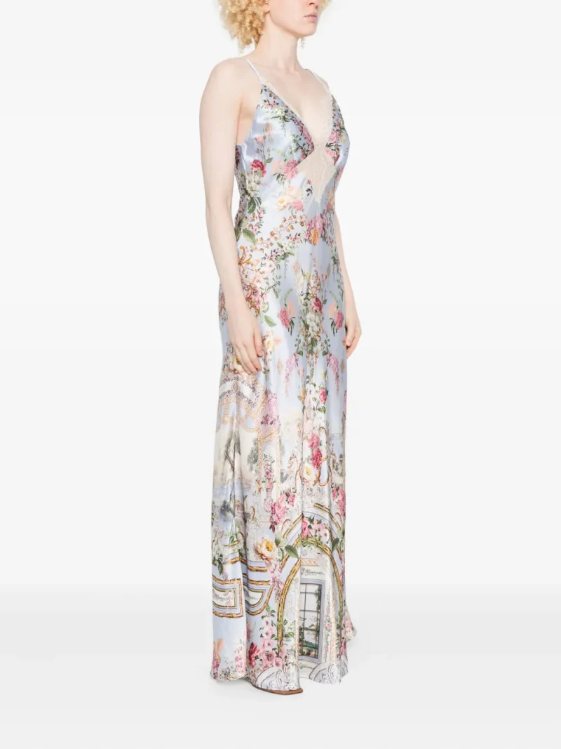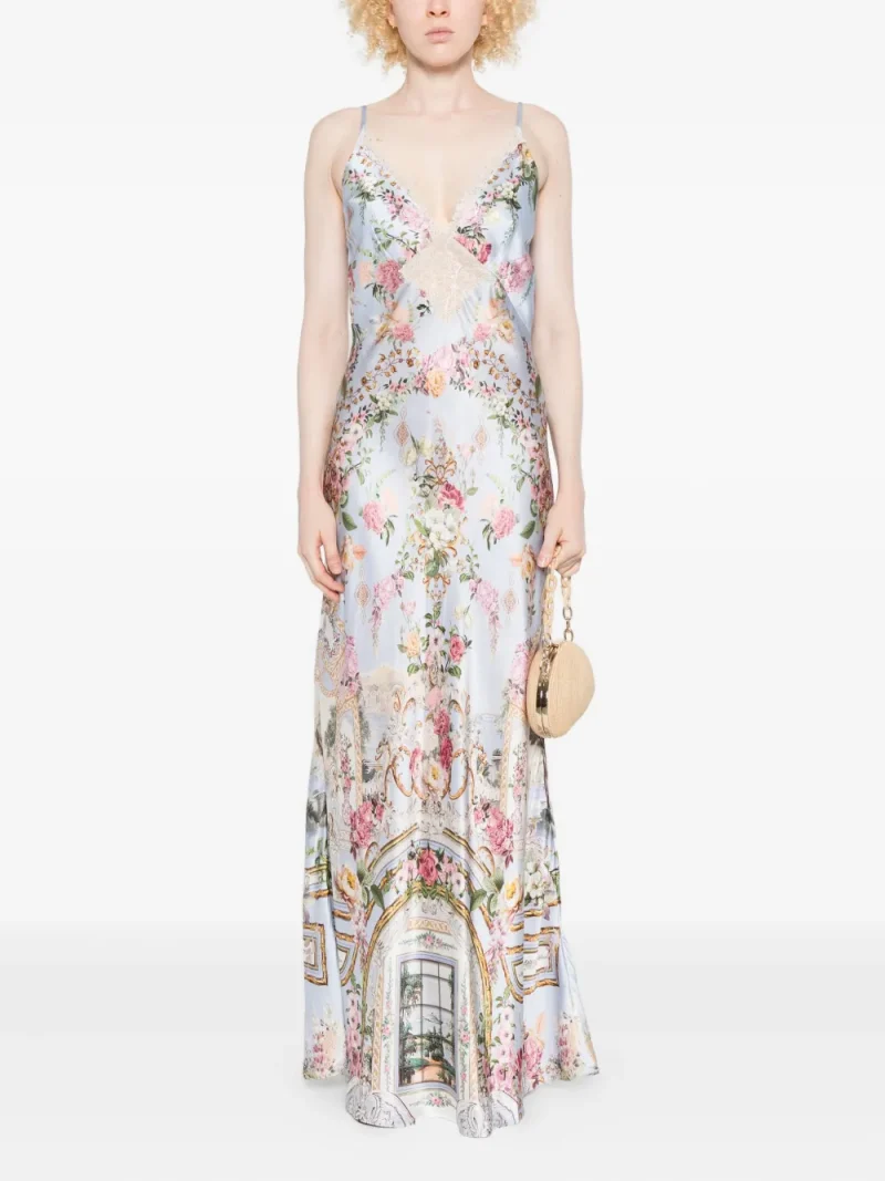 Rochie maxi Camilla Lace-Trim Floral-Print multicolor, cu barete subtiri pentru umeri, decoltu in V, spatele gol, insertii din dantela, grafica florala si tiv drept. Potrivita pentru sezonul toamna/iarna. 100% matase.