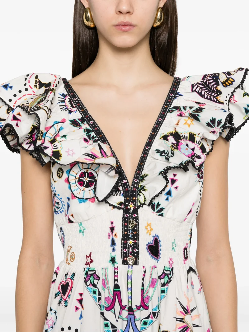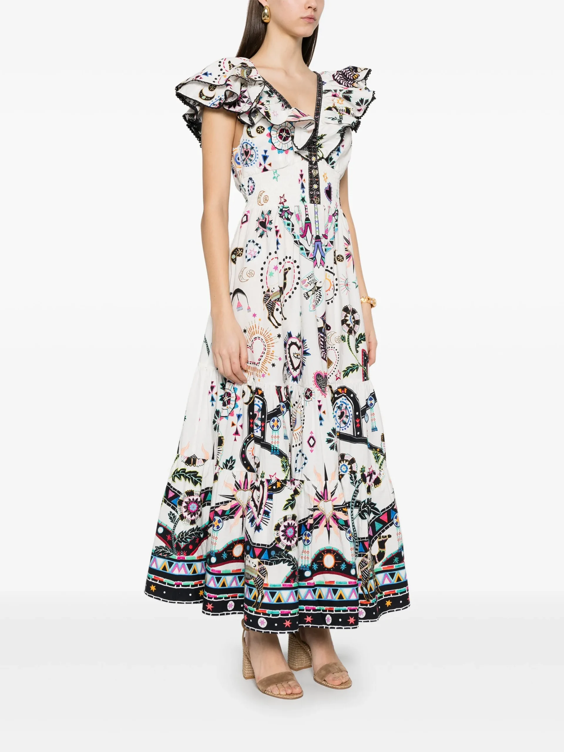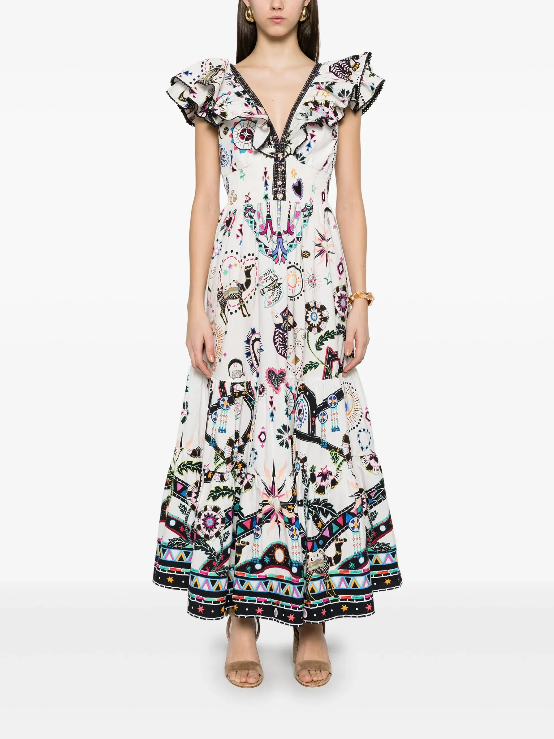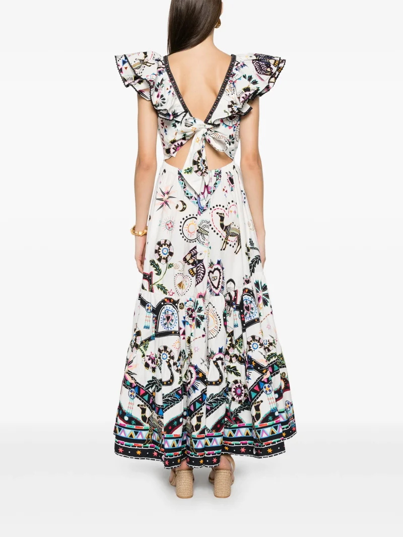 Rochie maxi Camilla Nubian Wonderland alba, inchidere cu nod la spate, nasturi frontali, , decolteu in V, imprimeu grafic pe intreaga suprafata. Potrivita pentru sezonul primavara/vara.100% bumbac